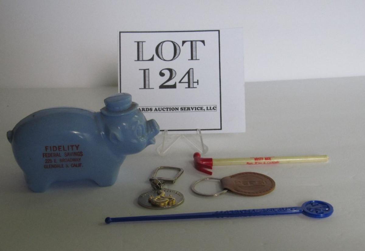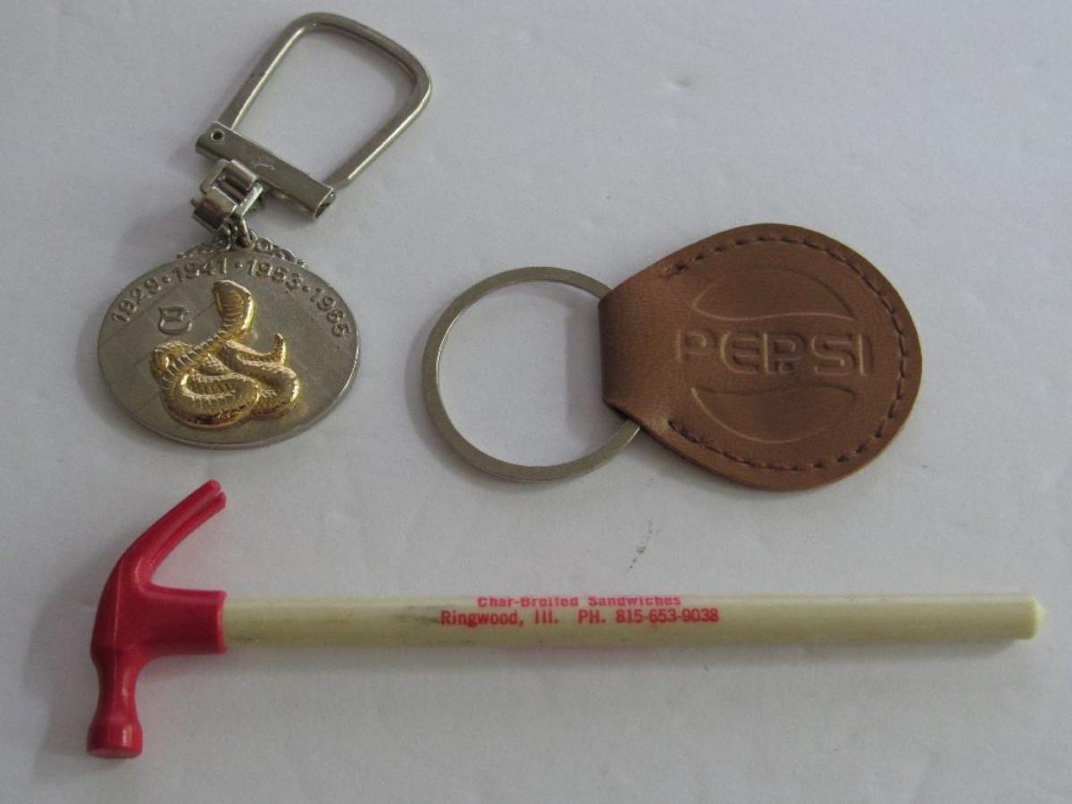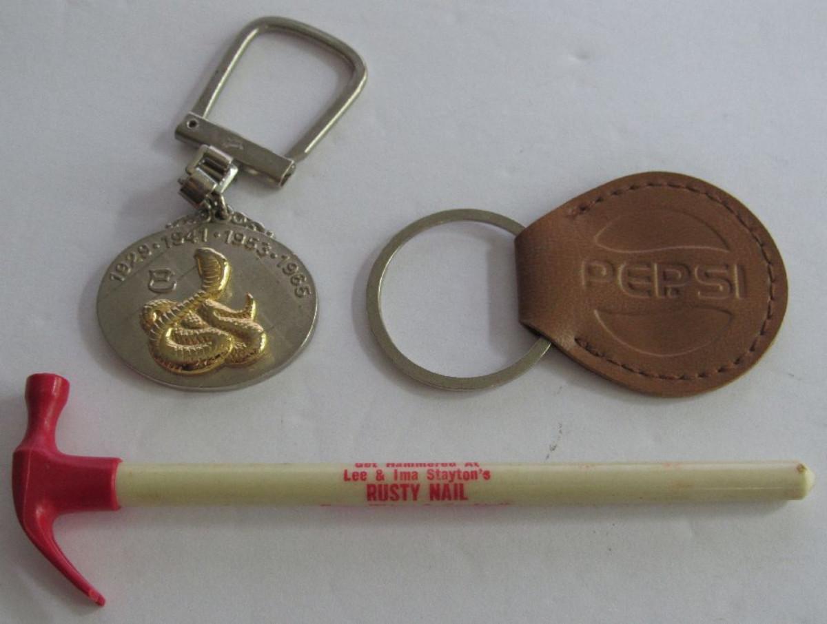 Fidelity Savings hard plastic bank, Rusty Nail Hammer pen, leather Pepsi key ring, 1965 Year of the Snake key ring. All in good shape. Shipping is available at shipping cost plus $5.00 handling fee on one box, $10.00 handling fee on two boxes, $15.00 handling fee on 3 boxes. Helps cover shipping materials and labor cost.