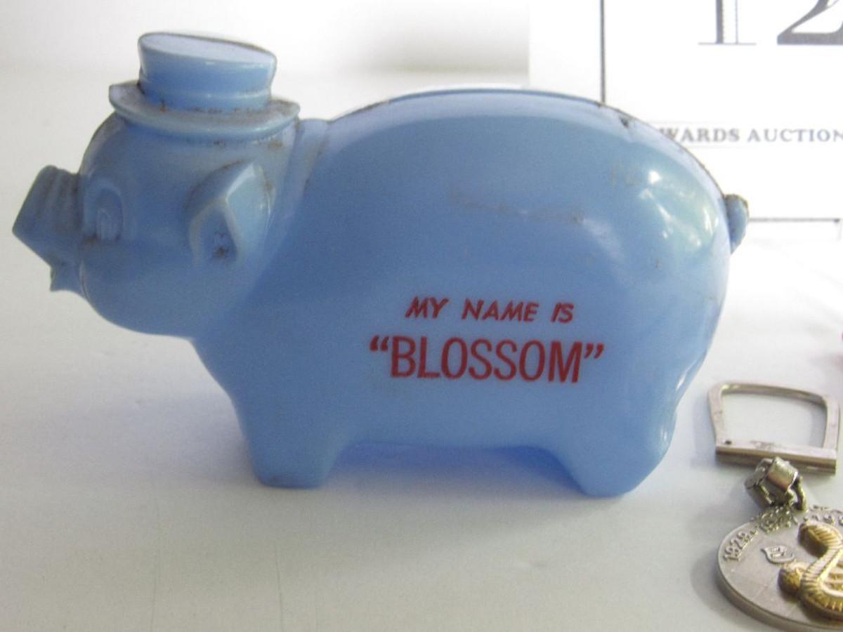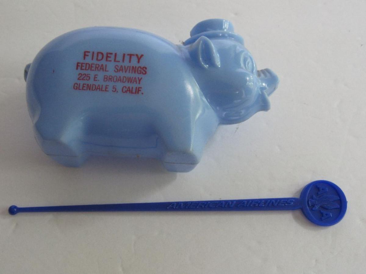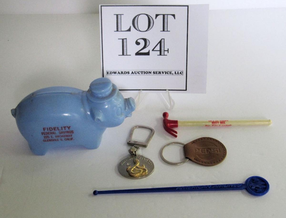 Fidelity Savings hard plastic bank, Rusty Nail Hammer pen, leather Pepsi key ring, 1965 Year of the Snake key ring. All in good shape. Shipping is available at shipping cost plus $5.00 handling fee on one box, $10.00 handling fee on two boxes, $15.00 handling fee on 3 boxes. Helps cover shipping materials and labor cost.