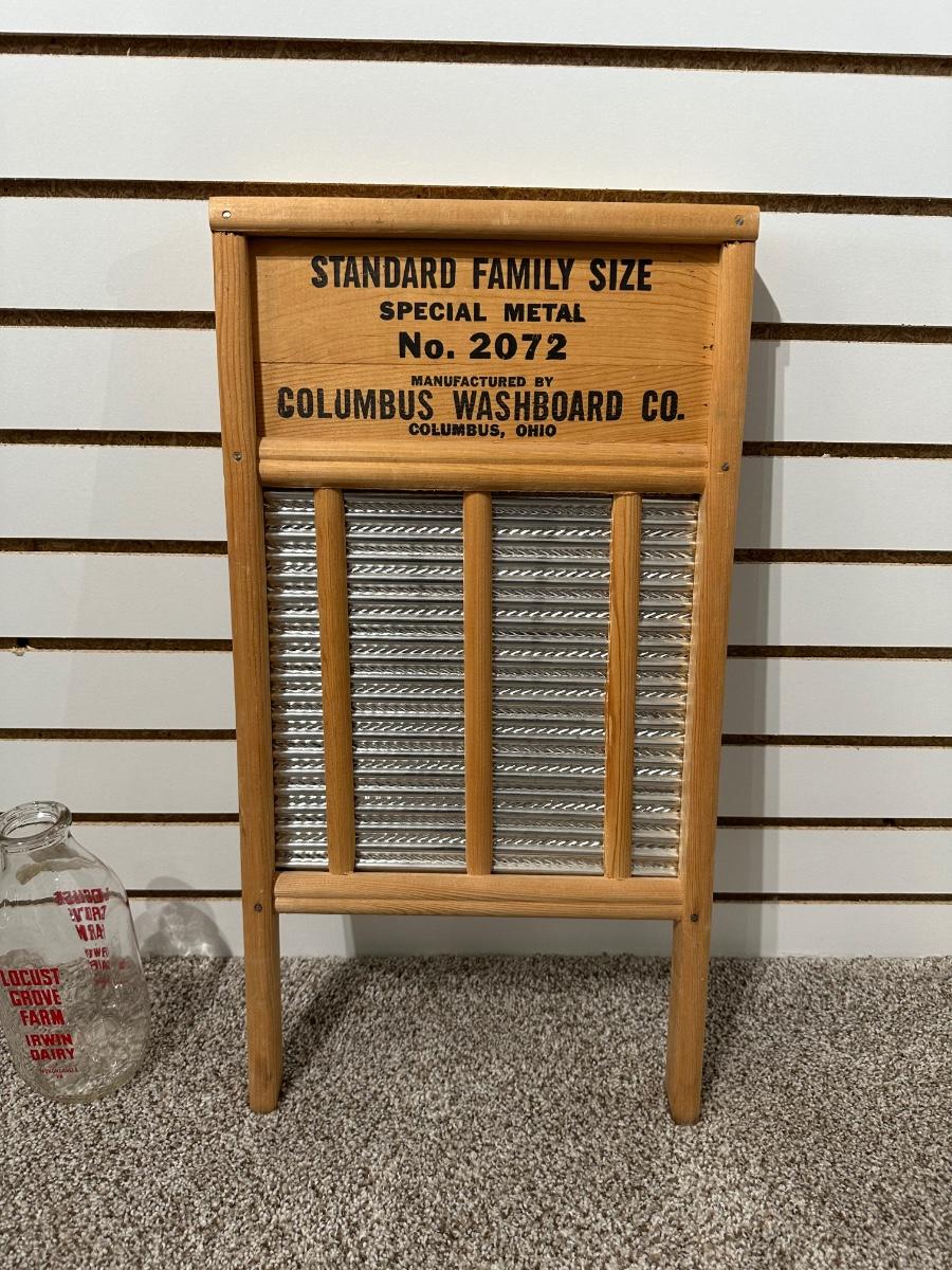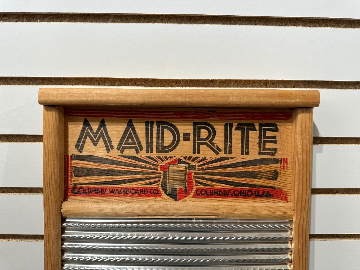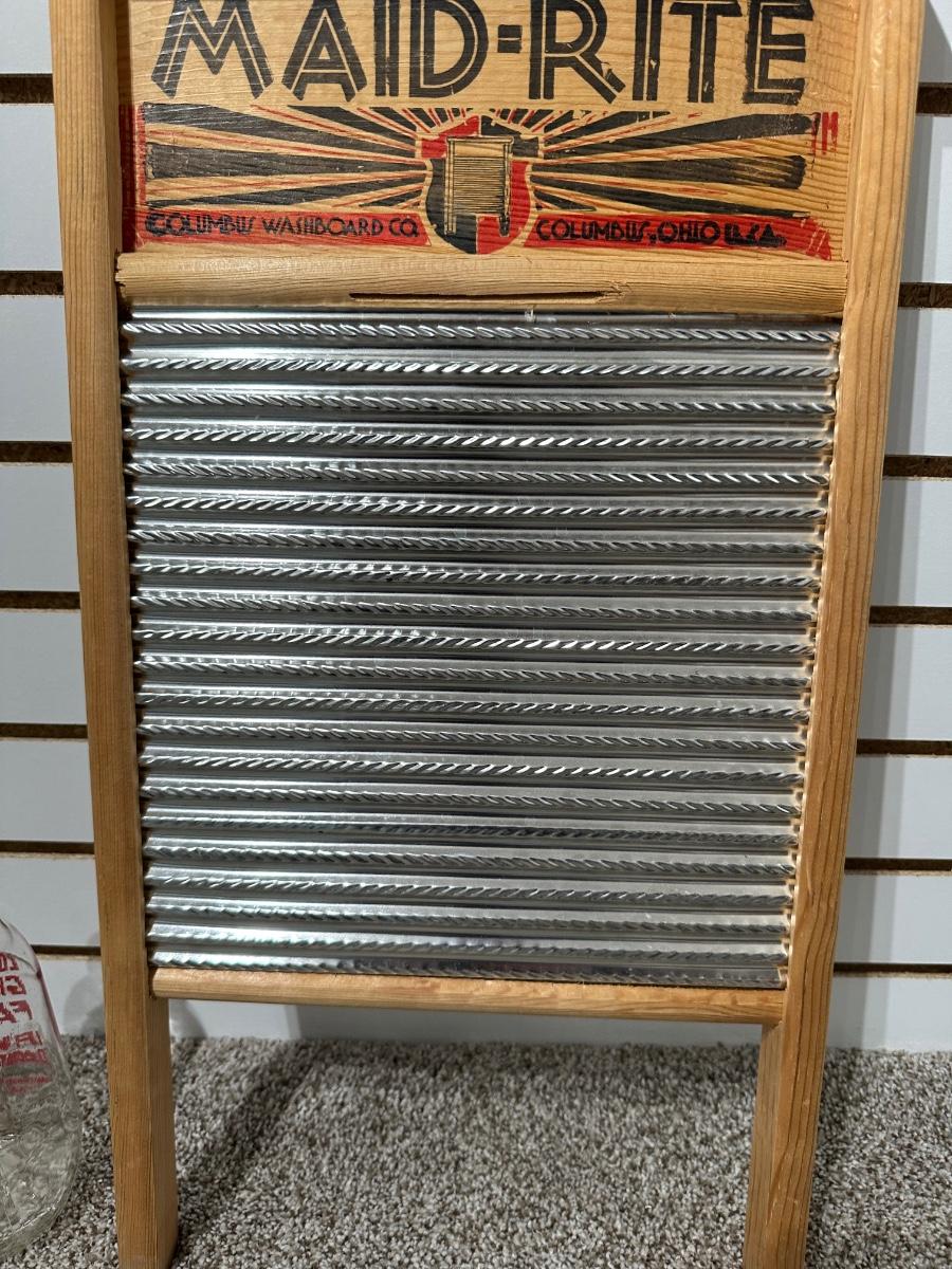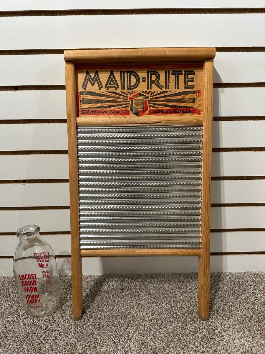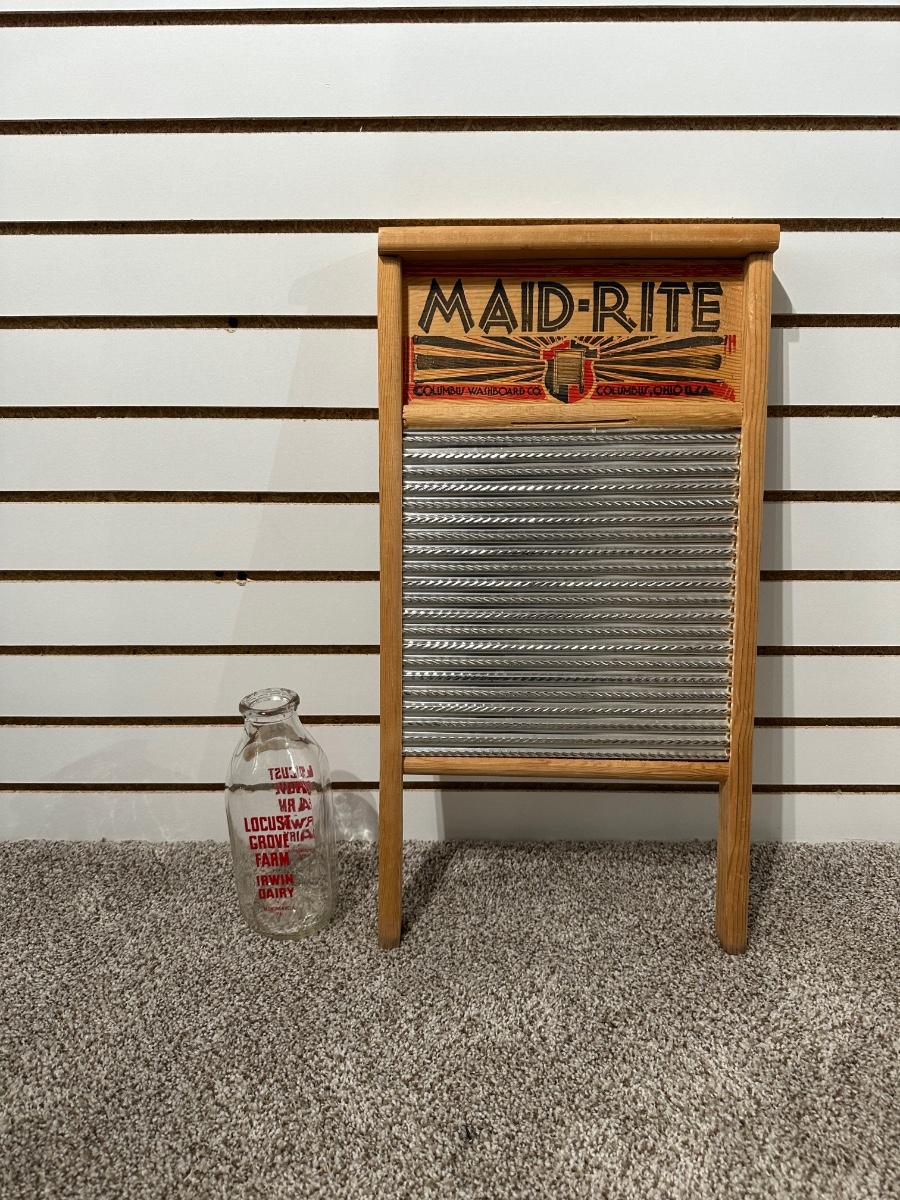 MAID-RITE WASHBOARD AND GLASS MILK BOTTLE
