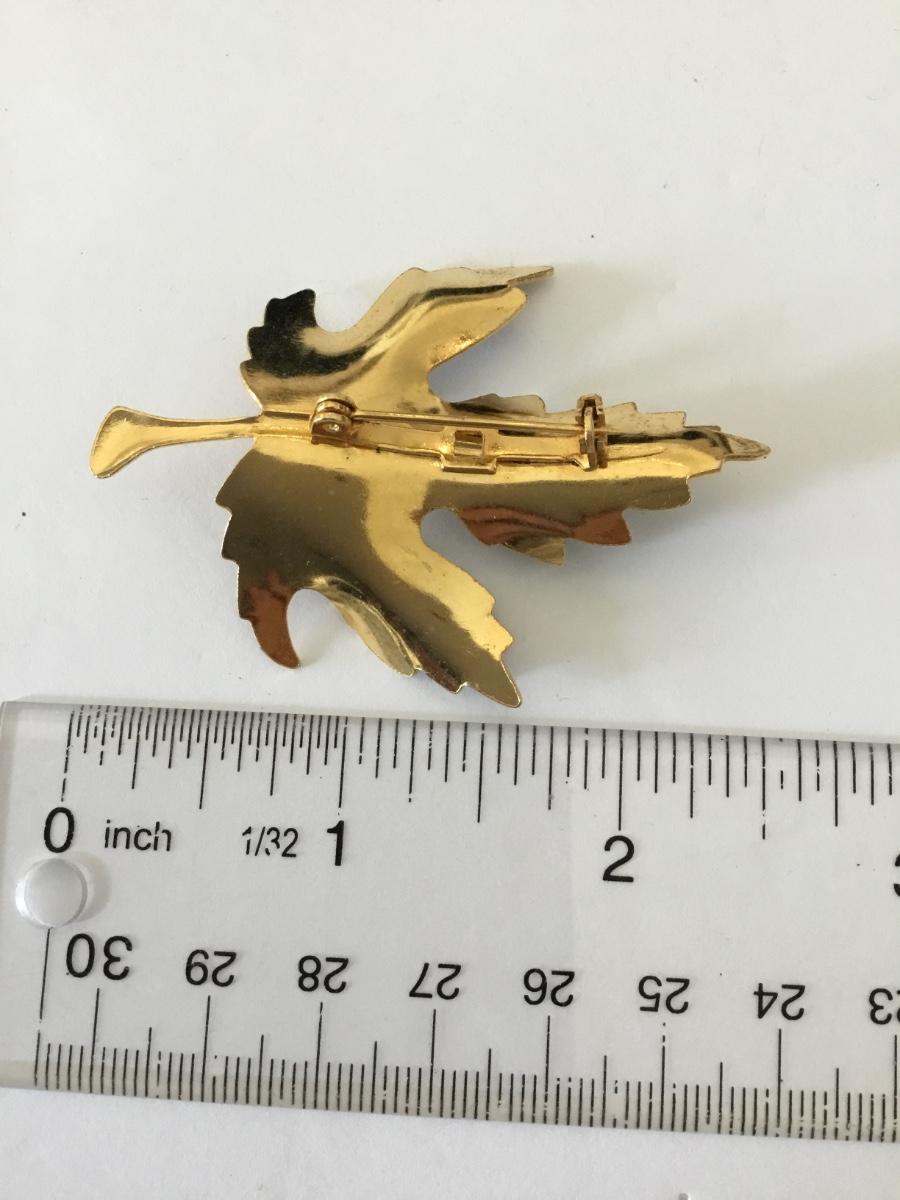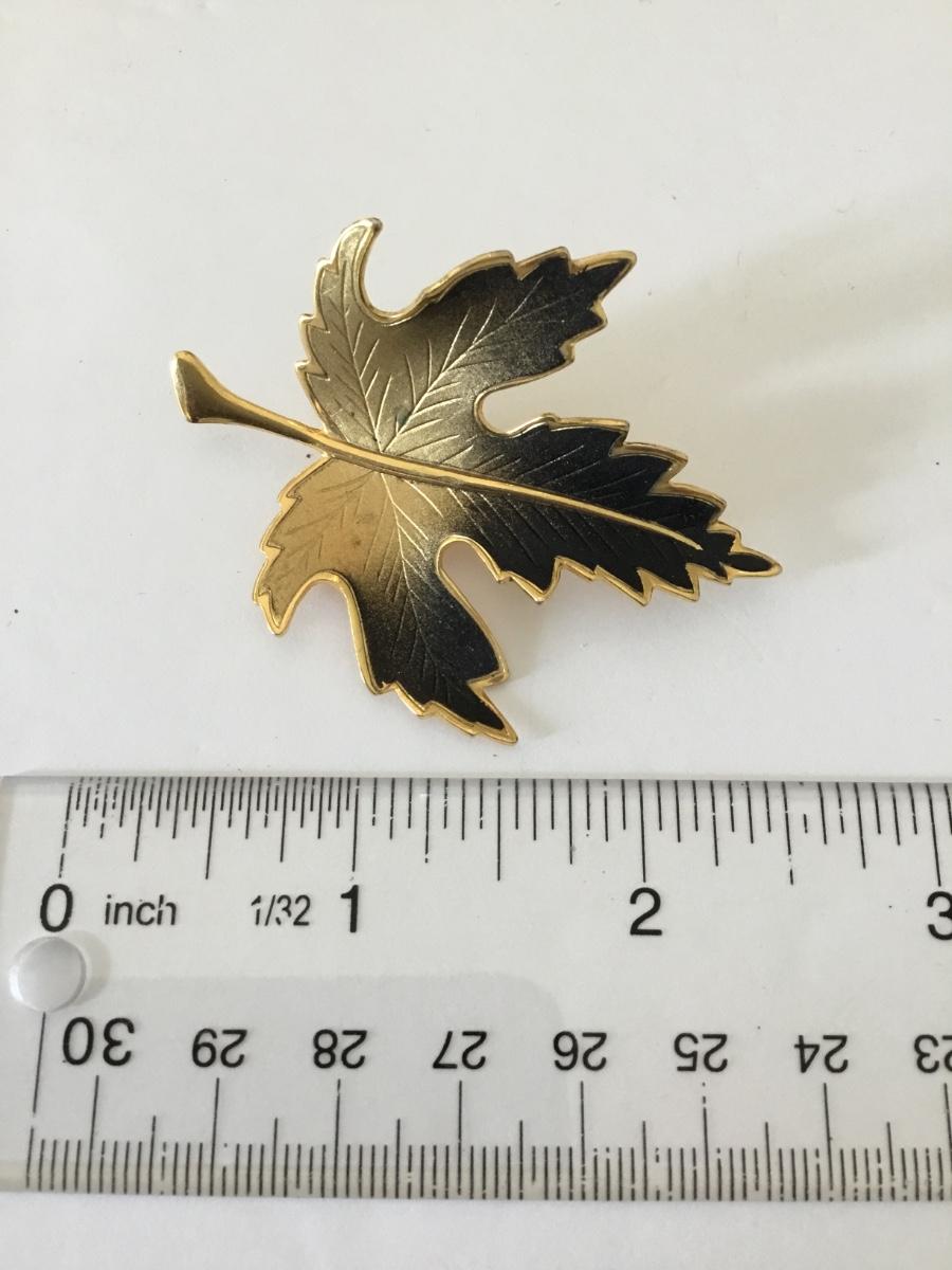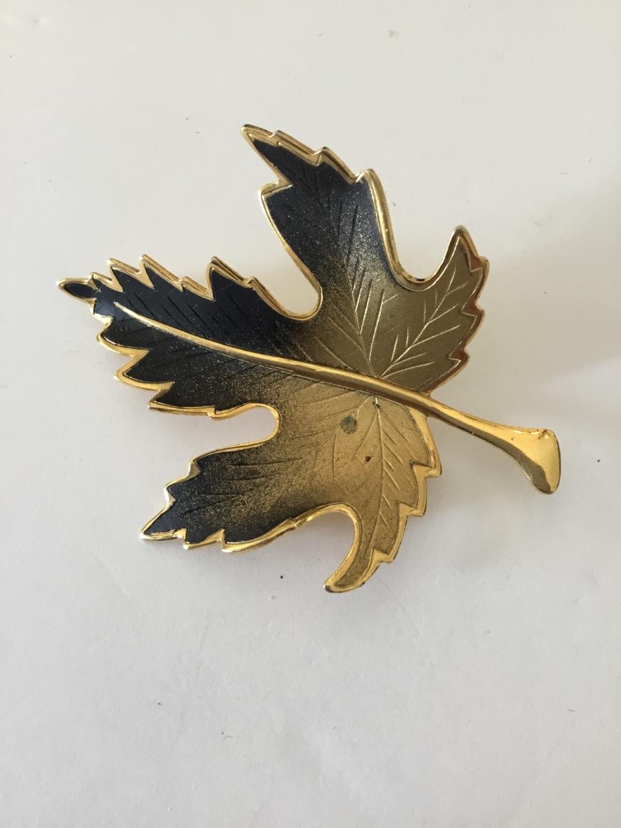 Maple leaf brooch, black and gold 1970s brooch