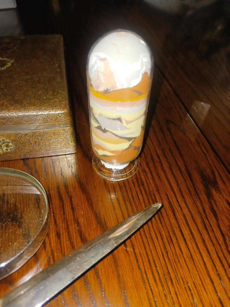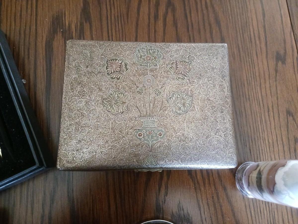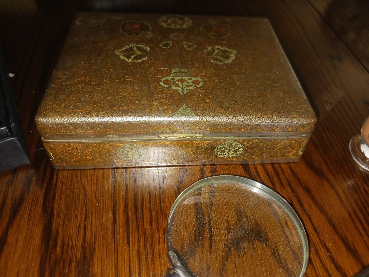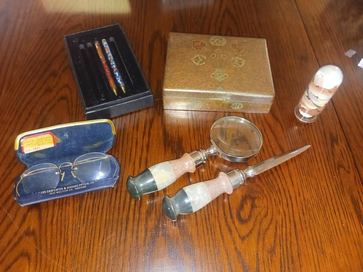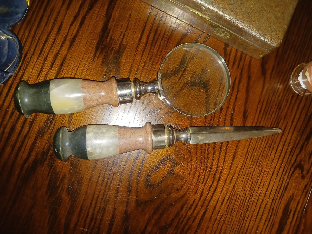 MARBLE HANDLED MAGNIFYING GLASS AND LETTER OPENER, METAL BOX AND MORE