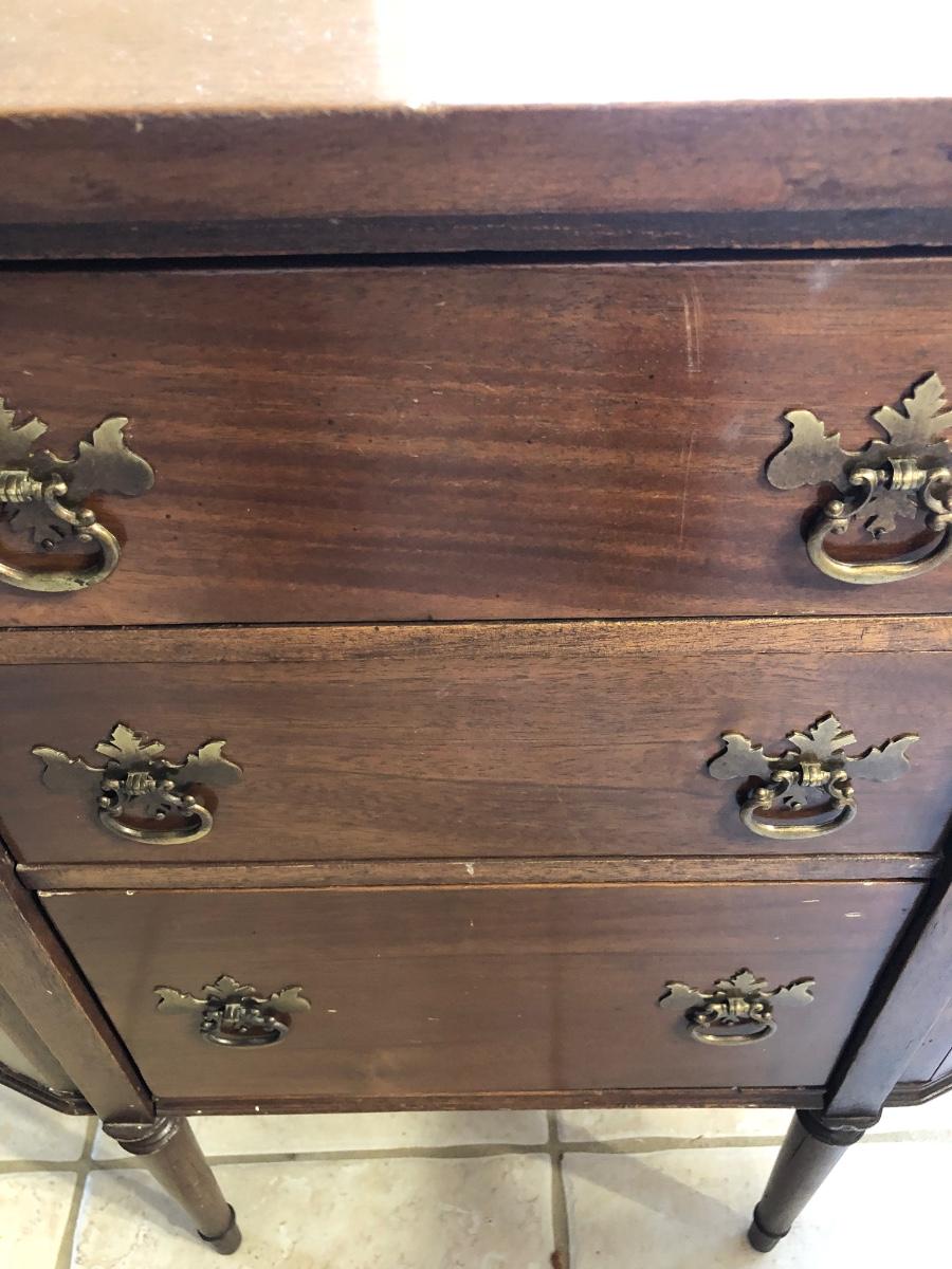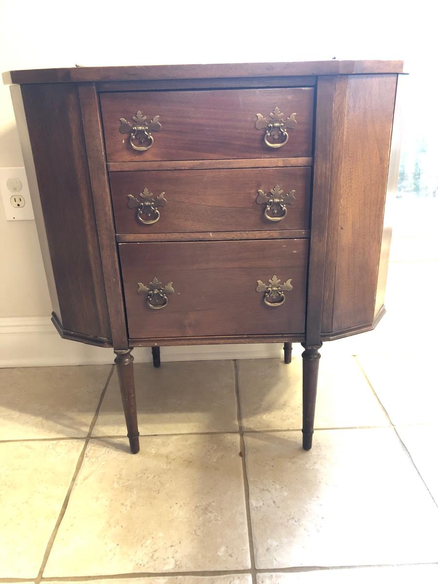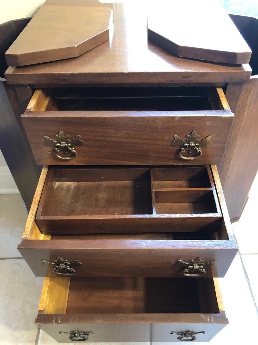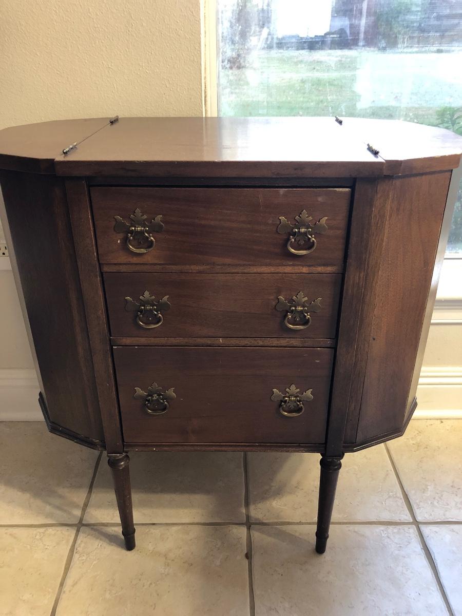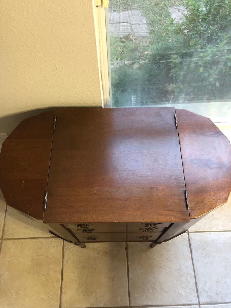 Unusual old cabinet, looks to be walnut wood, structurally sound. Has 3 working drawers with wood tray, top sides flip open. A few scratches, wear consistent with age. 27 in across, 14.5 deep and 28in tall.