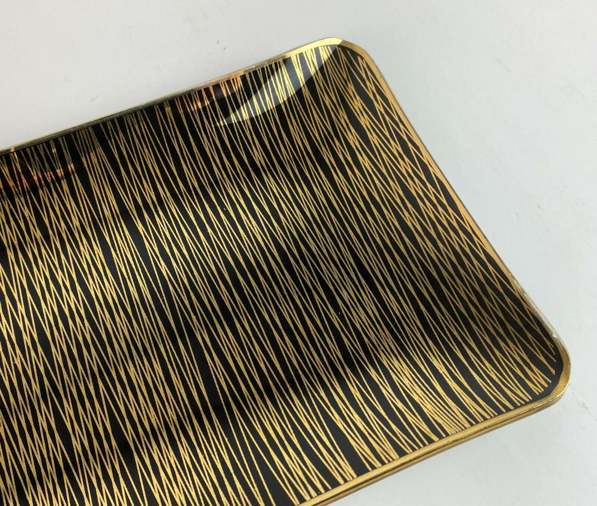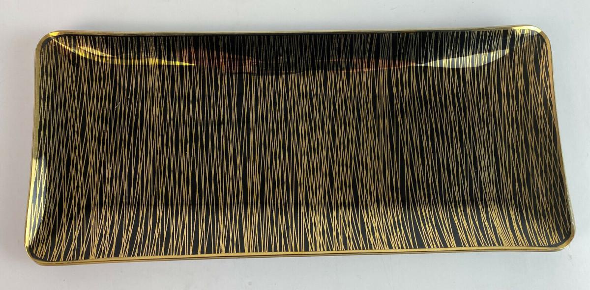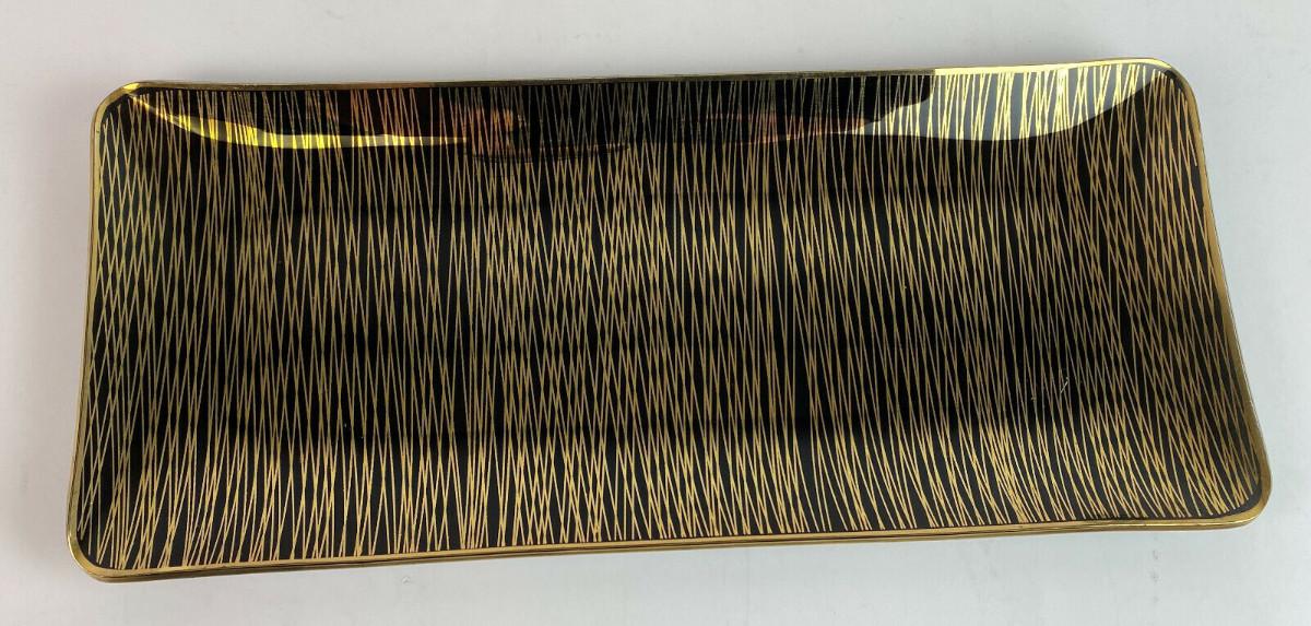 Here is a 13.25 x 6" long gold geometric accent tray...Mid Century Modern design...Unknown maker..Slight use wear.
