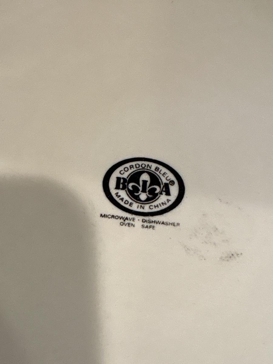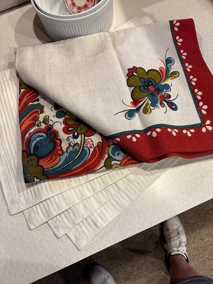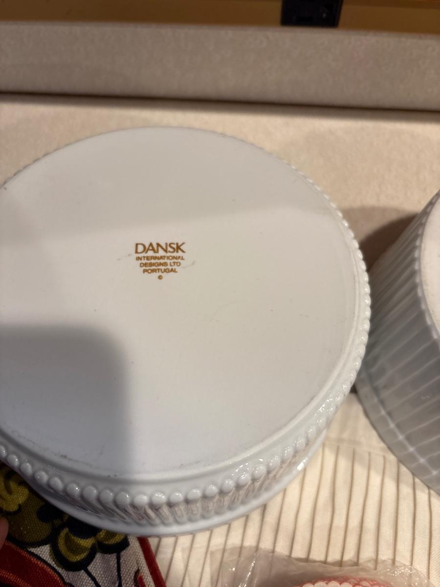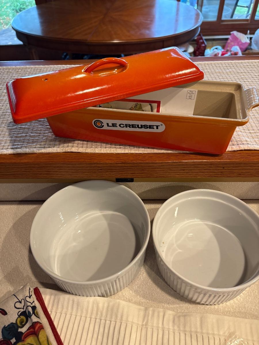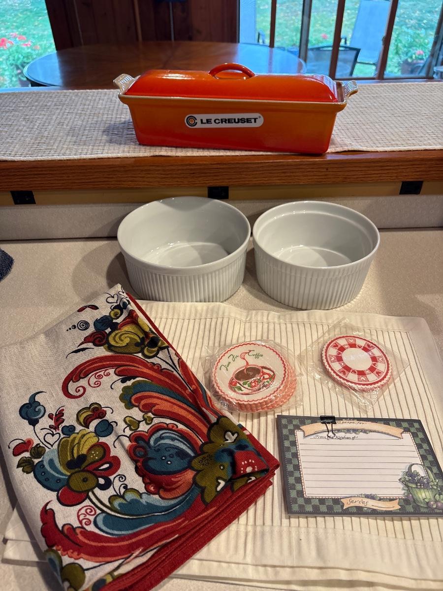 Tablecloth, 4 ivory placemats, Cordon Bleu and Dansk bowl. Le Creuset has box