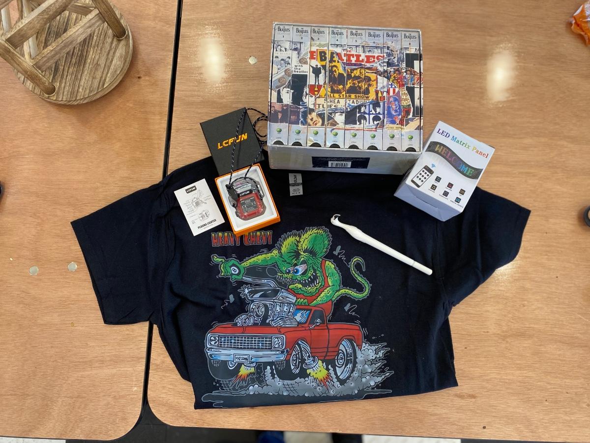 MED RAT FINK T-SHIRT, BEATLES ON VHS AND A VARIETY OF OTHER ITEMS