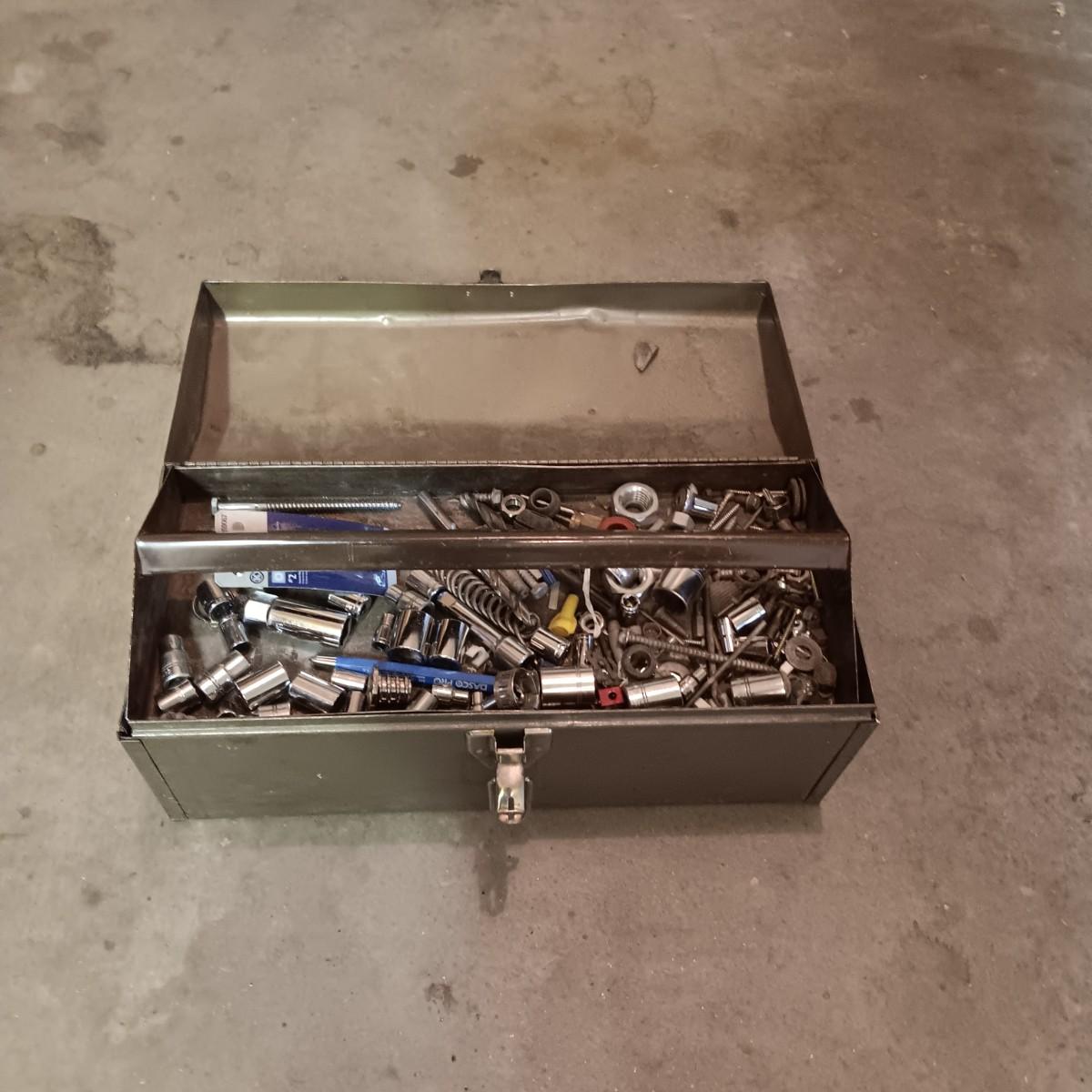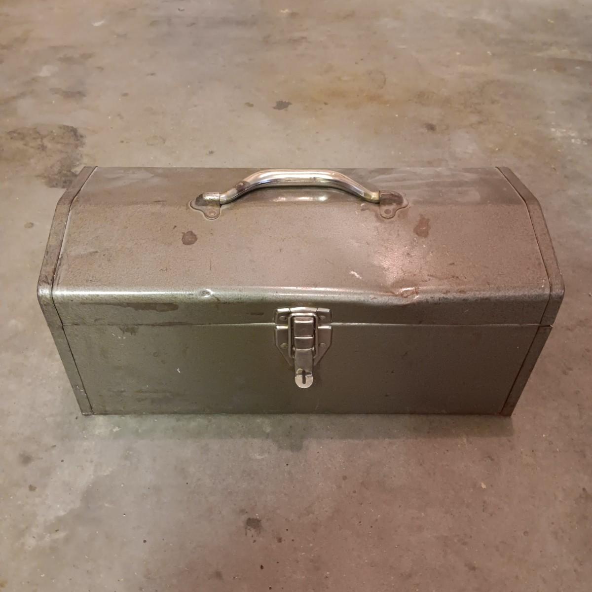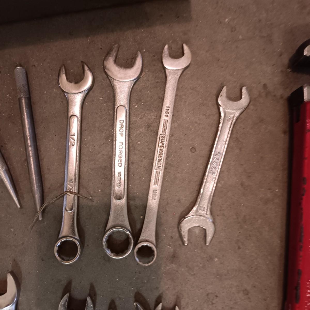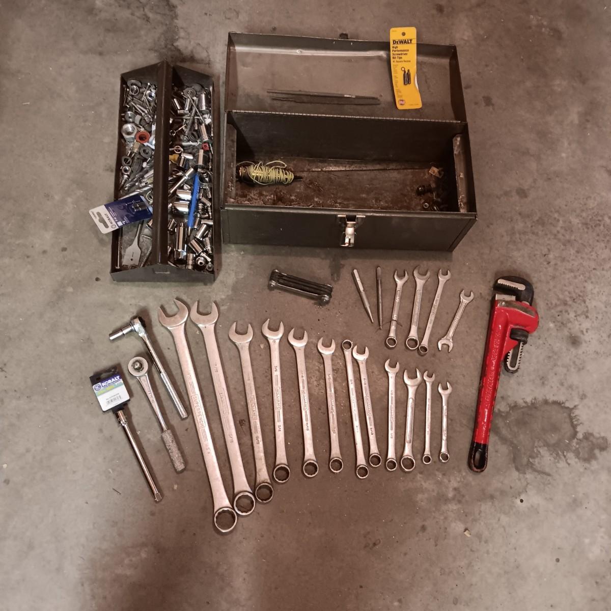 METAL TOOL BOX WITH SHELF AND A SET OF COMBINATION WRENCHES AND MORE