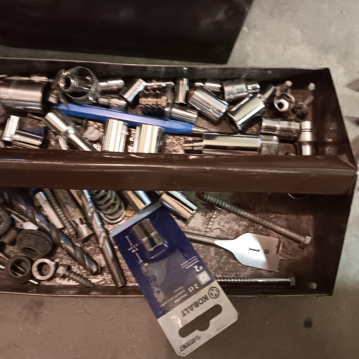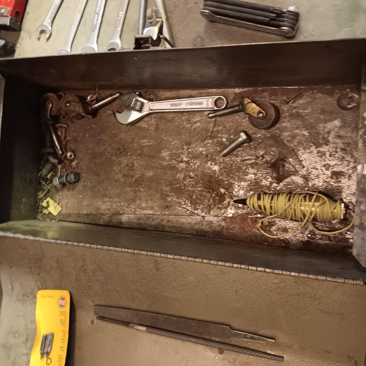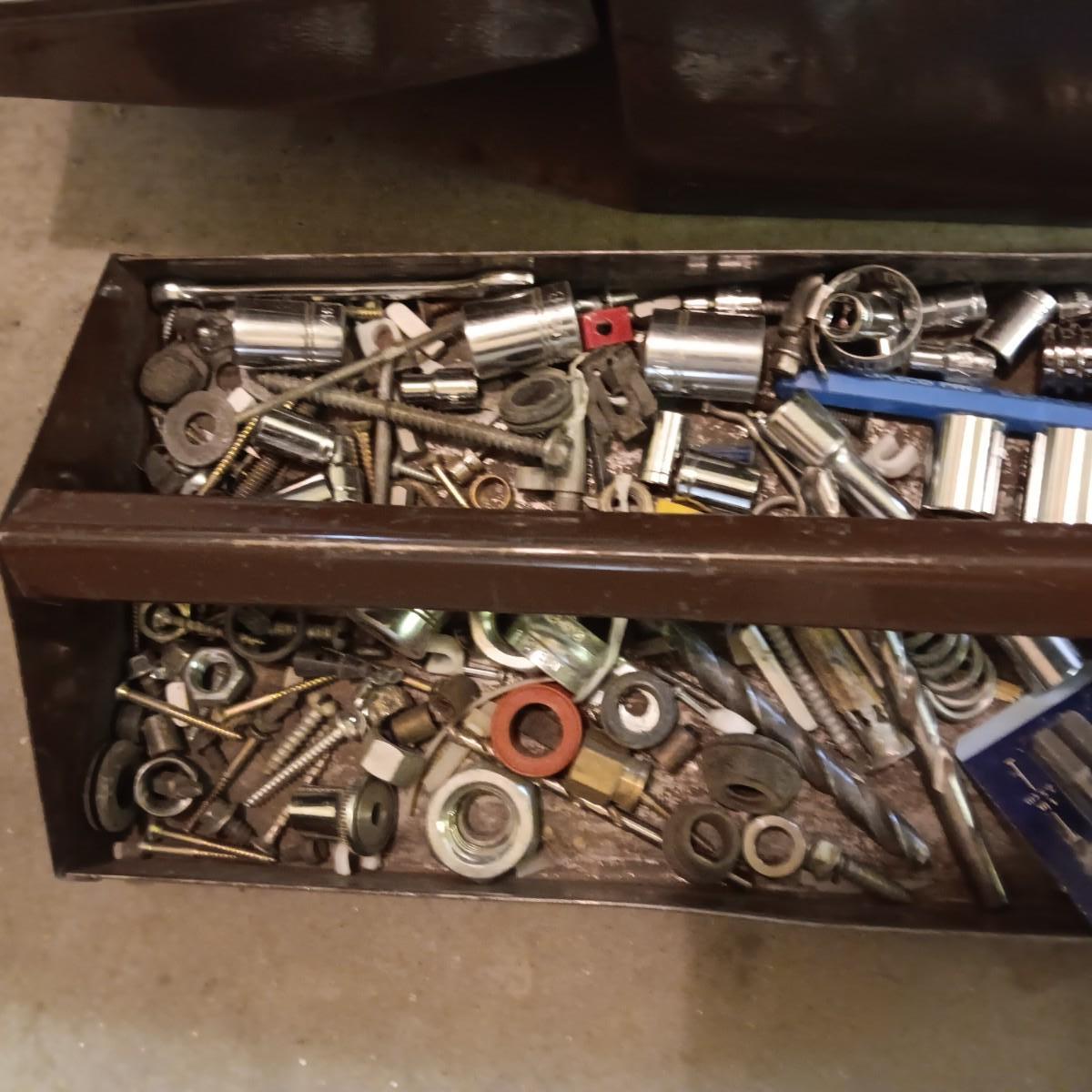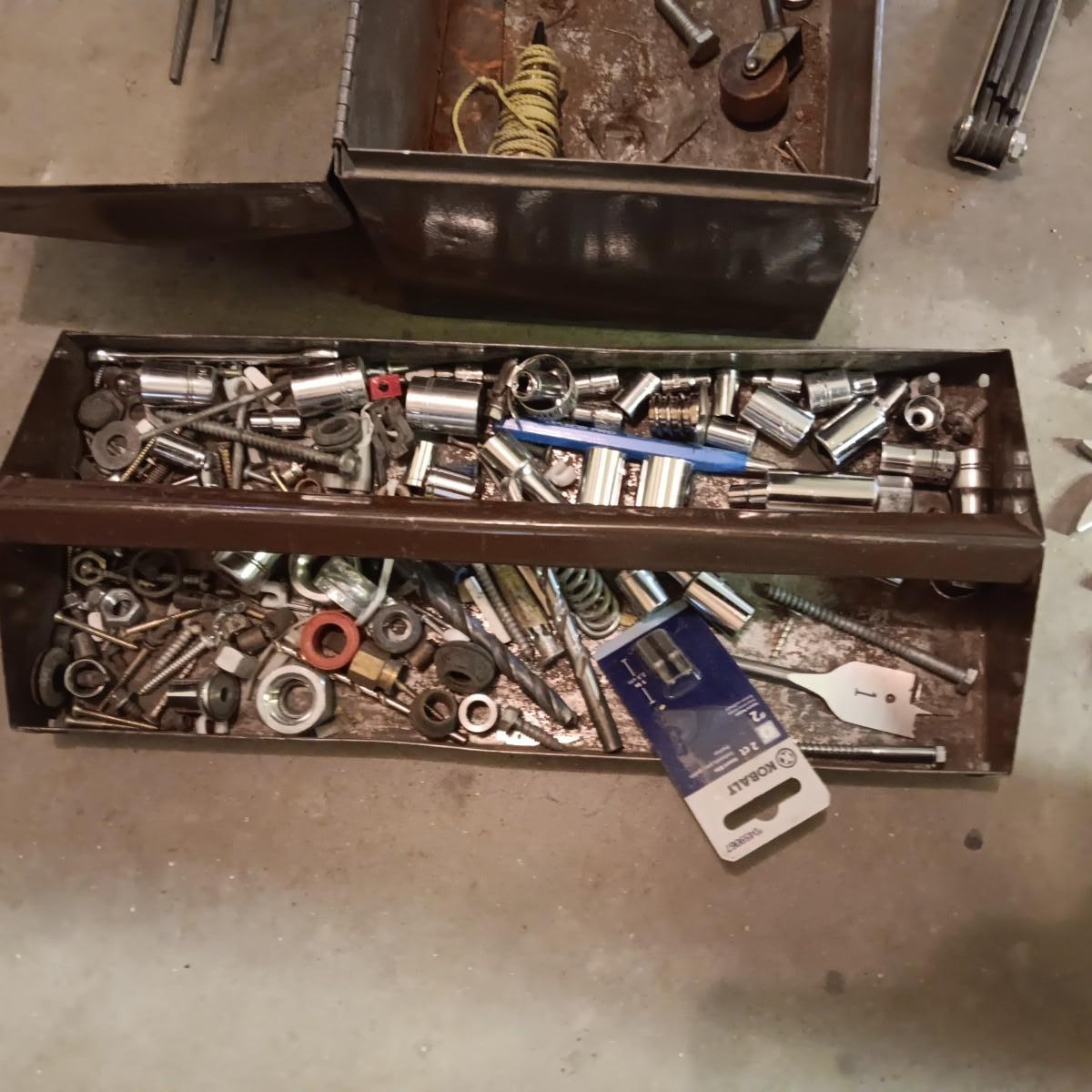 METAL TOOL BOX WITH SHELF AND A SET OF COMBINATION WRENCHES AND MORE
