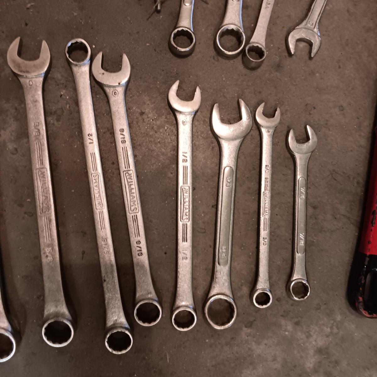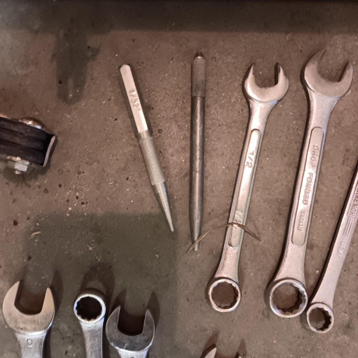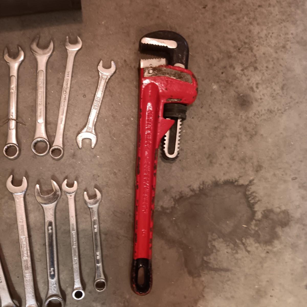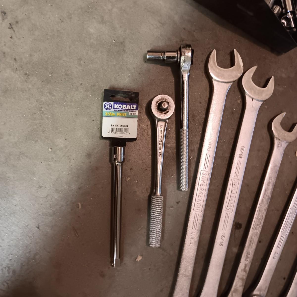 METAL TOOL BOX WITH SHELF AND A SET OF COMBINATION WRENCHES AND MORE