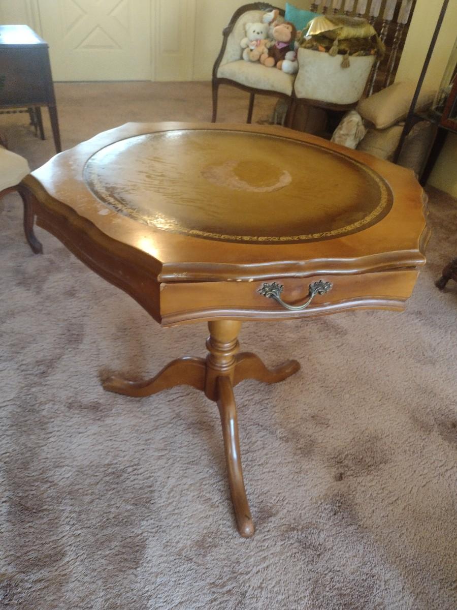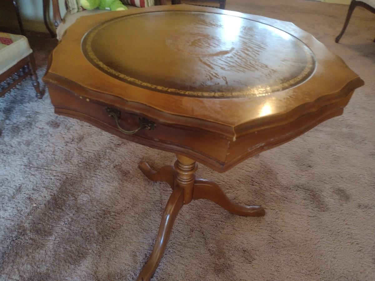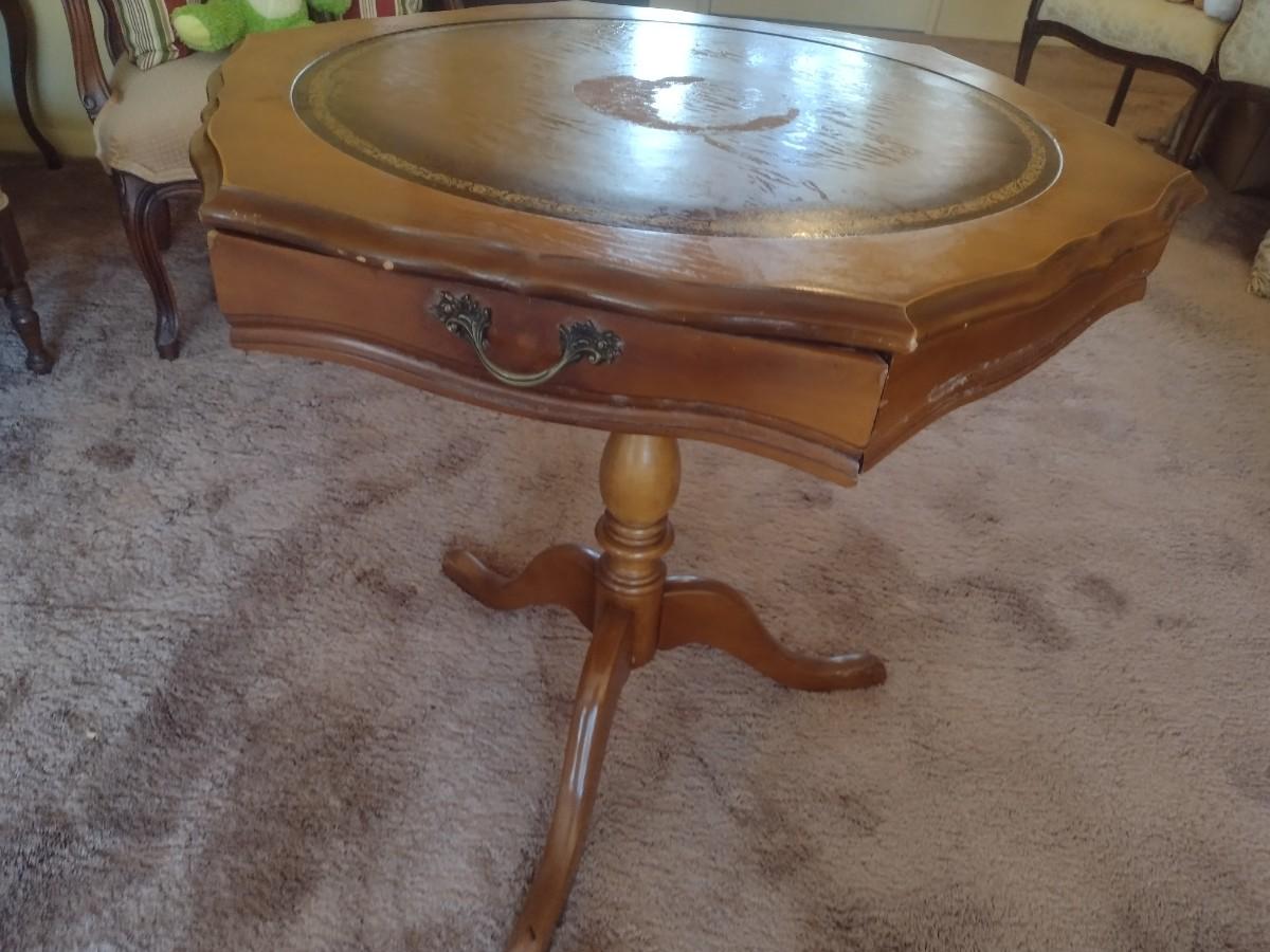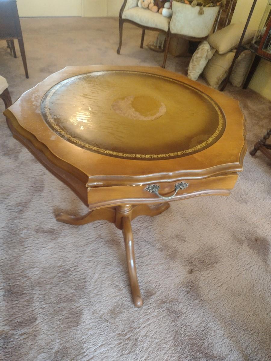 Mid Century Hexagonal Pedestal Side Table with Leather Inlay Top. Water spot on surface as shown