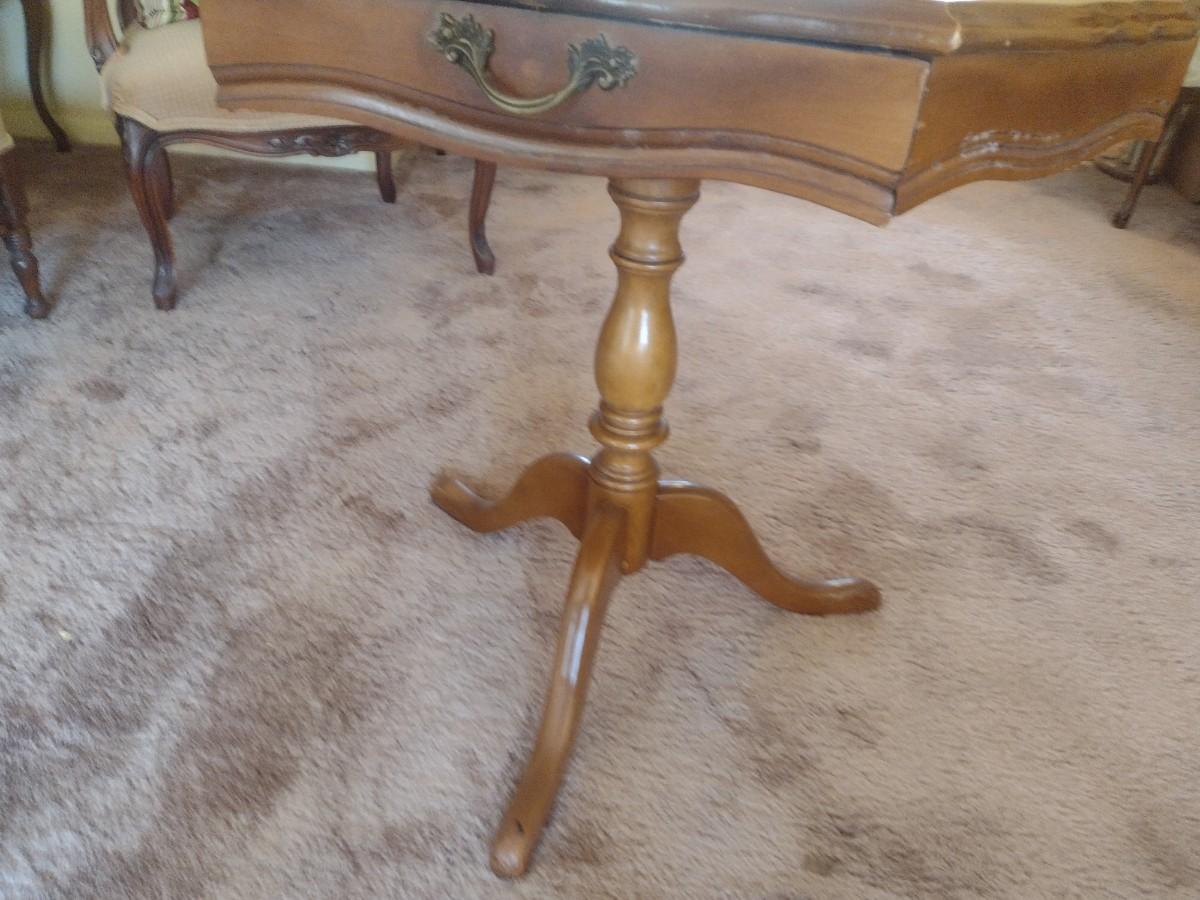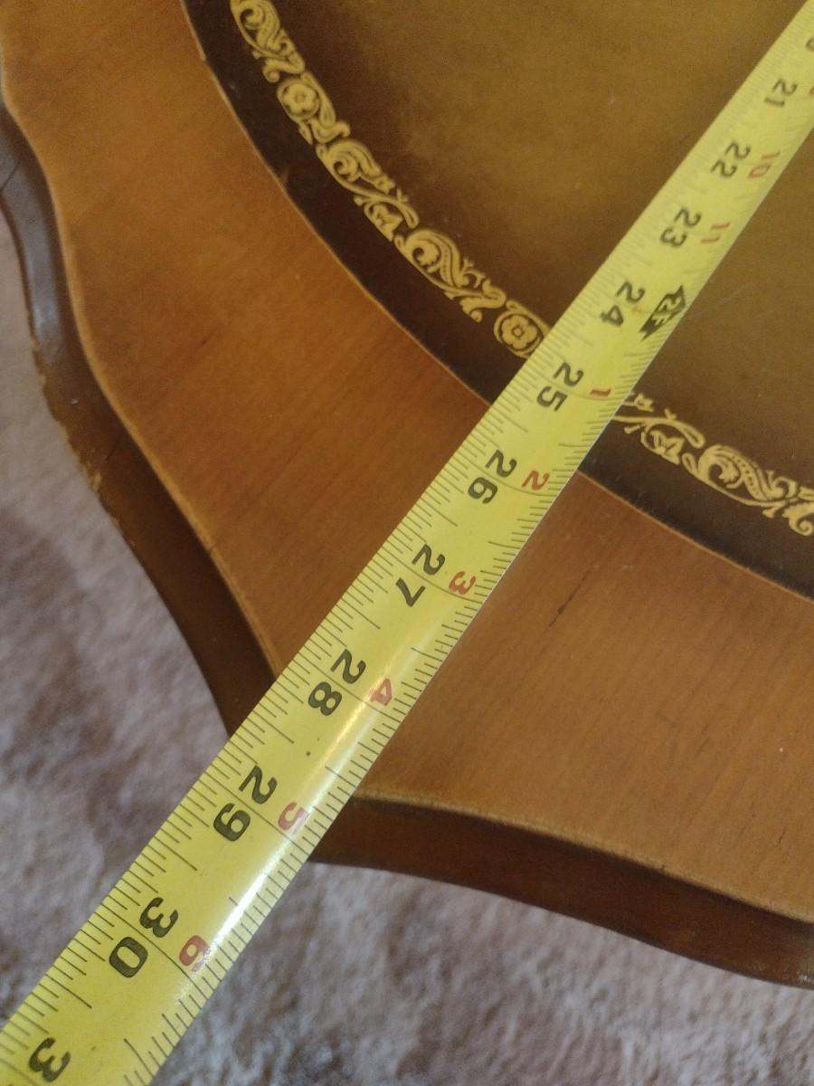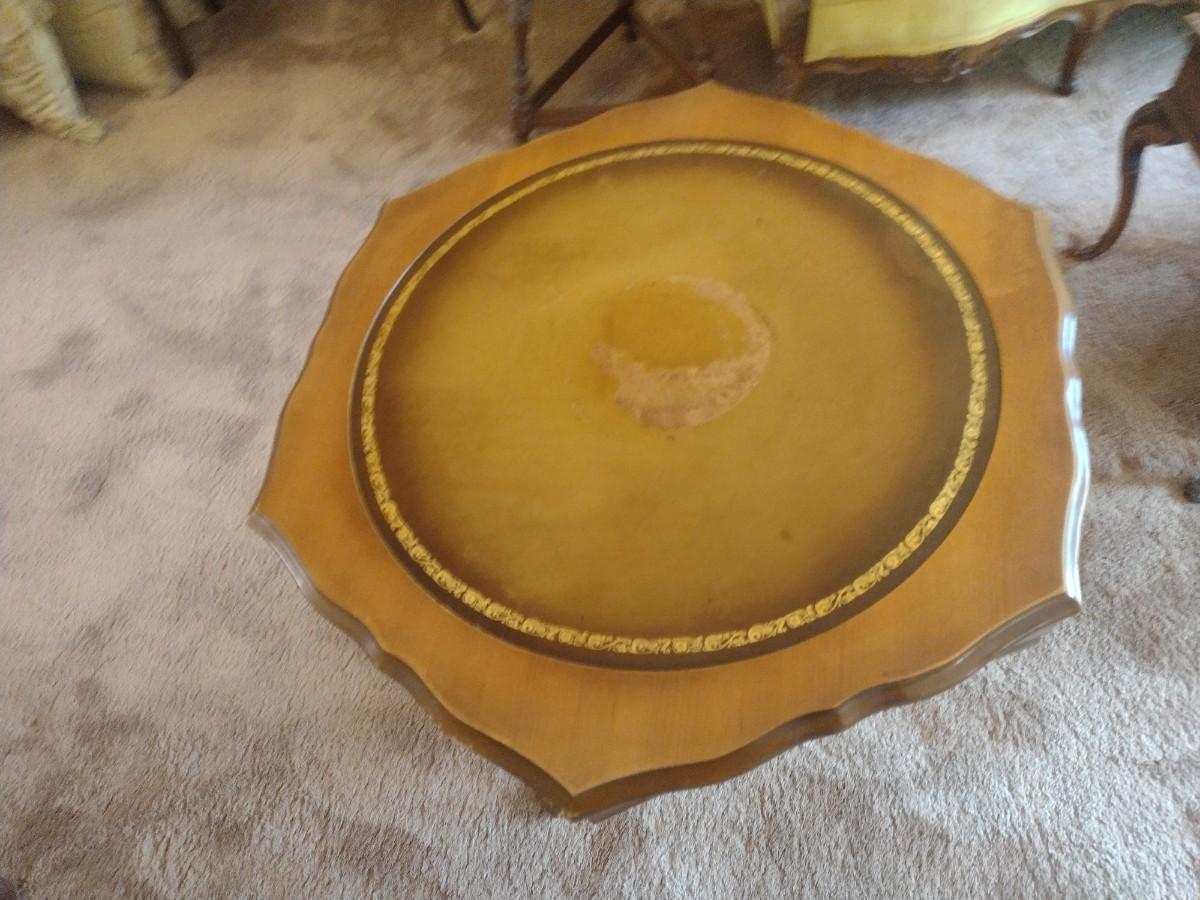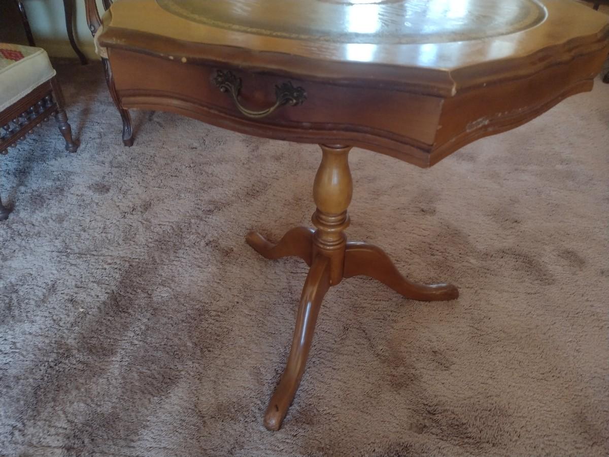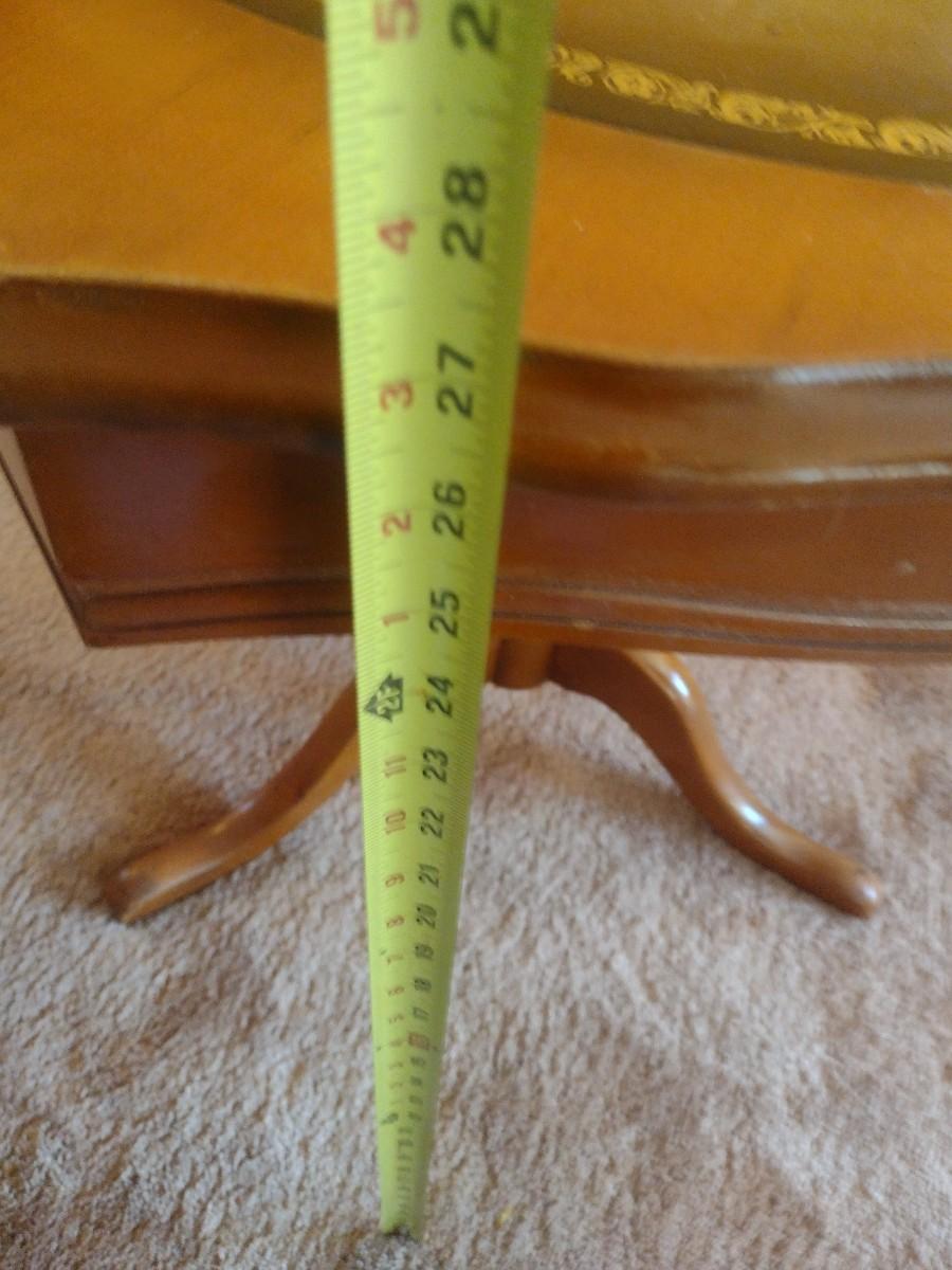 Mid Century Hexagonal Pedestal Side Table with Leather Inlay Top. Water spot on surface as shown