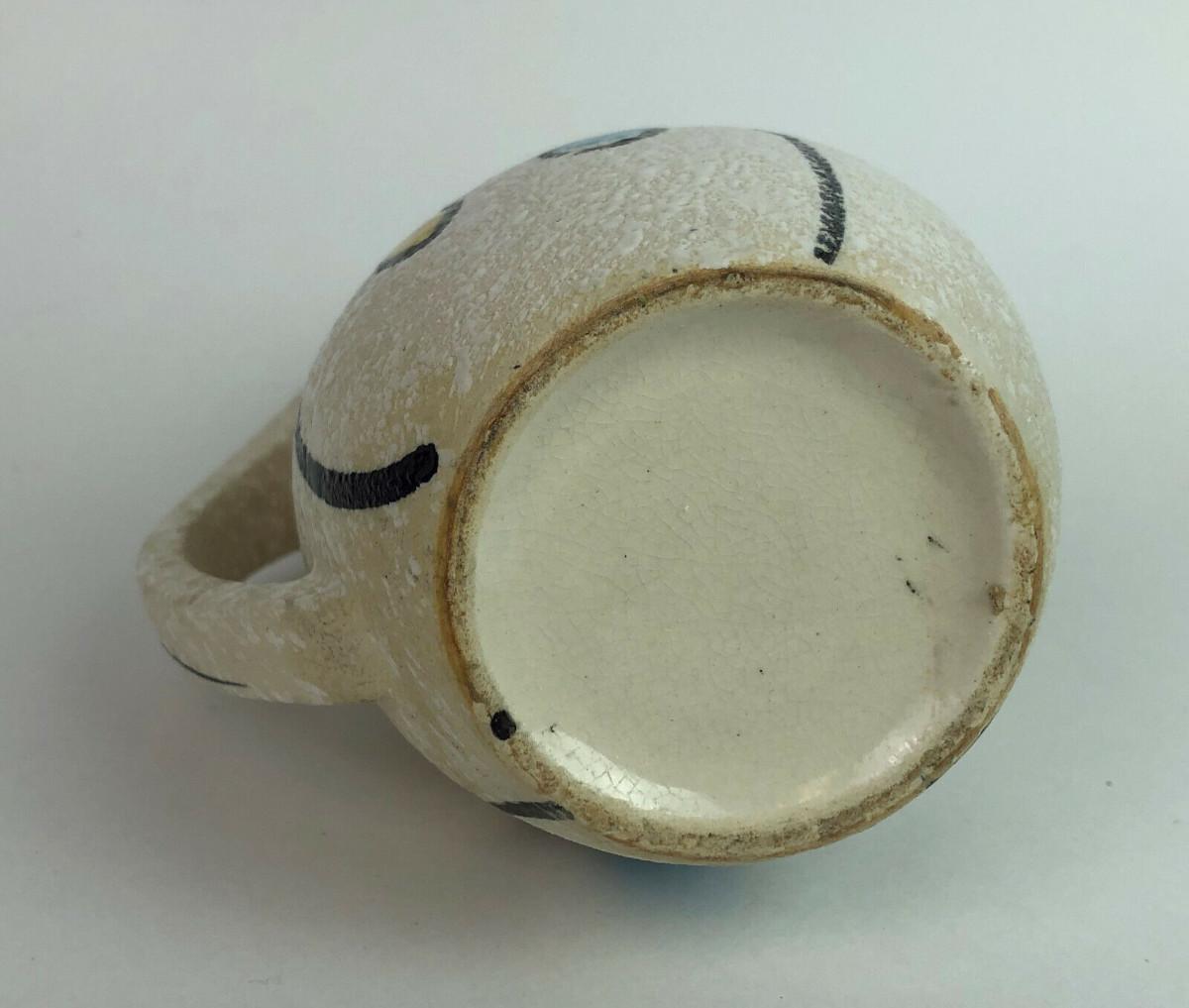 With a hand painted abstract pattern here is a small ceramic pitcher from the Mid Century...Unknown maker but fairly certain this 7 3/8" jug was made in Japan...Spackled finish...Circa 1950's-60's...The condition is good excepting one flake from the underside of the lip(pictured).