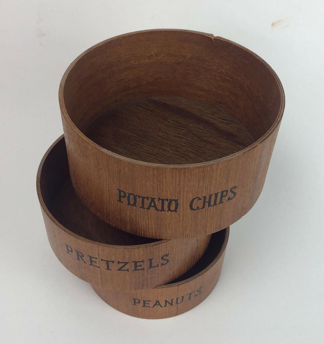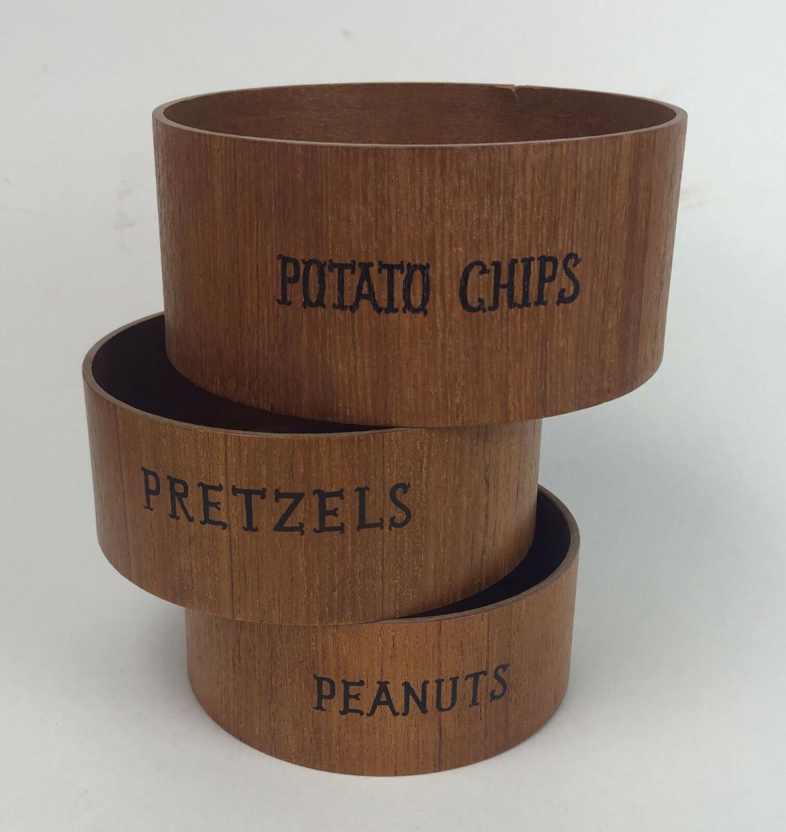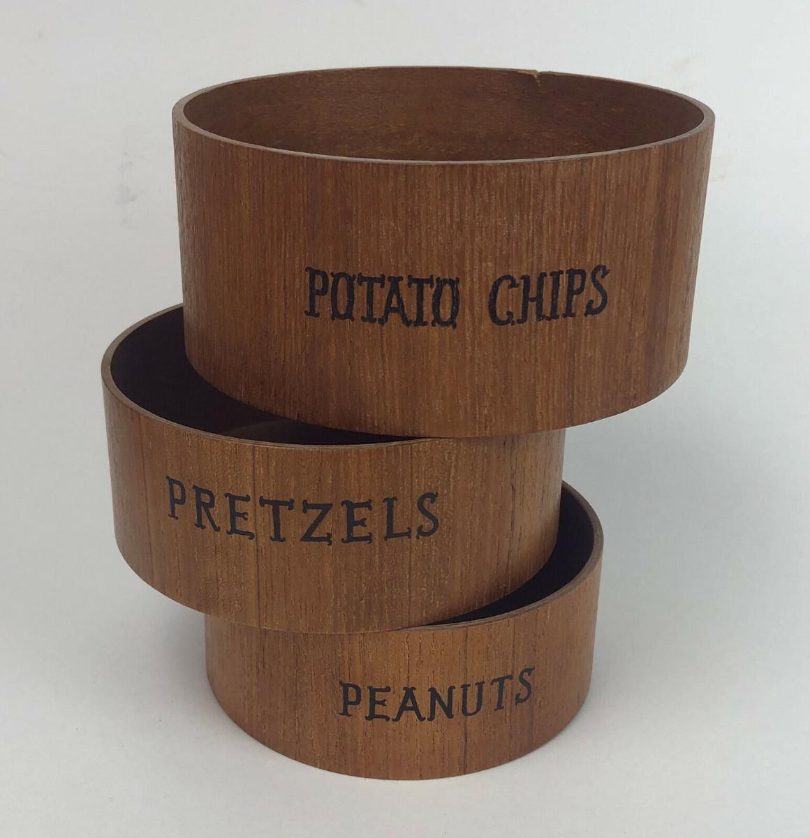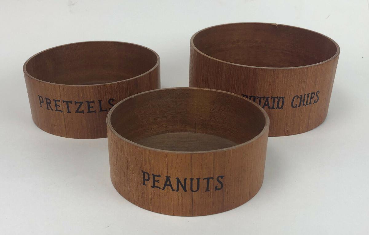 Here is a teak wood Snack Set circa 1960's...Japanese import...Danish style...the bowls measure 5"..5.5..6"...PEANUTS-PRETZELS-POTATO CHIPS...As shown..Only one has a chink on the rim(pictured)...Normal use...Good condition.