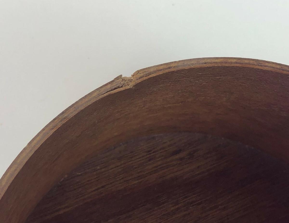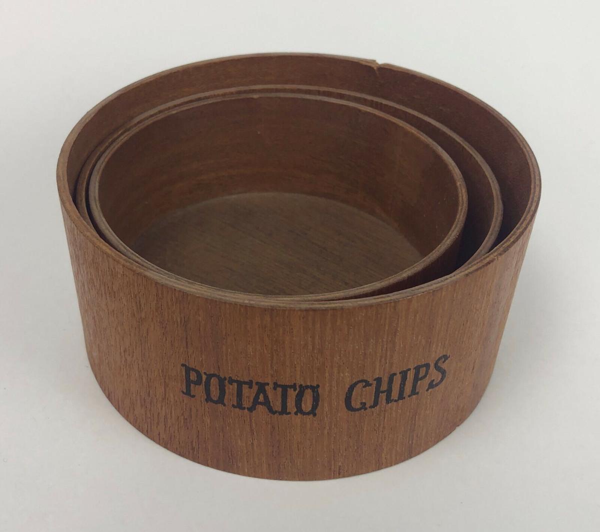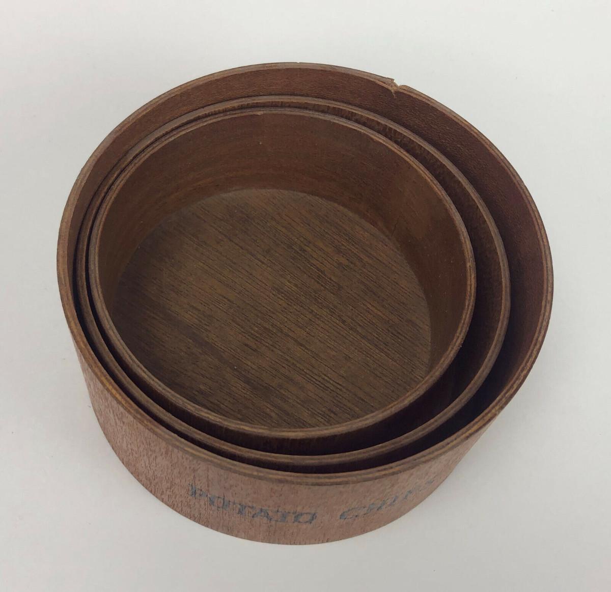 Here is a teak wood Snack Set circa 1960's...Japanese import...Danish style...the bowls measure 5"..5.5..6"...PEANUTS-PRETZELS-POTATO CHIPS...As shown..Only one has a chink on the rim(pictured)...Normal use...Good condition.