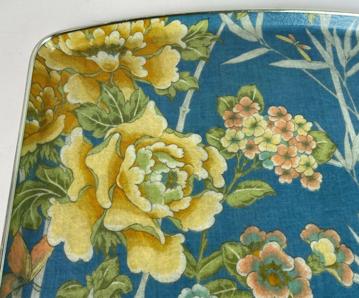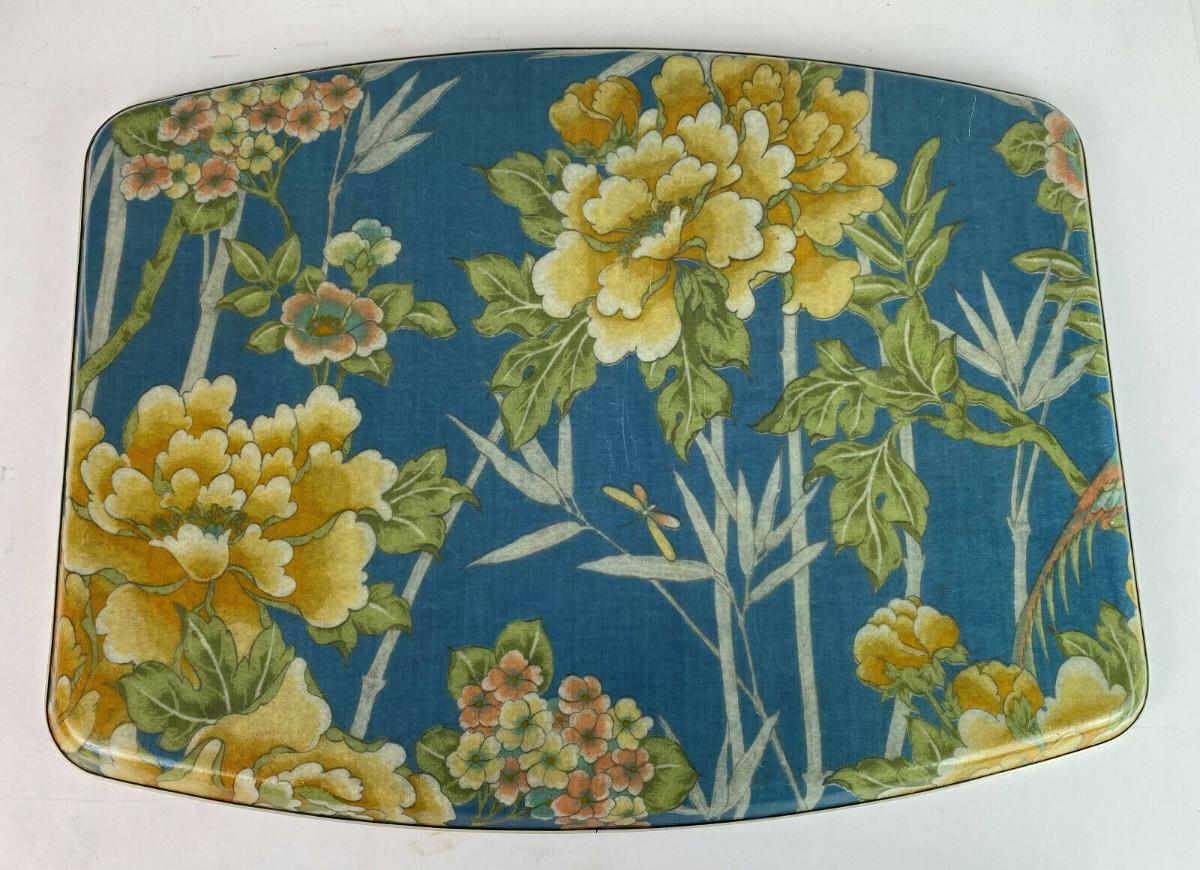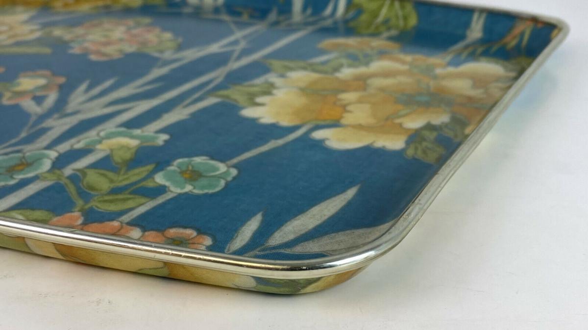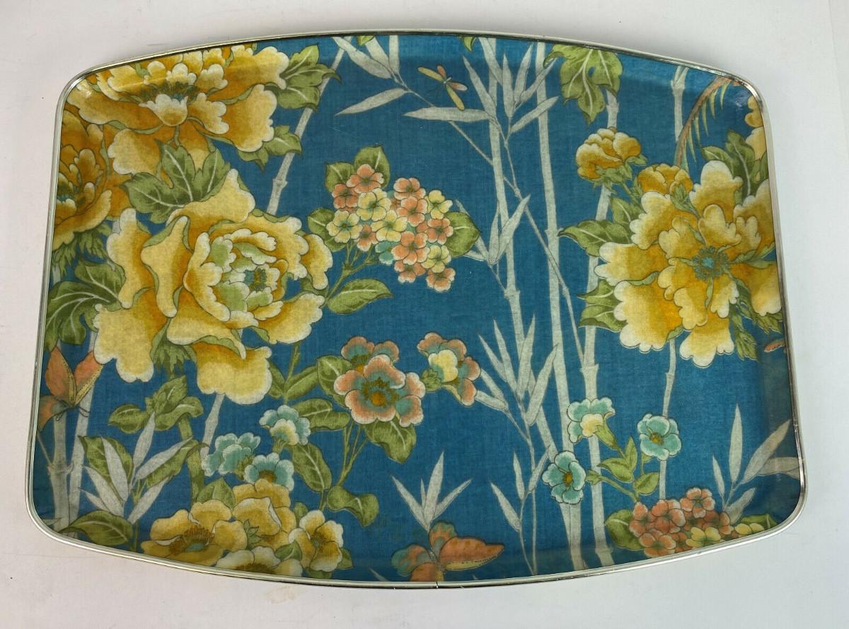 Here is a large vintage 21 x 16" serving tray with an Asian floral and bamboo motif..Laminated..metal trim...Alcohol-proof I believe...Mid Century...Light normal use..Good condition...The scene continues on the back.