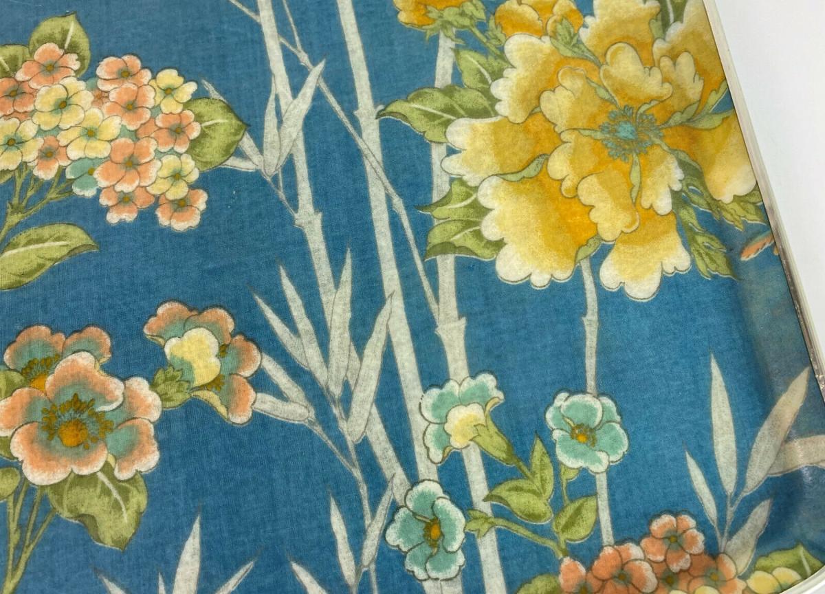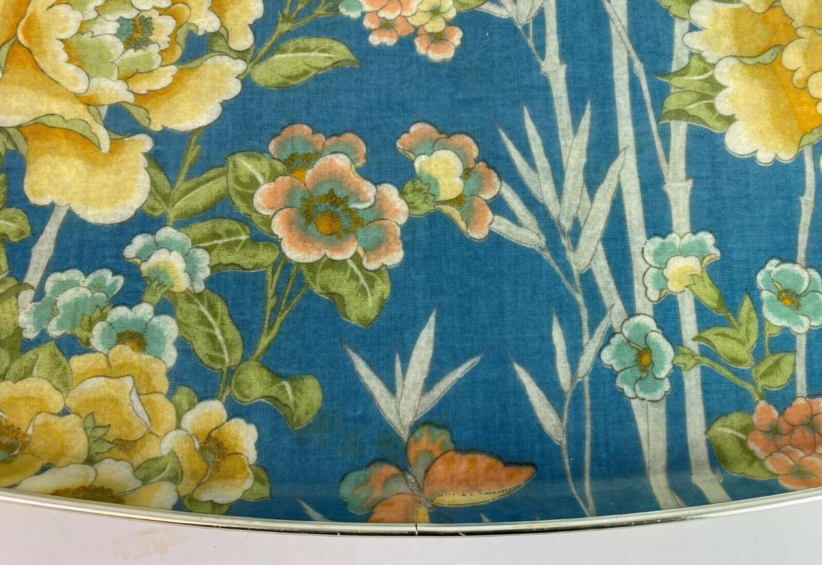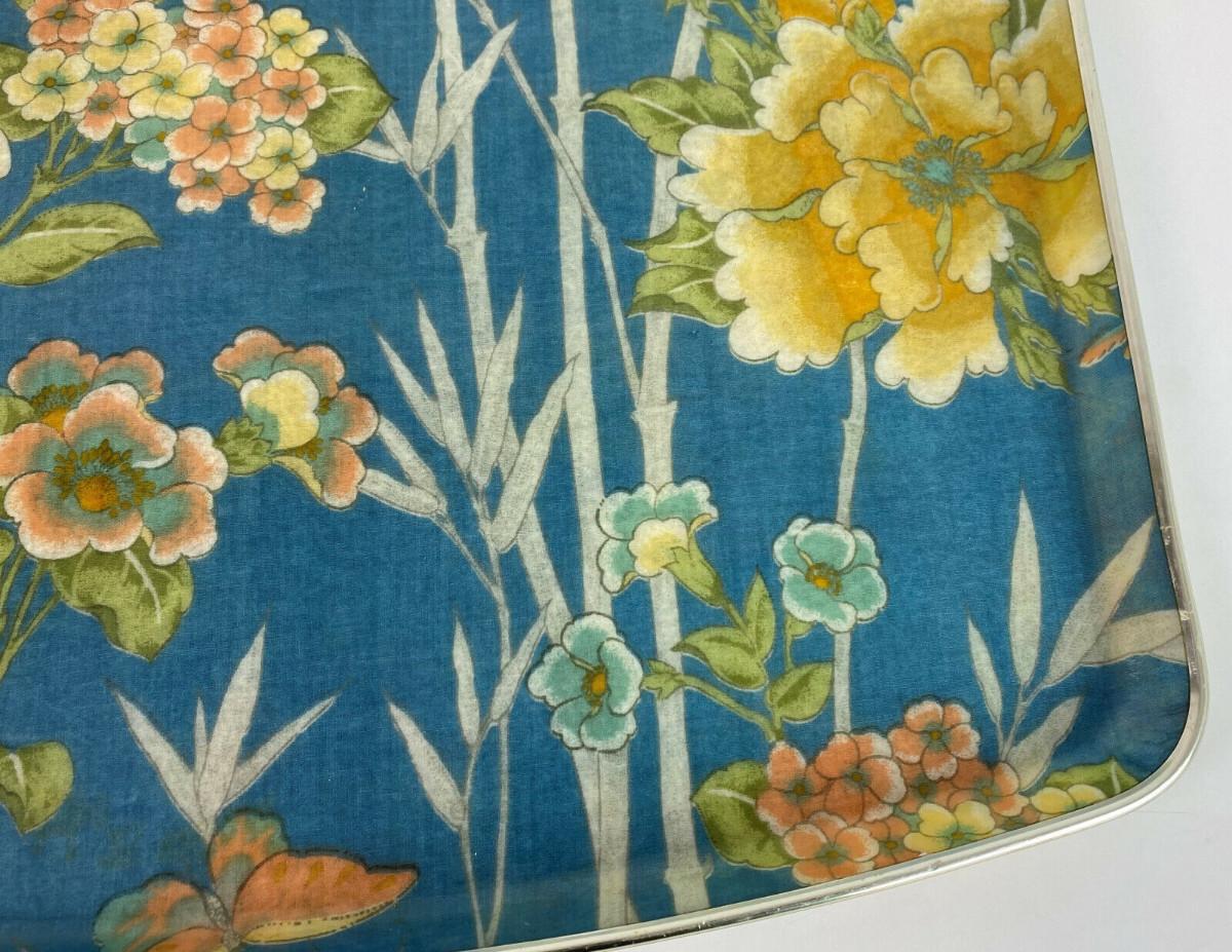 Here is a large vintage 21 x 16" serving tray with an Asian floral and bamboo motif..Laminated..metal trim...Alcohol-proof I believe...Mid Century...Light normal use..Good condition...The scene continues on the back.