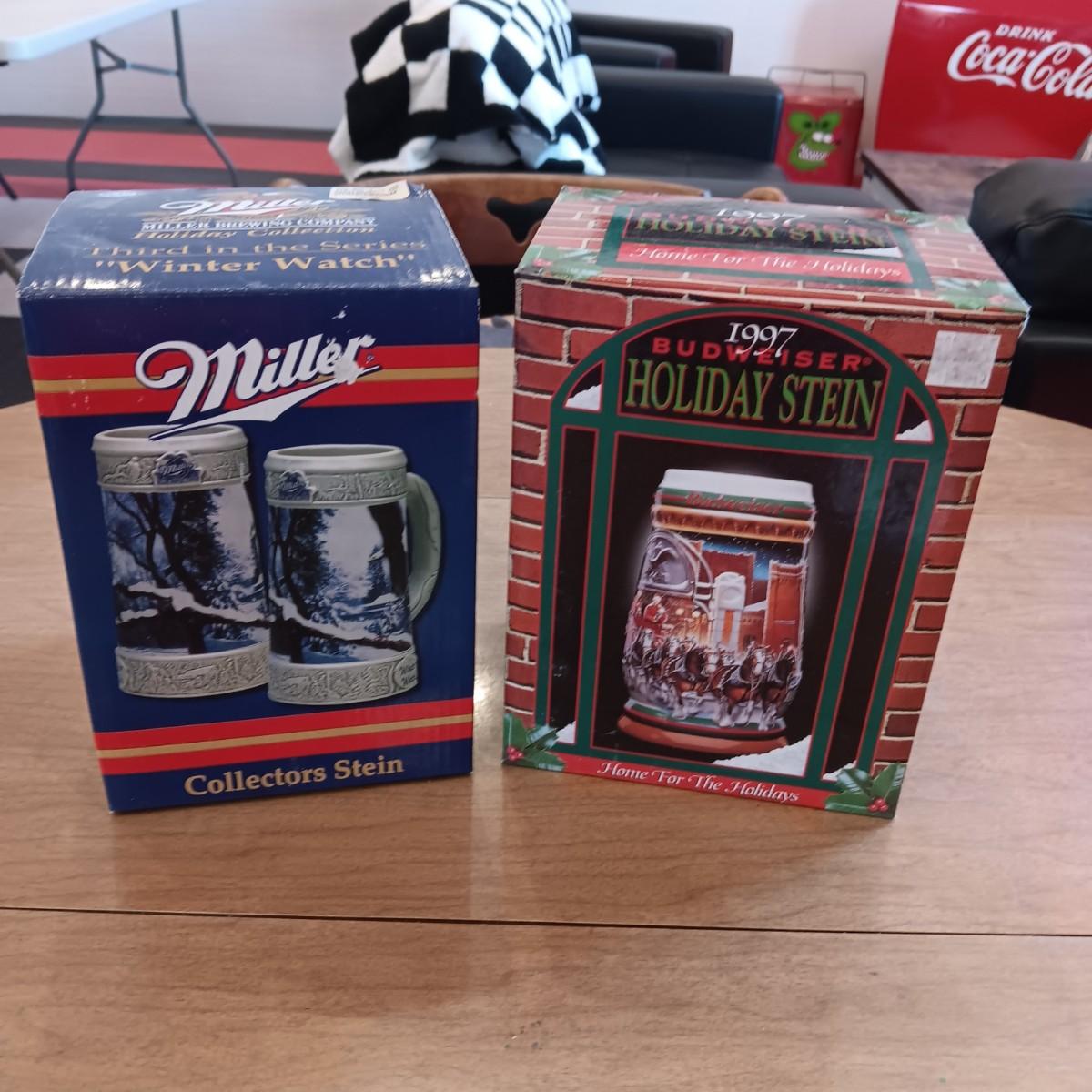 MILLER "WINTER WATCH" & BUDWEISER 1997 HOLIDAY BEER STEINS