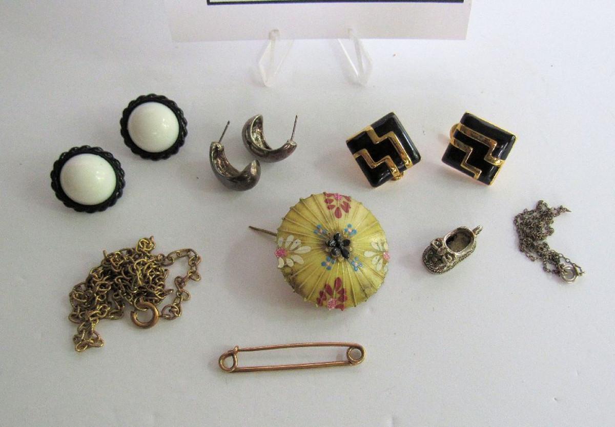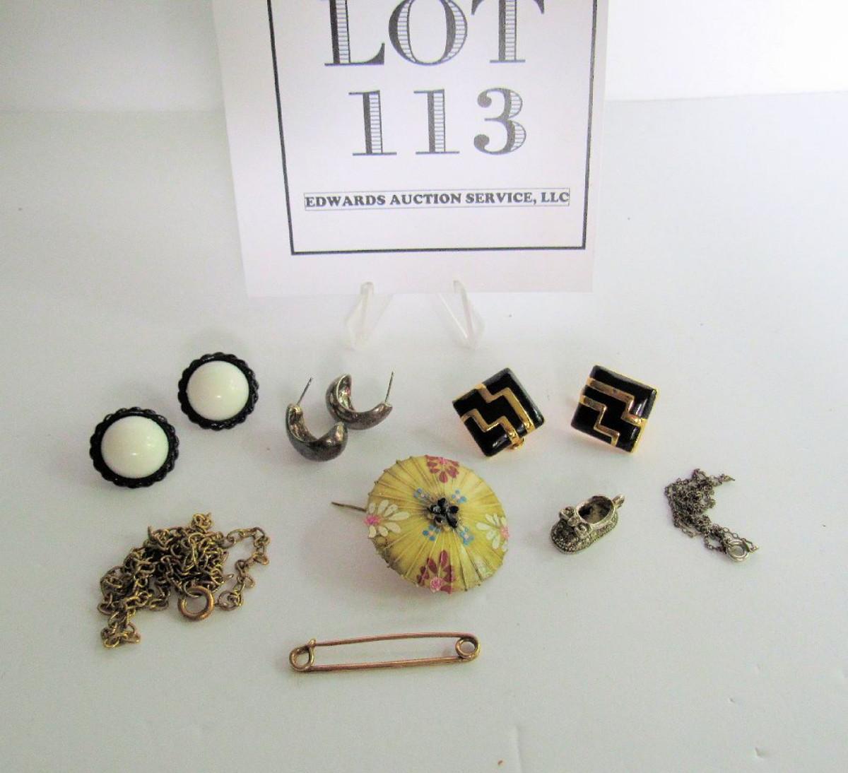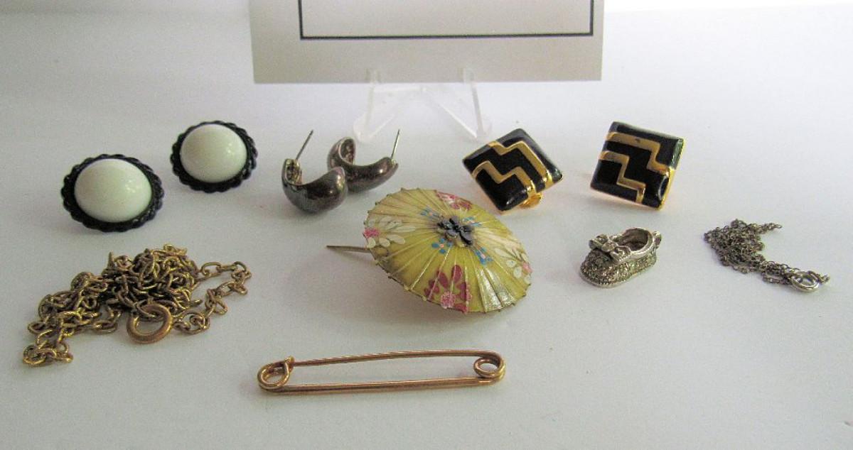 No backs on 2 pair of earrings. The umbrella appears to be a kind of stick pin and is like celluloid or plastic. The little shoe appears to be Marcesite, good shape. Shipping is available at shipping cost plus $5.00 handling fee on one box, $10.00 handling fee on two boxes, $15.00 handling fee on 3 boxes. Helps cover shipping materials and labor cost.