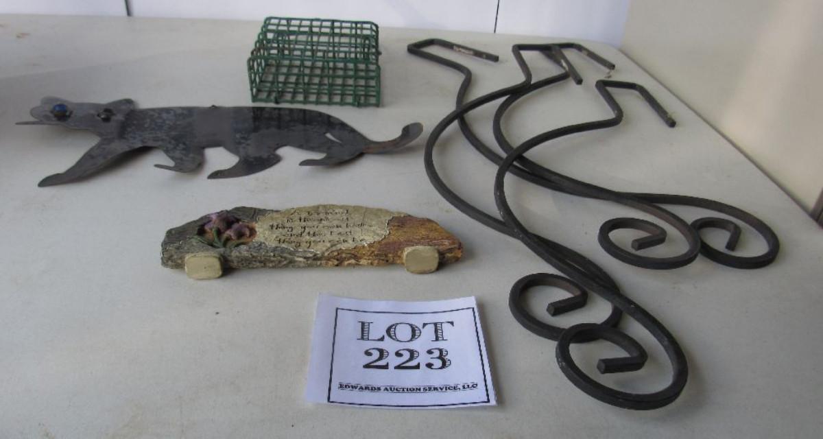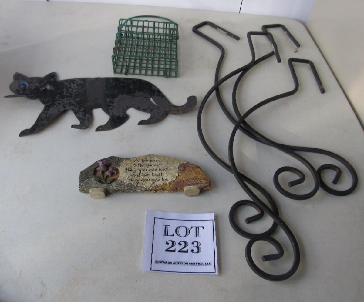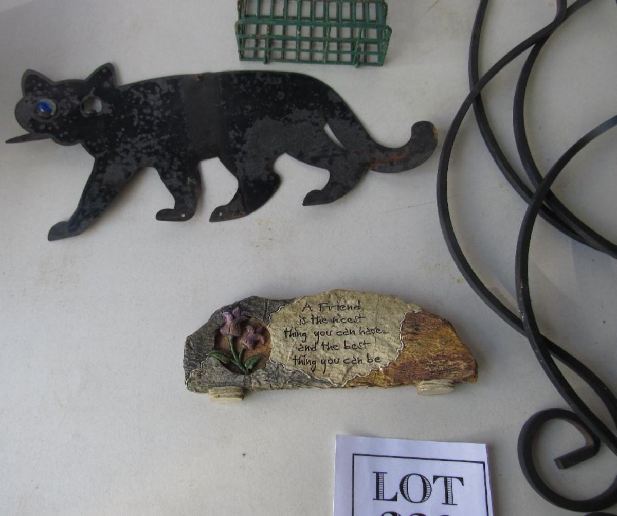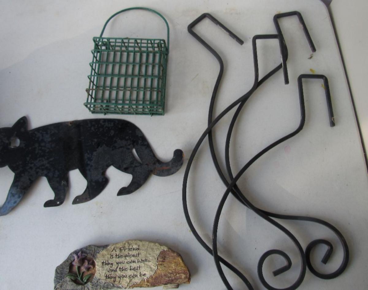 I believe those are over the railing hooks, good shape. The metal cat is missing one marble eye and has no stand.