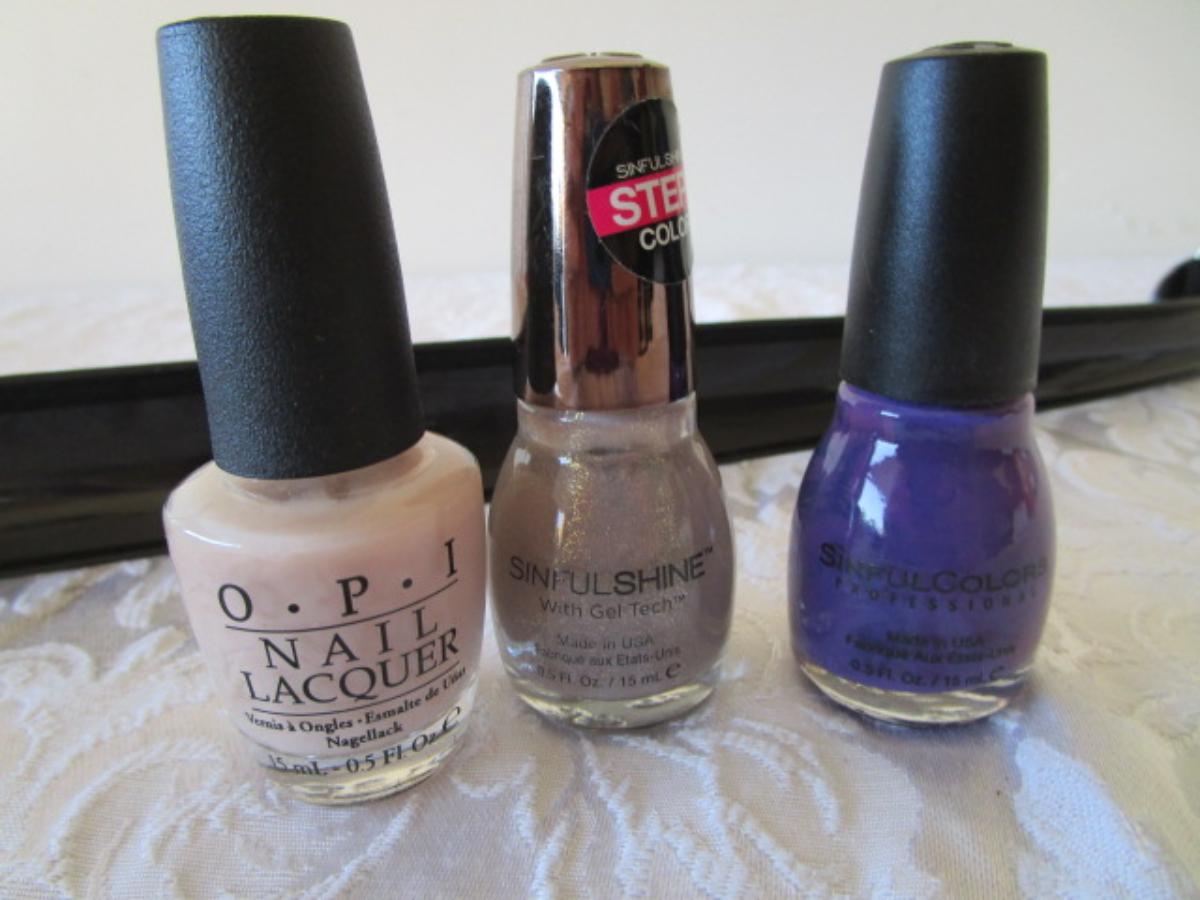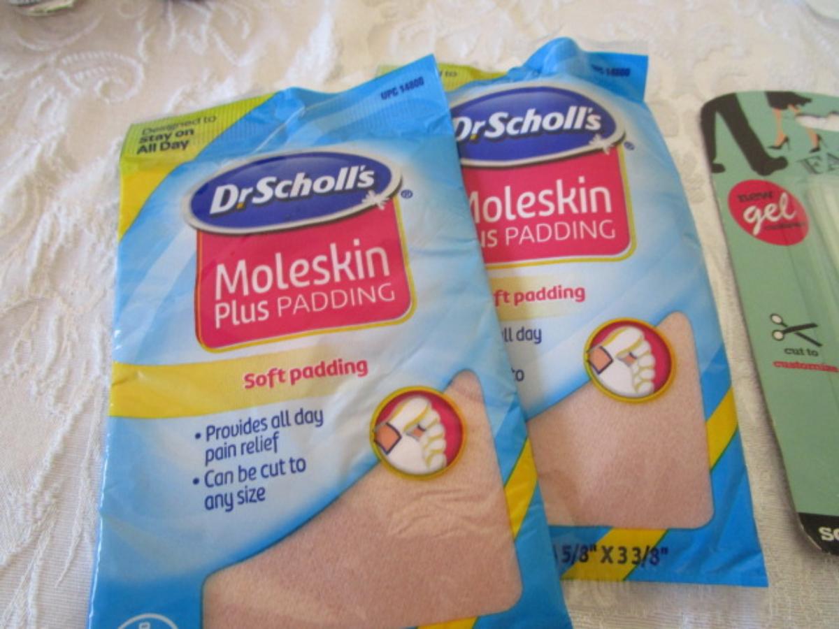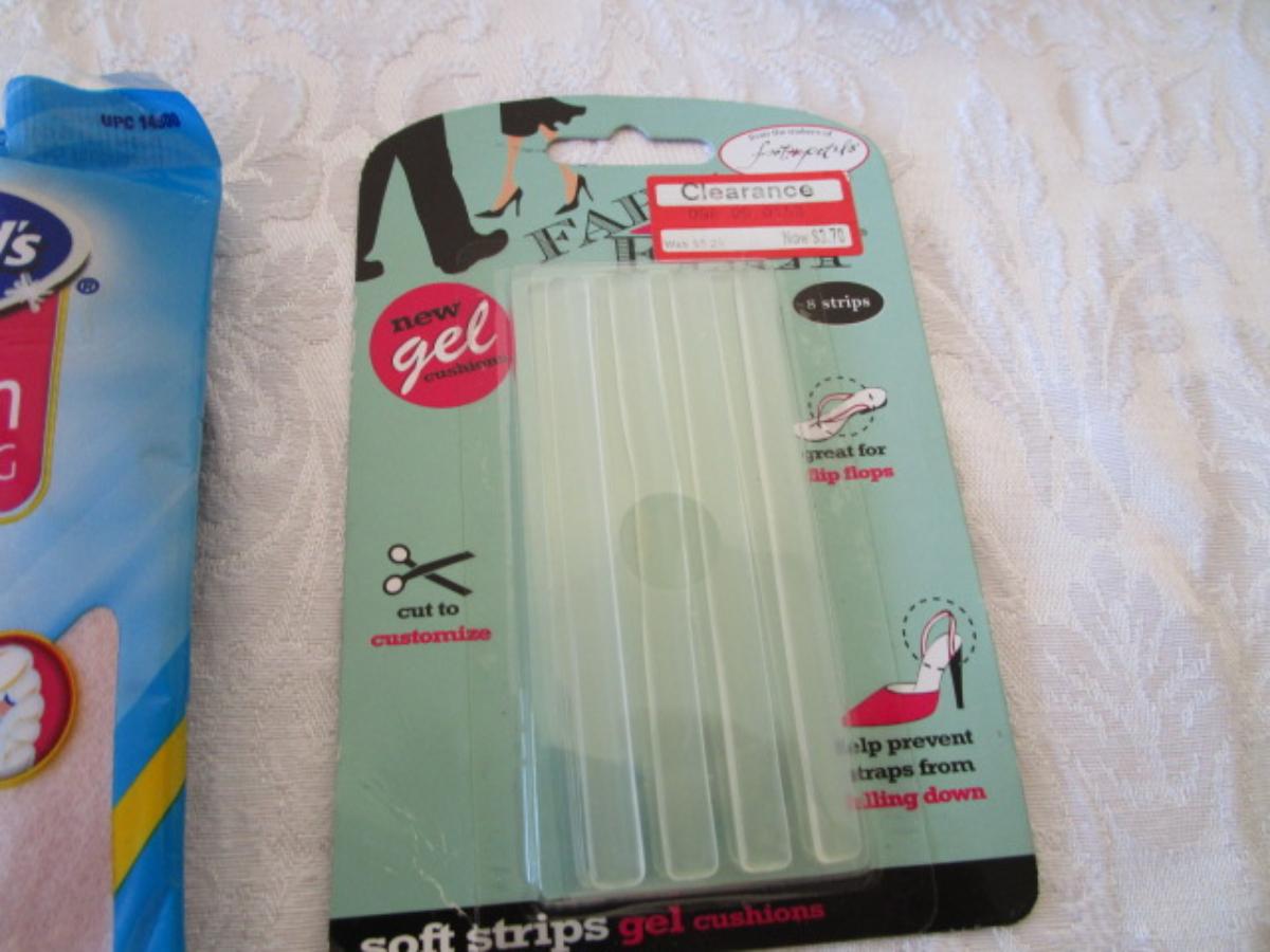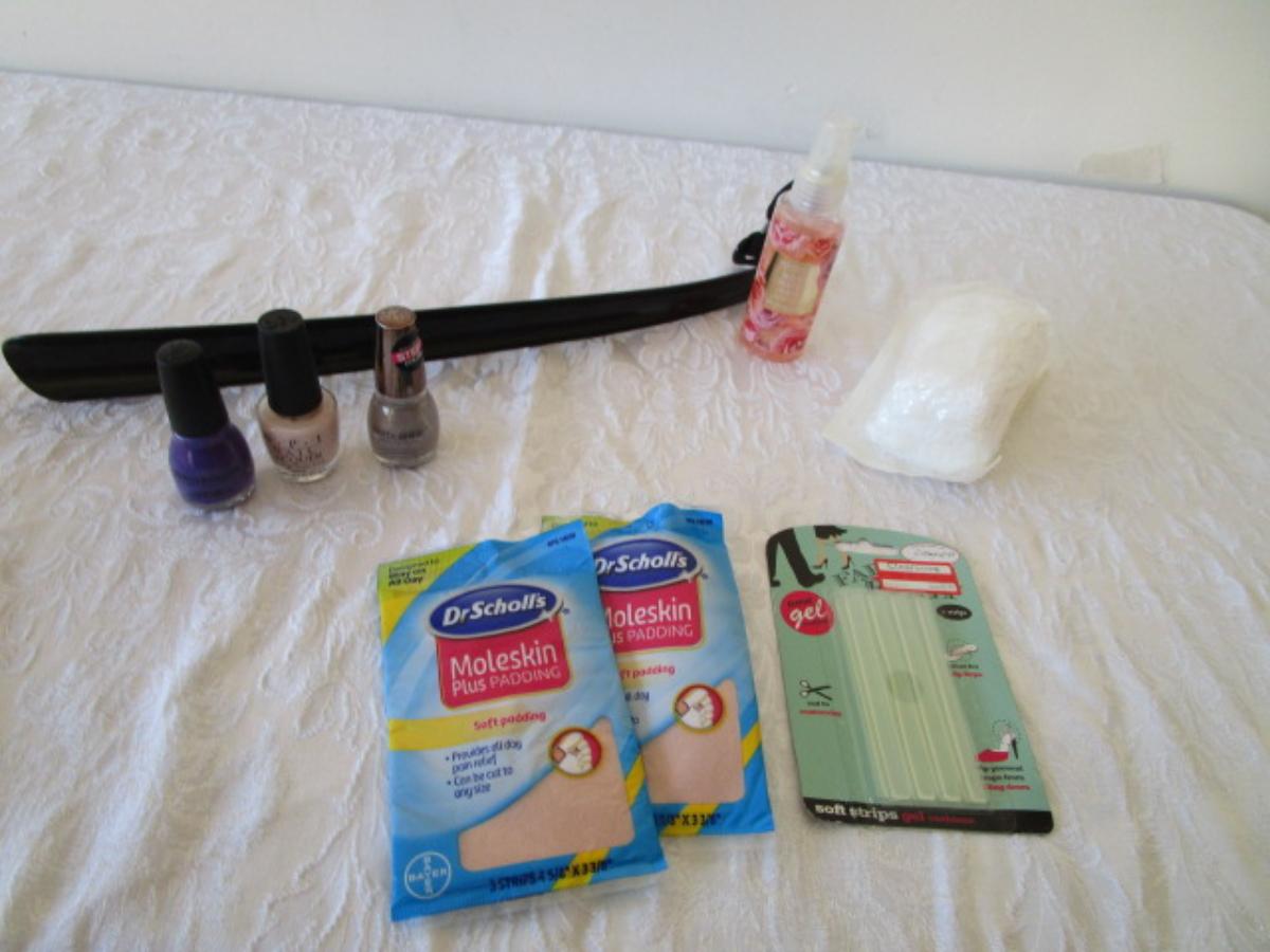 3 bottles Nail polish, 1 pkg gauze, Gel shoe cushions, 2 pkg moleskin + padding, 1 bottle Scent Worx body mist, shoe horn