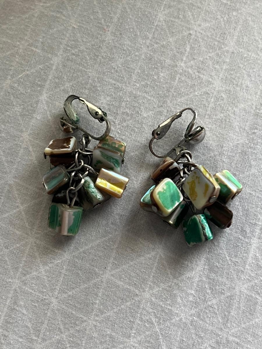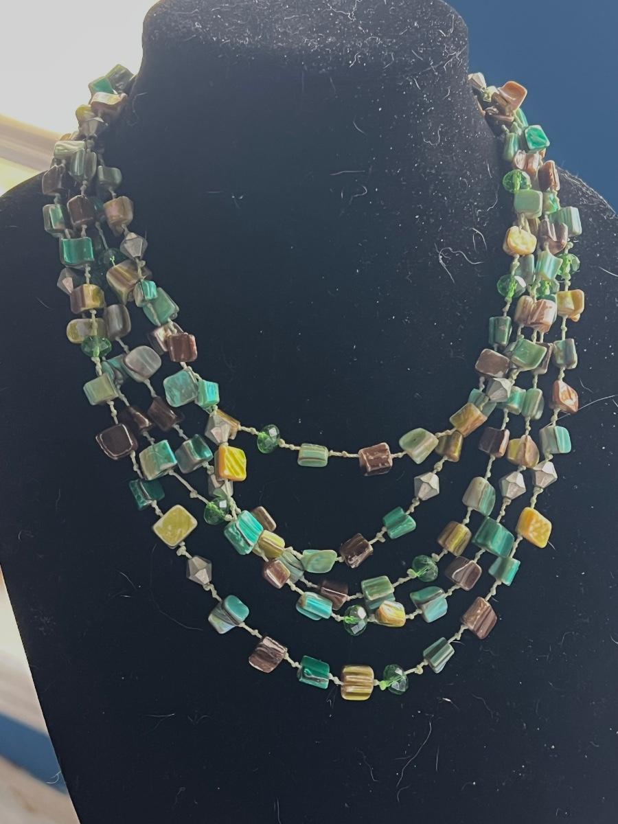 Chain is 18in long. Had a stack of 5. No stretch. Beads are brown, white, and green. Matching earrings are clips ons