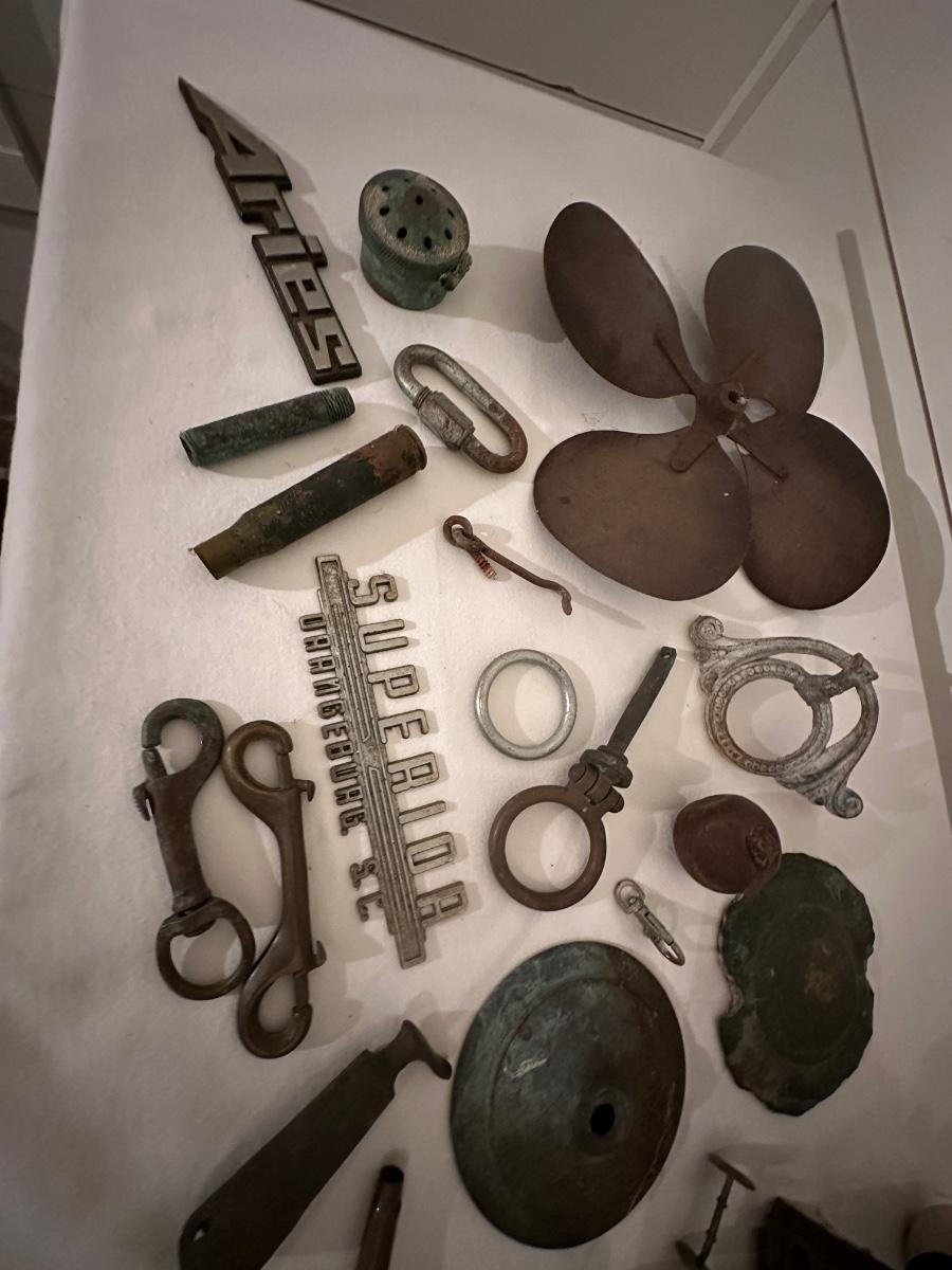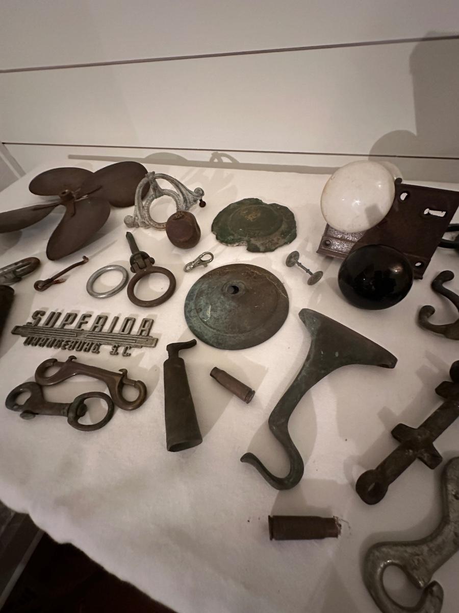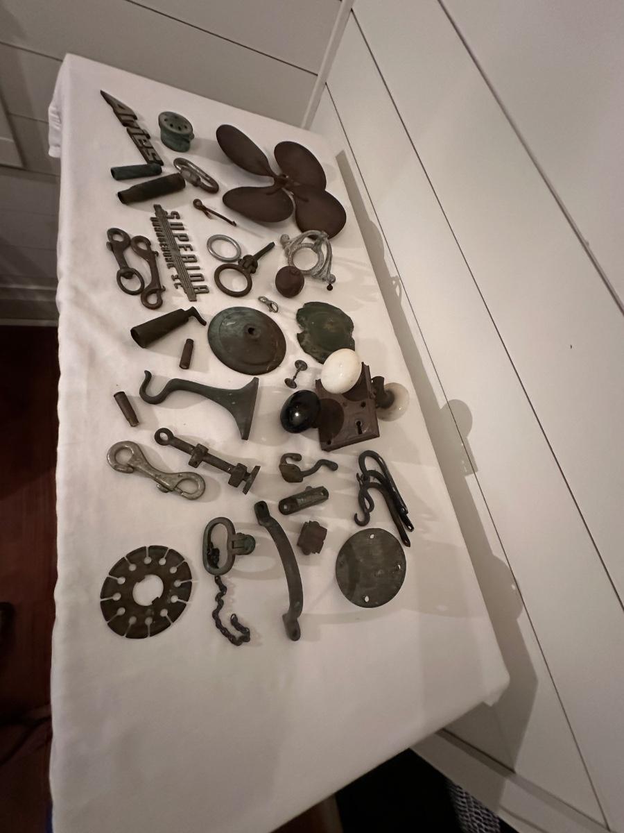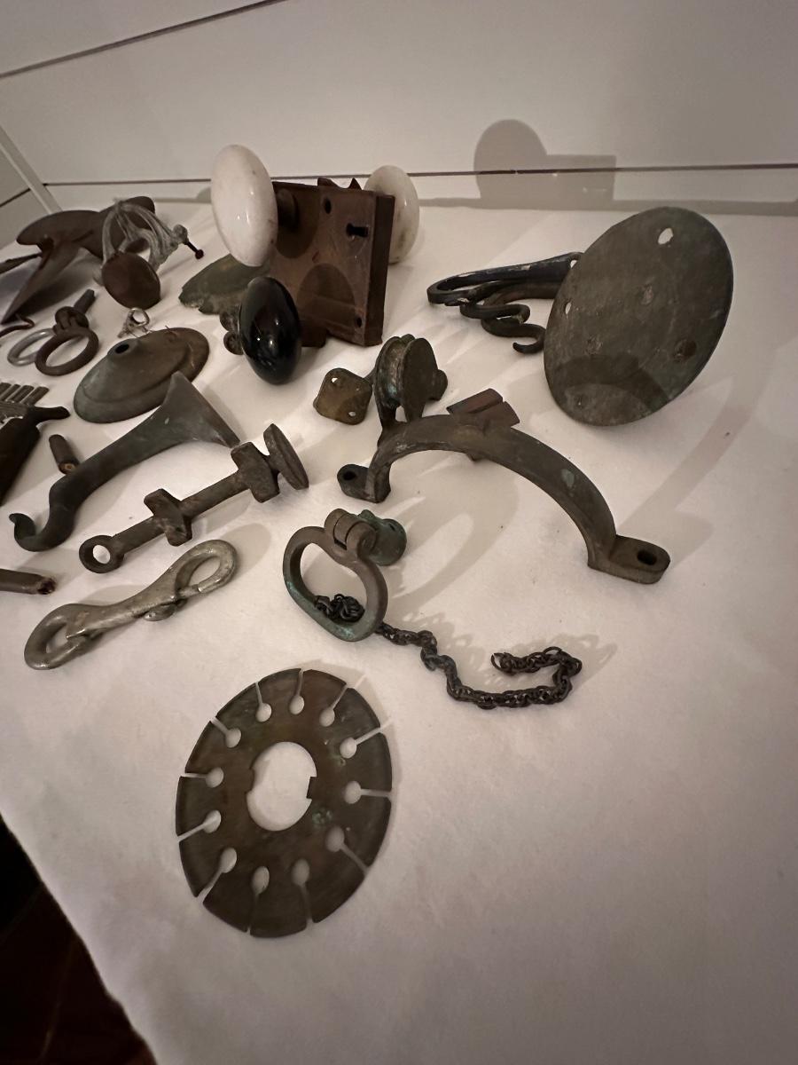 OLD DOORKNOBS, CAR EMBLEMS, MISC VINTAGE RUSTY METAL PIECES AS PICTURED