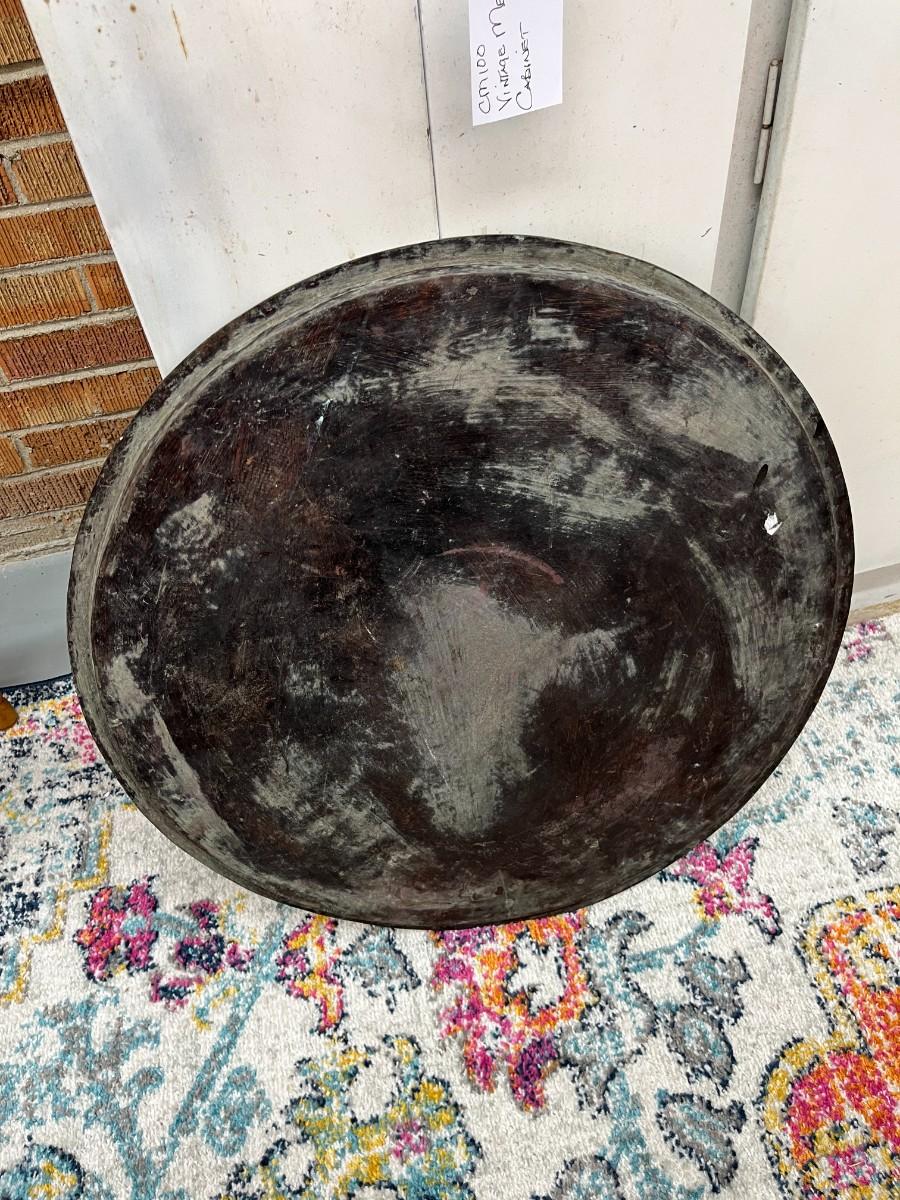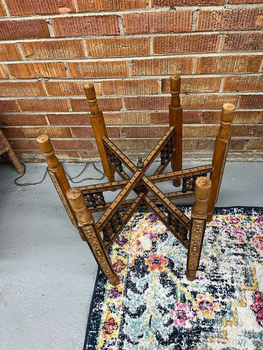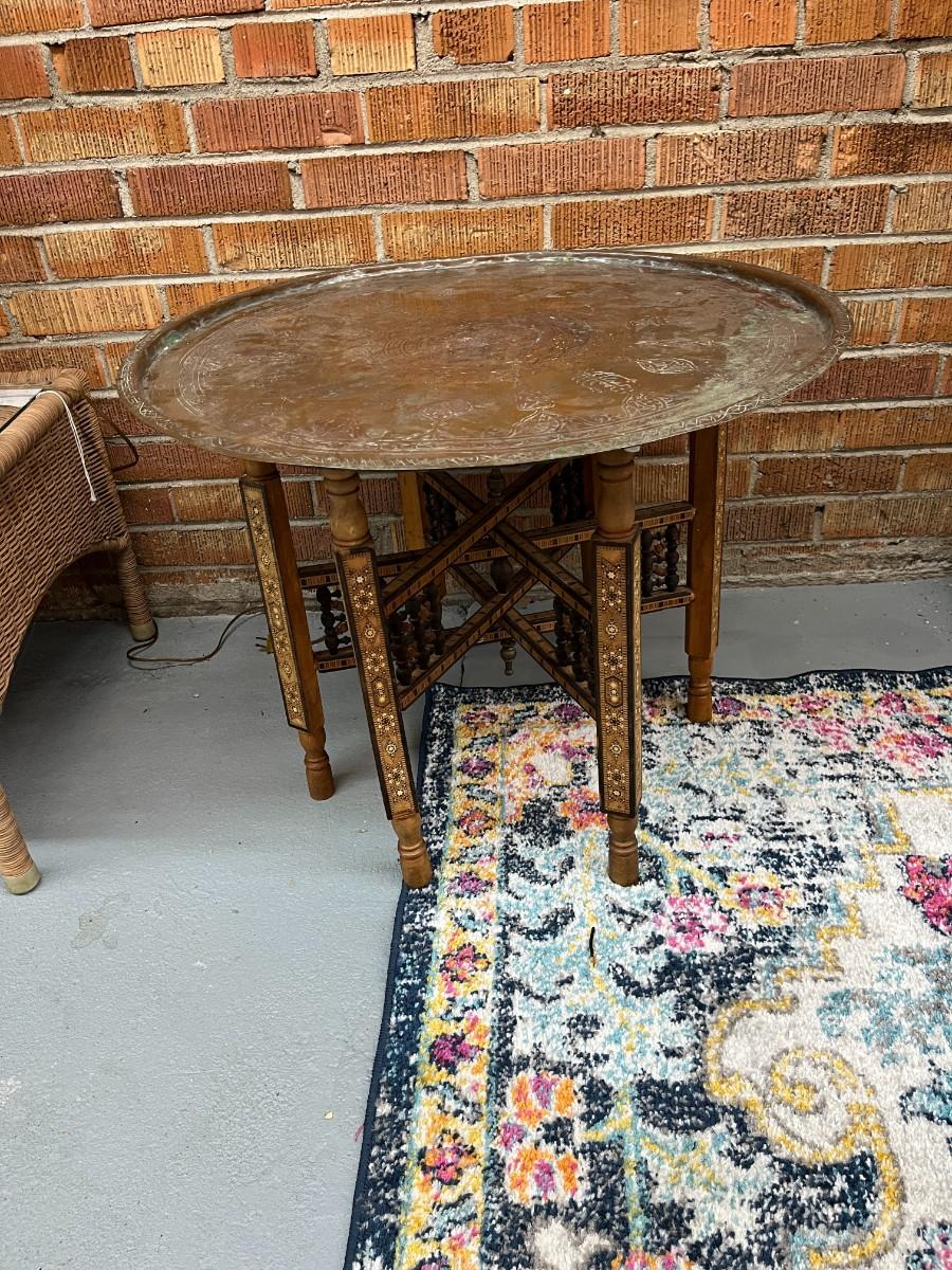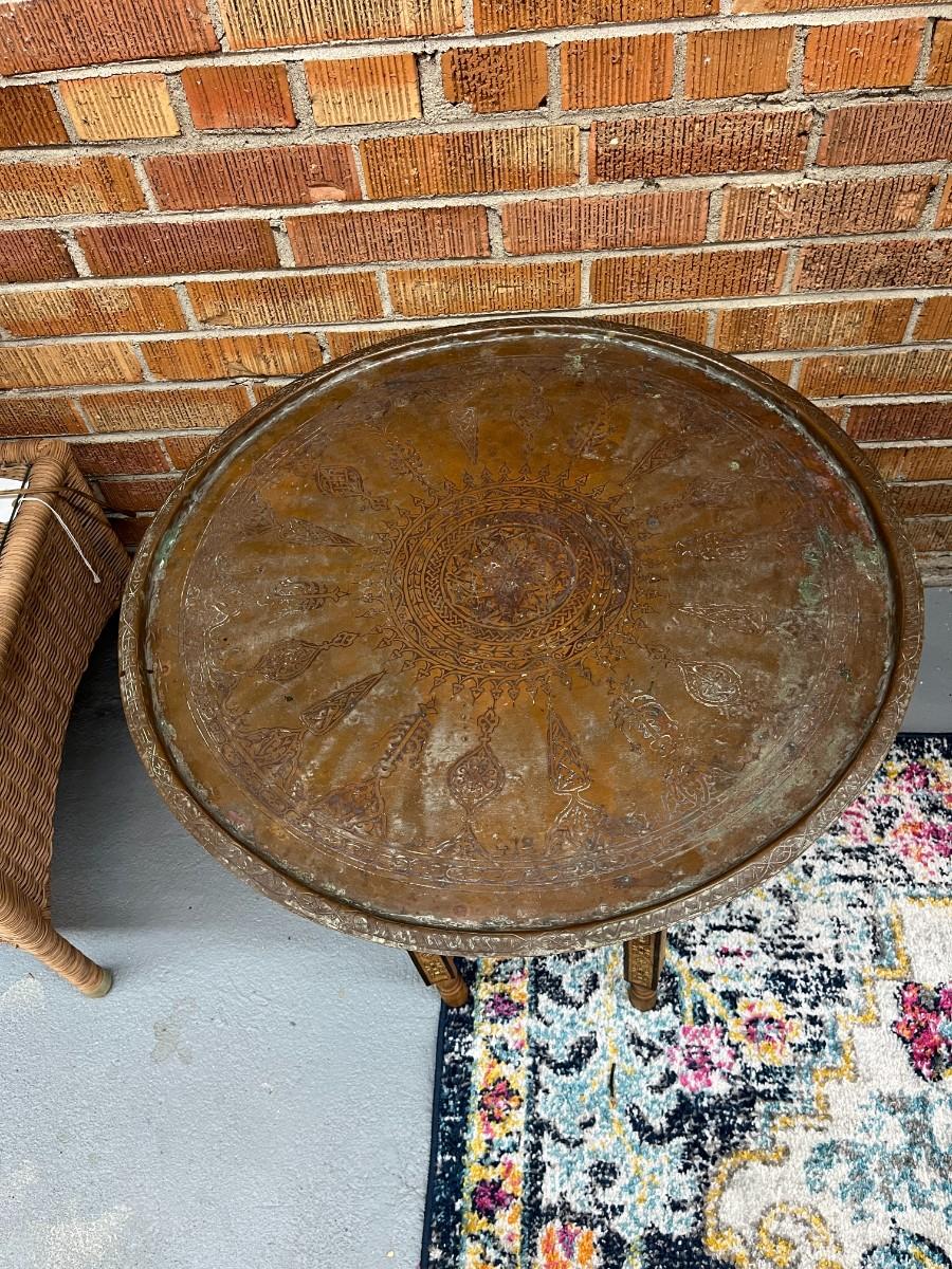Moroccan Brass Tray Top Table. Characterized by its intricately engraved brass top and a foldable wooden base.
