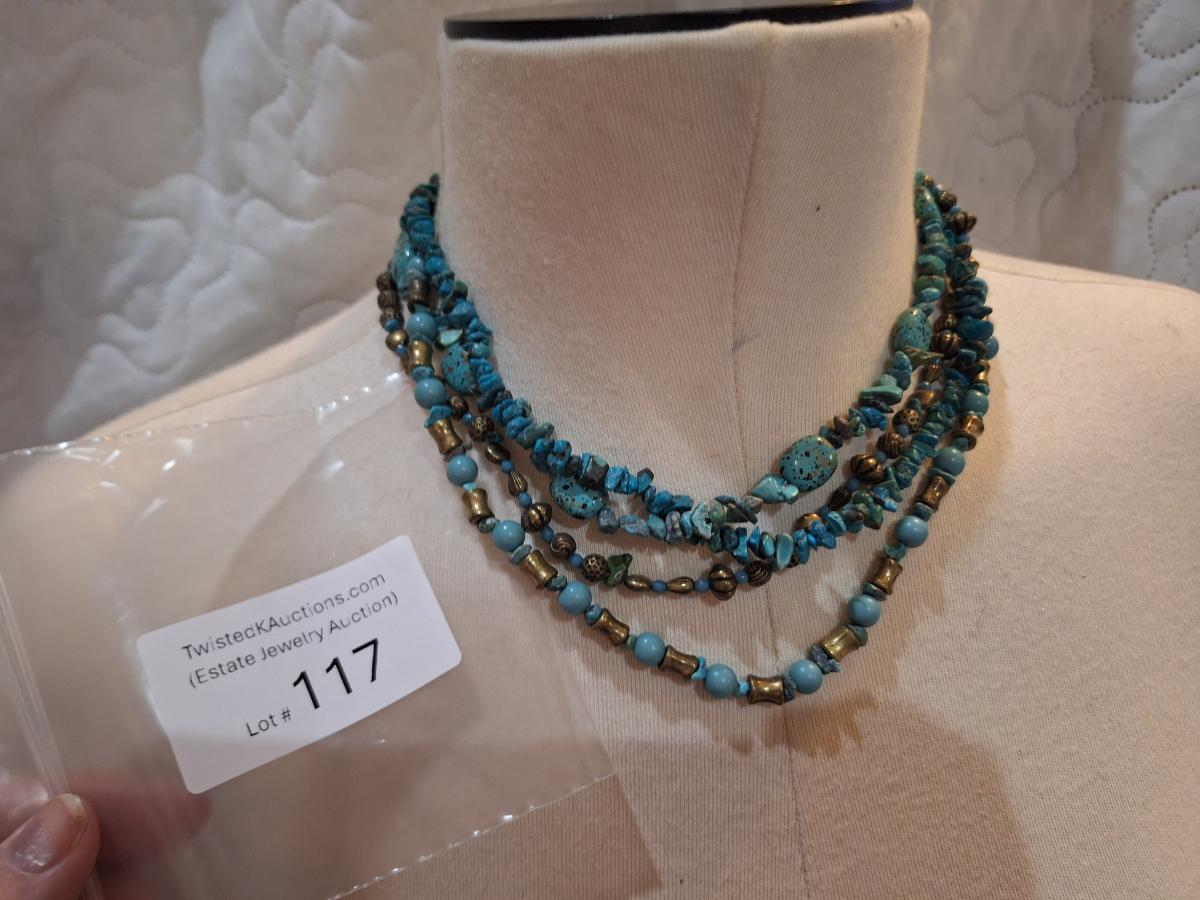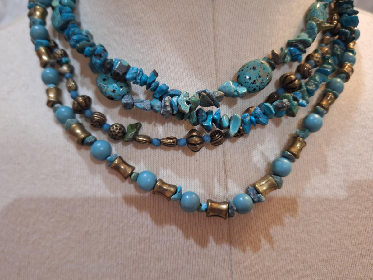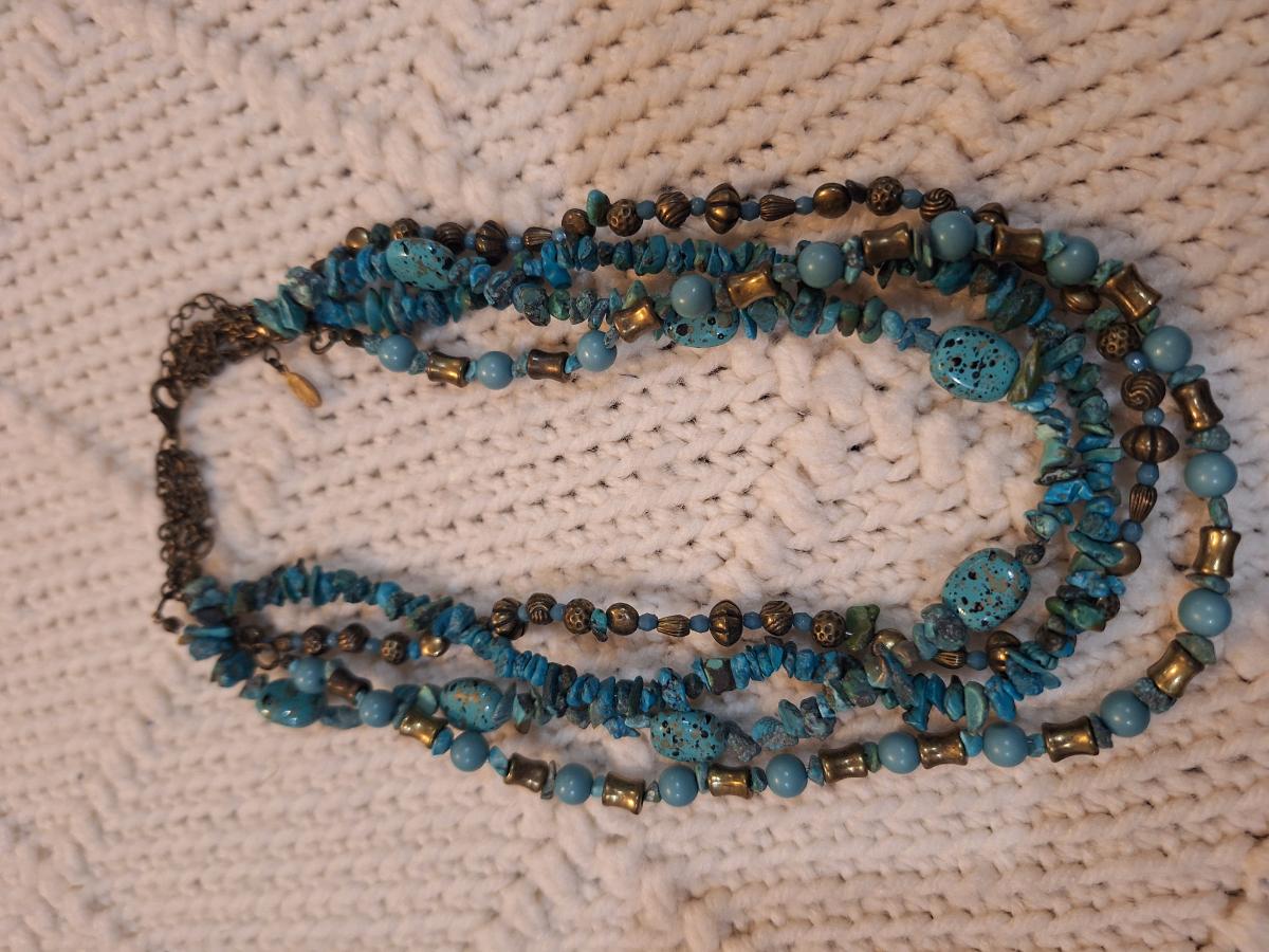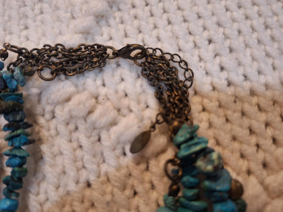 Multi strand rock chip necklace with turquoise color rocks and silver tone beads