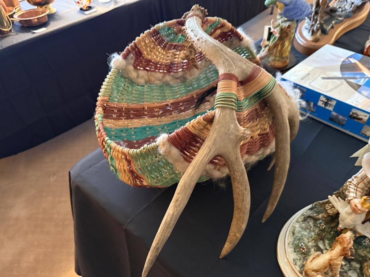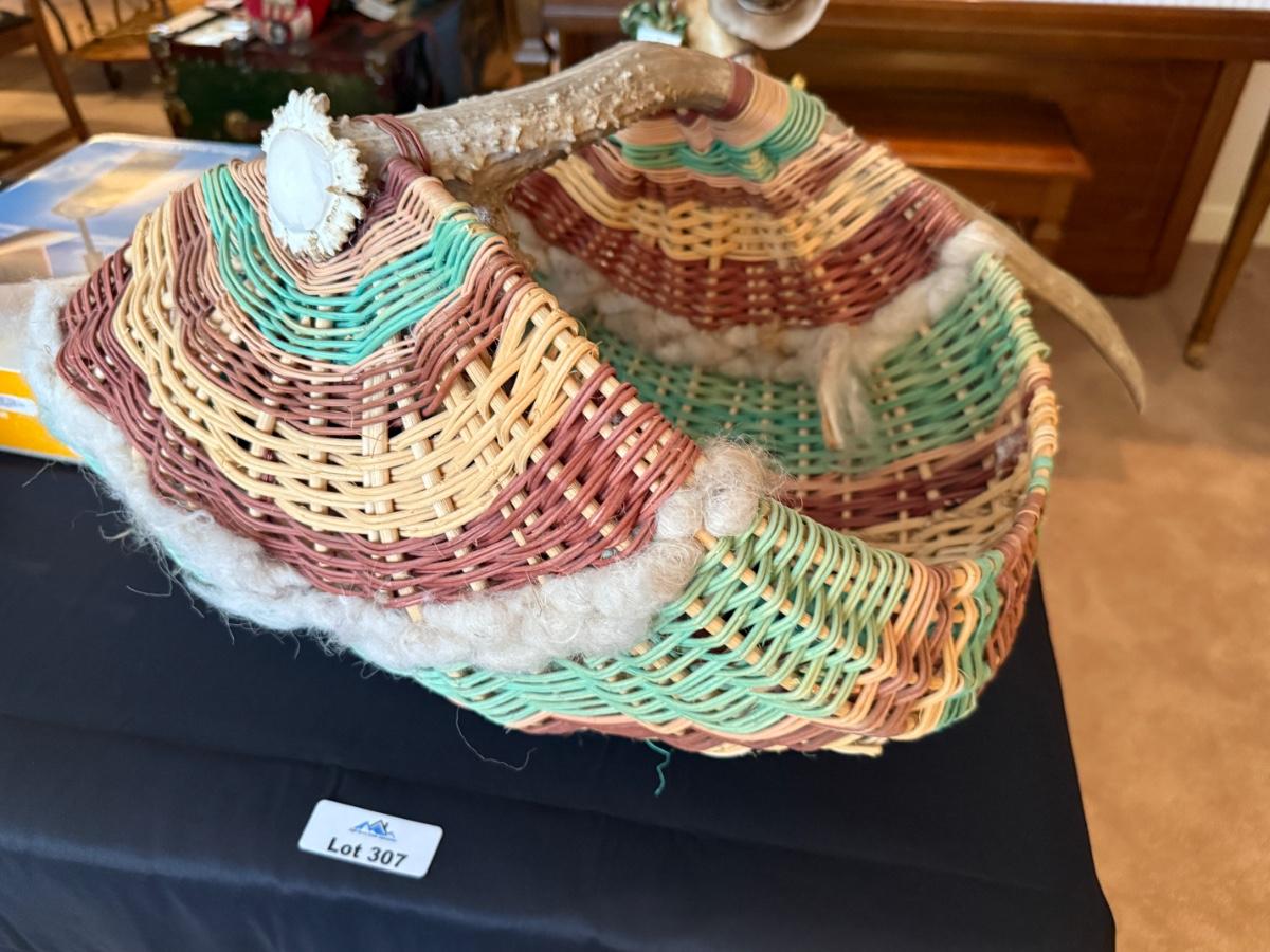 Multi-colored woven basket with deer antlers as handle