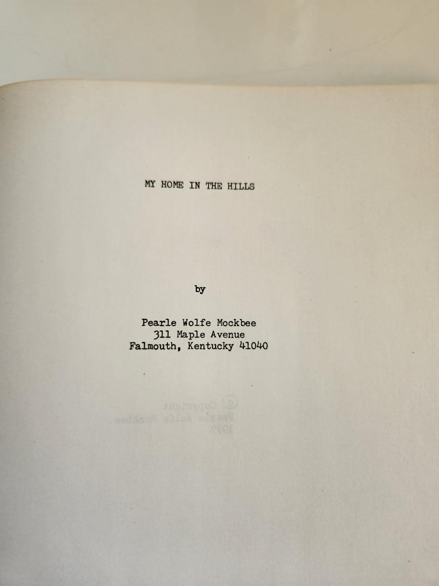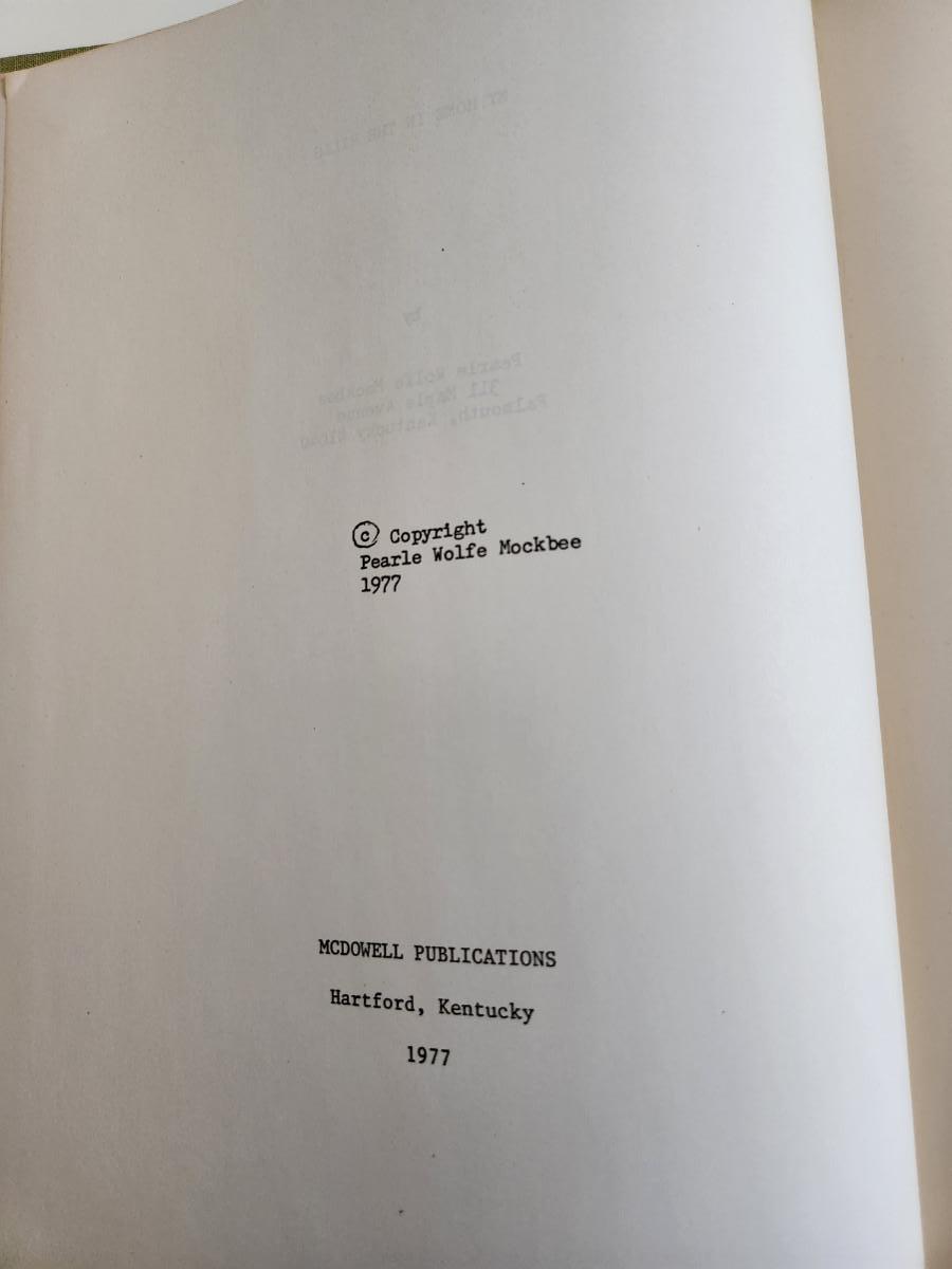 This auction lot is for a nice copy of the book My Home In The Hills by Pearle Wolfe Mockbee - Autographed by the author. This book has a green woven cover with no front writing, pictures or dust jacket. The book appears to be self or small printer published. McDowell Publications, 1977. Hardcover in good condition. 132 Pages. Seems to be a personal account of living in Pendleton County, KY on a farm.