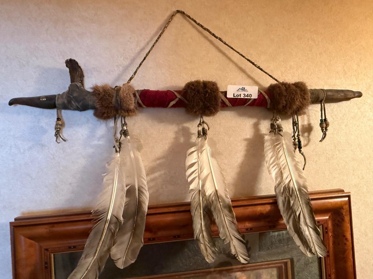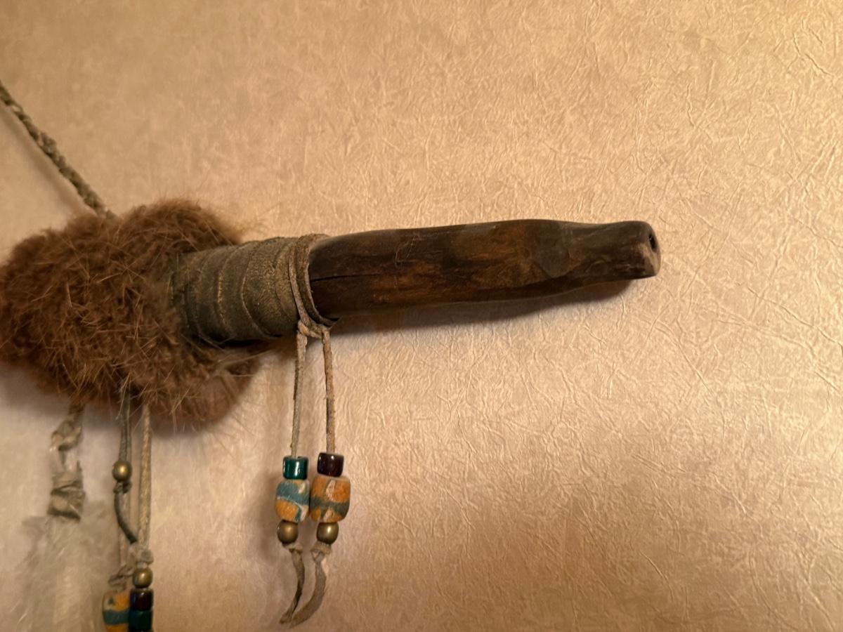 Native American wood Peace Pipe feather art piece