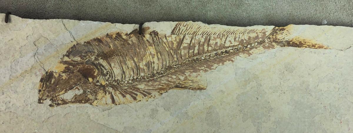 Here is a genuine prehistoric Fish Fossil in a 15.75" long by 7.5" stone matrix...Unknown species although we imagine it dates to the Eocene Epoch...some 50 million years ago...Clean display on this natural relic...Estate find.