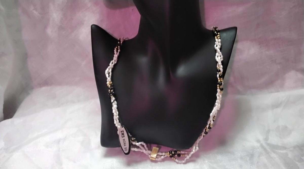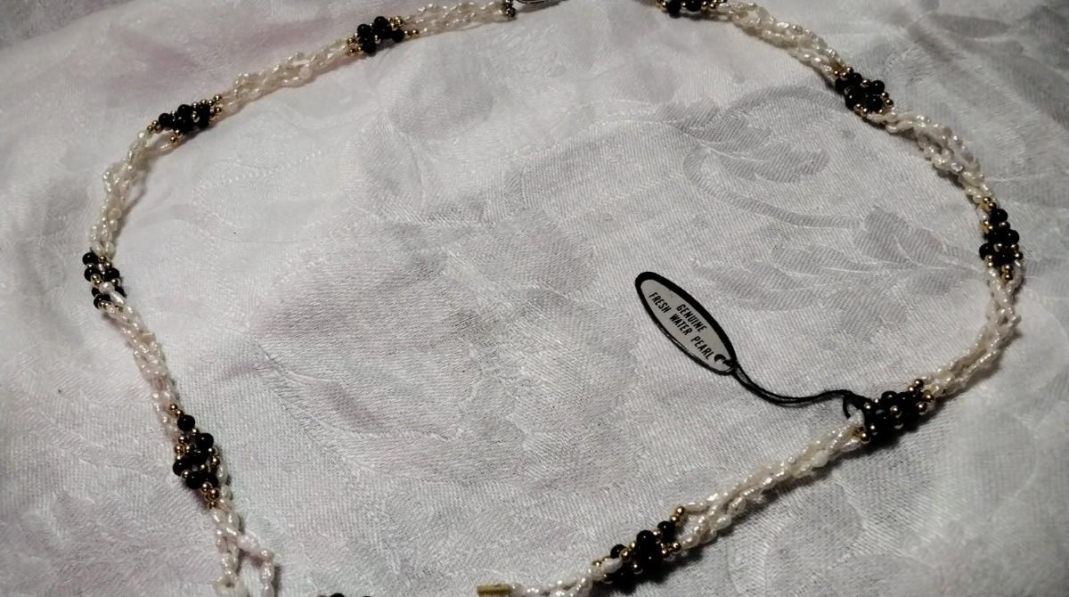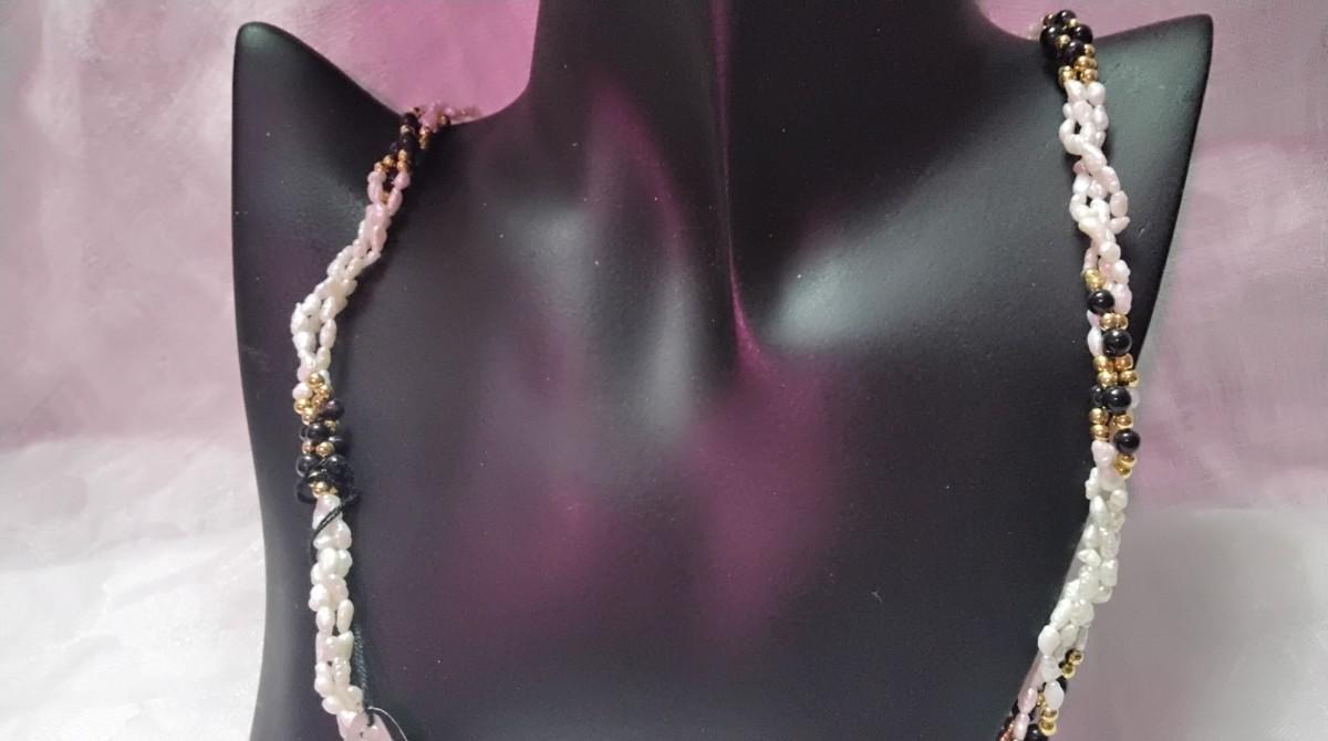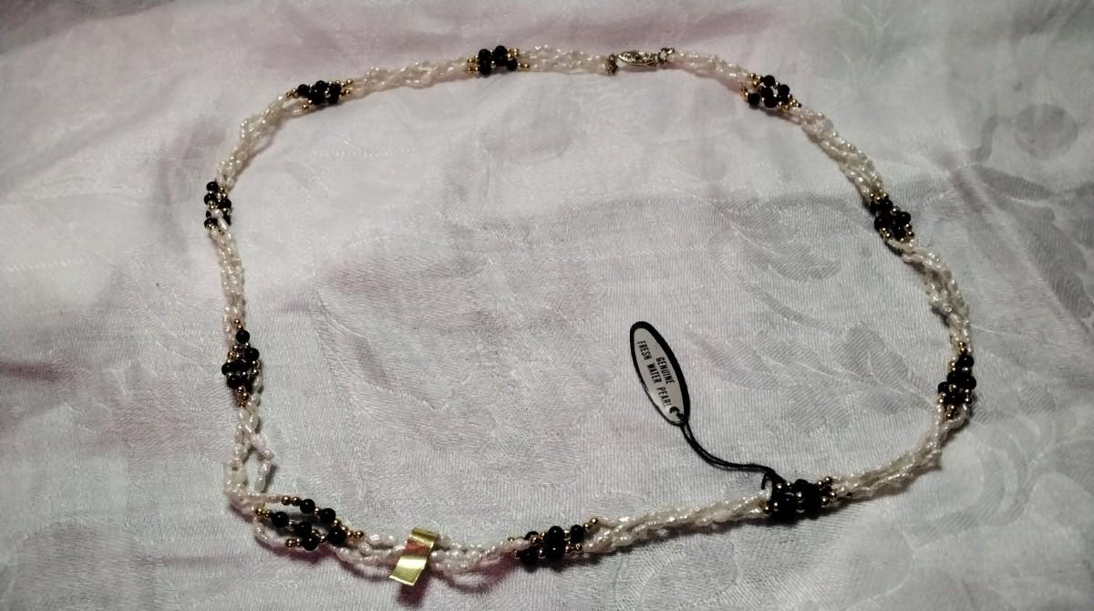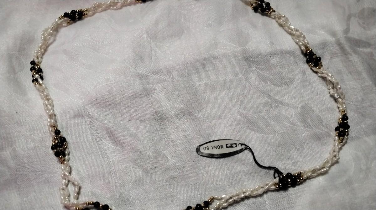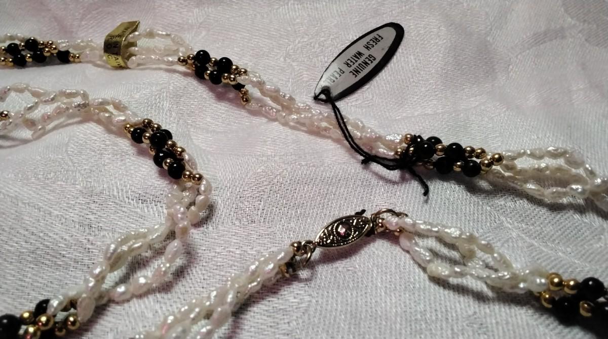 Vintage Mona So Torsade Triple Strand Freshwater Keshi Pearls and Onyx Bead 27" Necklace