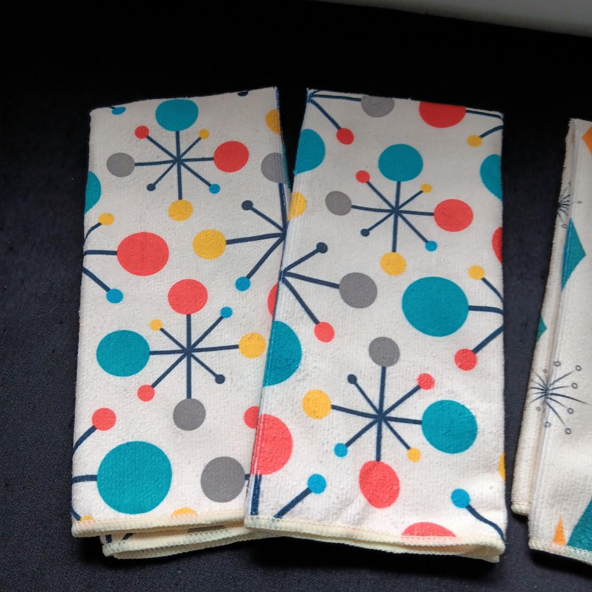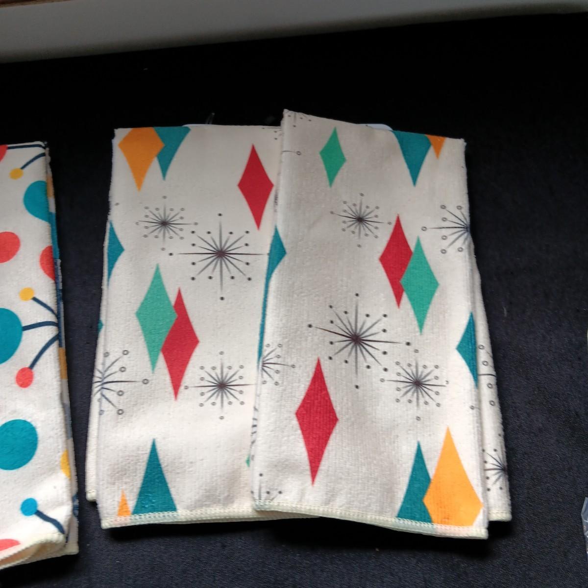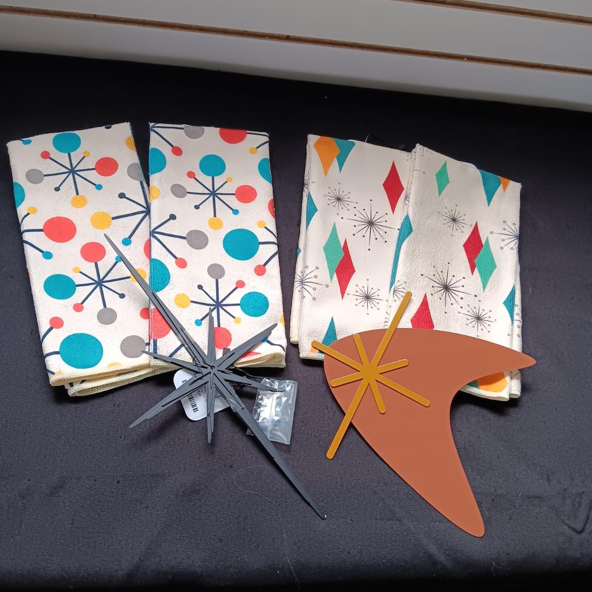 NEW 4 RETRO MATERIAL DISH TOWELS AND METAL WALL ART