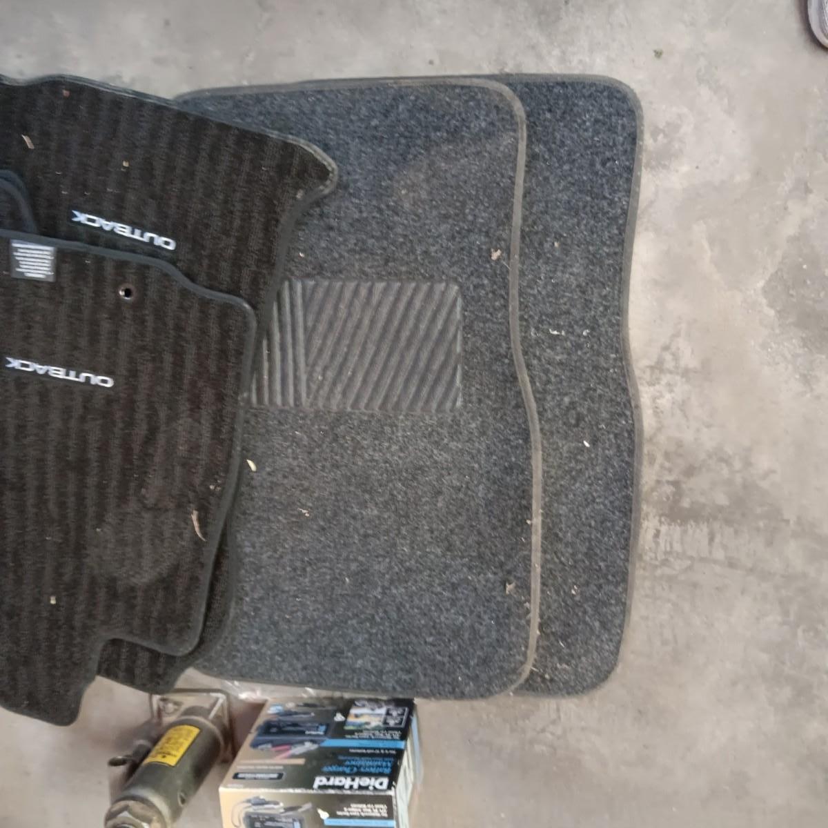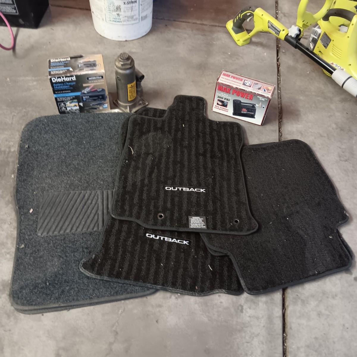 NEW AND LIKE NEW AUTO FLOOR MATS, BATTERY CHARGER MAINTAINER, BOTTLE JACK AND A COMPRESSOR
