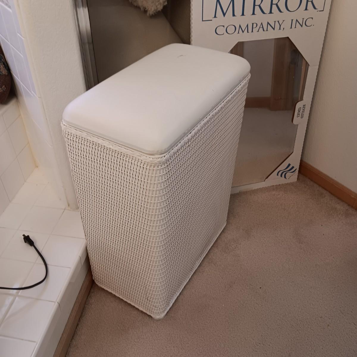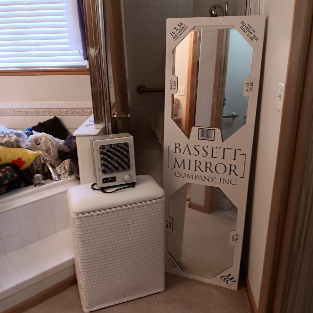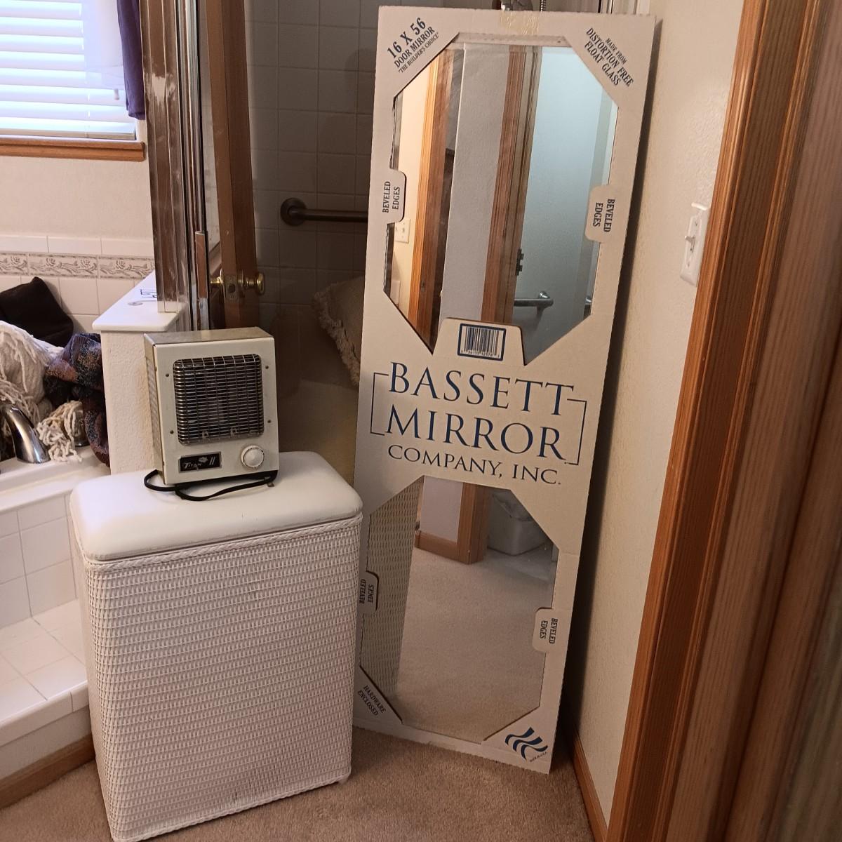 NEW BASSETT FULL LENGTH MIRROR, LAUNDRY HAMPER AND SMALL HEATER