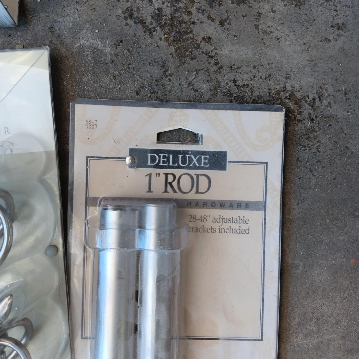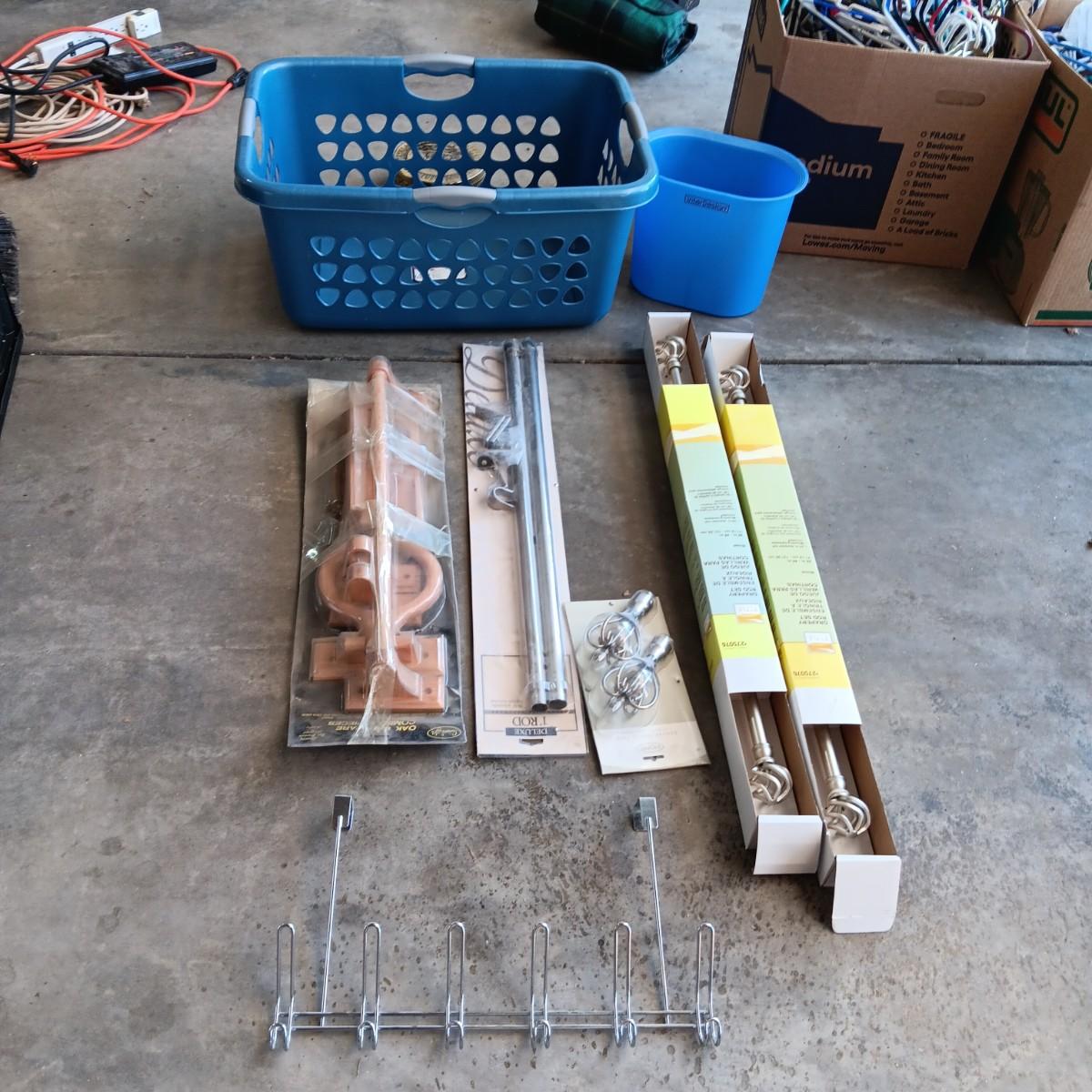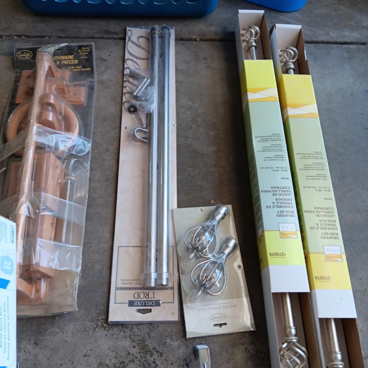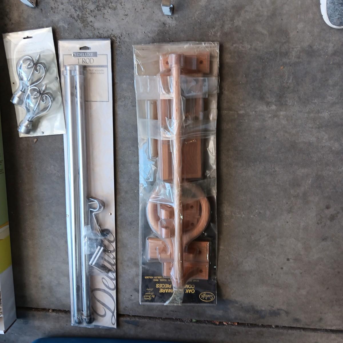 NEW CURTAIN RODS, NEW OAK BATHROOM TOWEL BARS AND TOILET SEAT & LAUNDRY BASKET