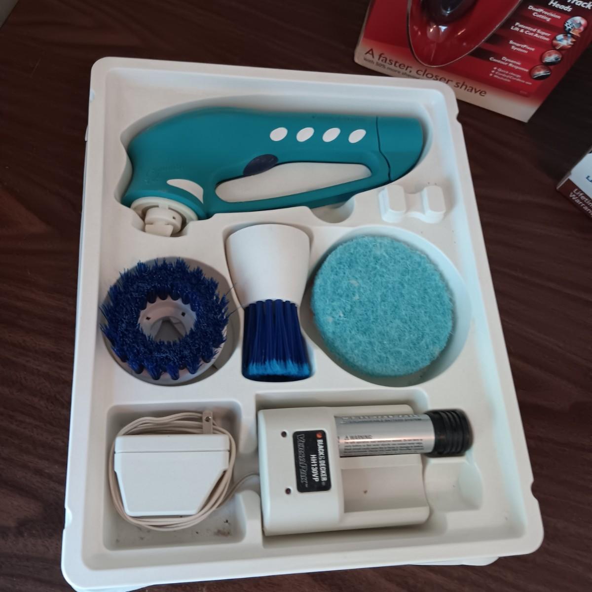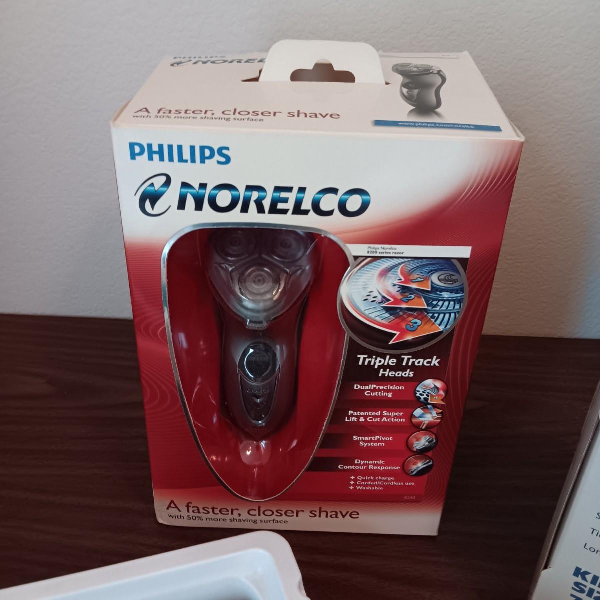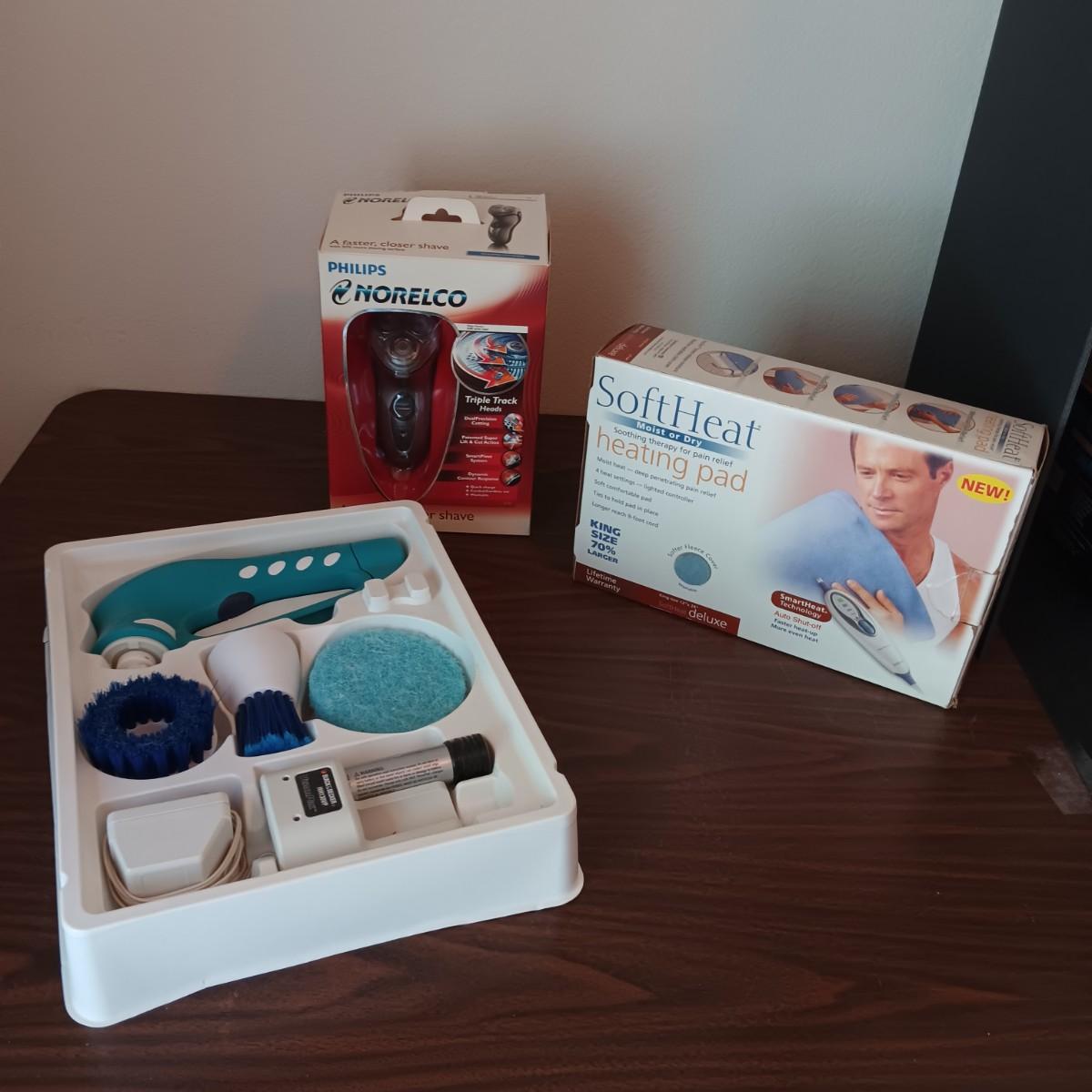 NEW NORELCO SHAVER, KING SIZE HEATING PAD AND A SCRUBBER