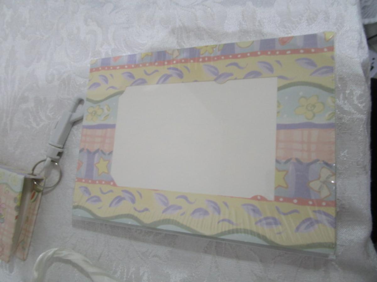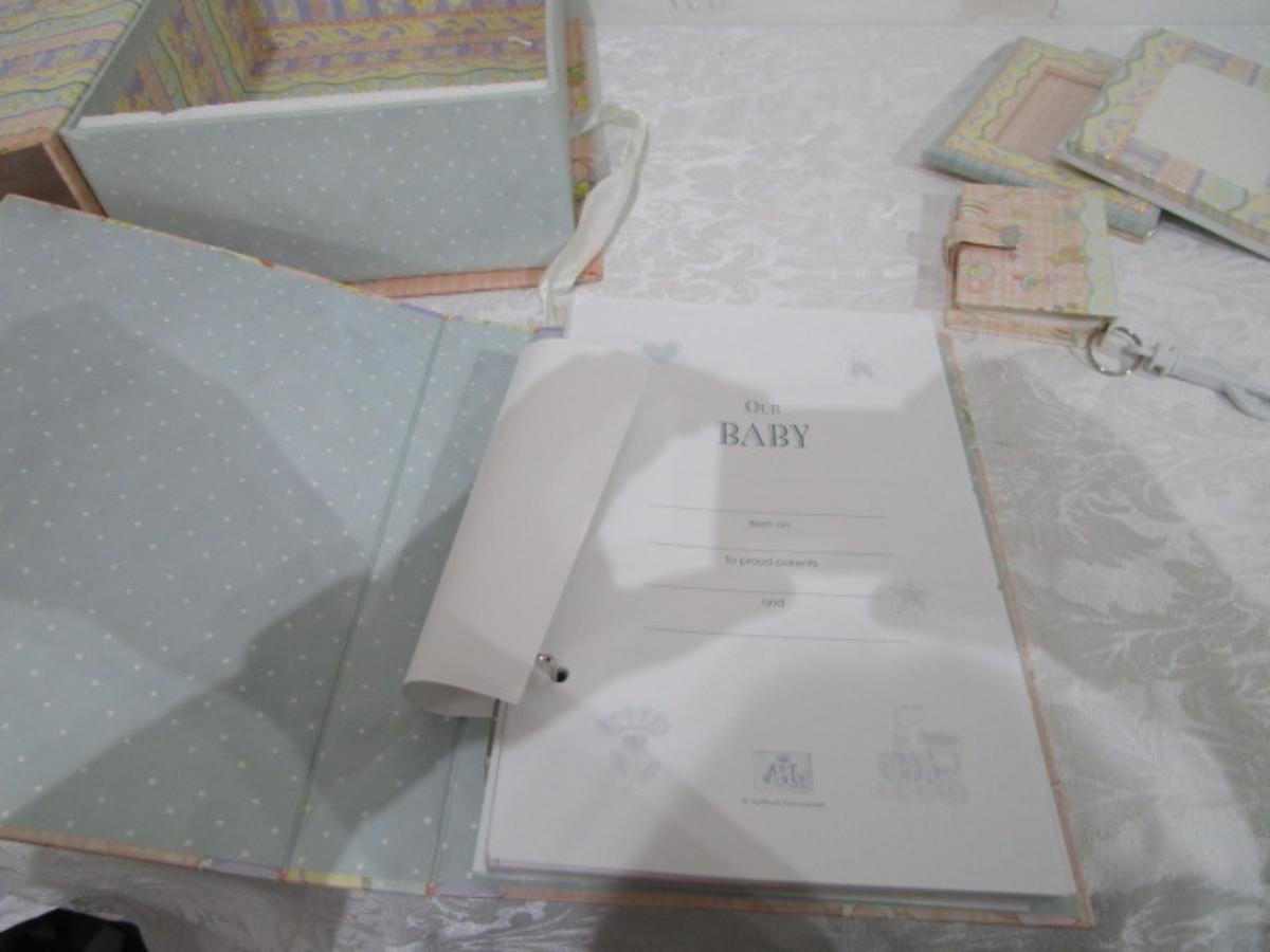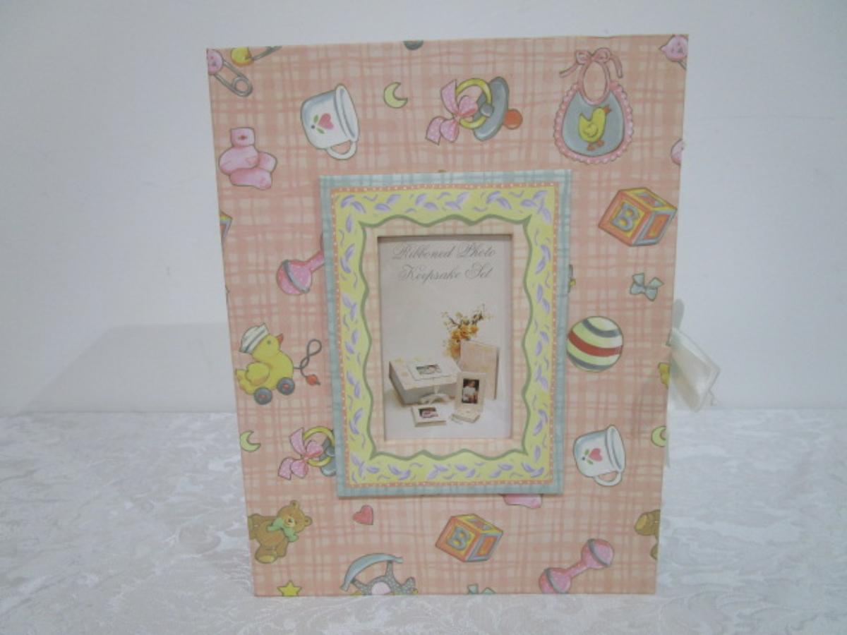Has small photo book keychain, picture frame, picture frame cards with envelopes, and larger baby photo album