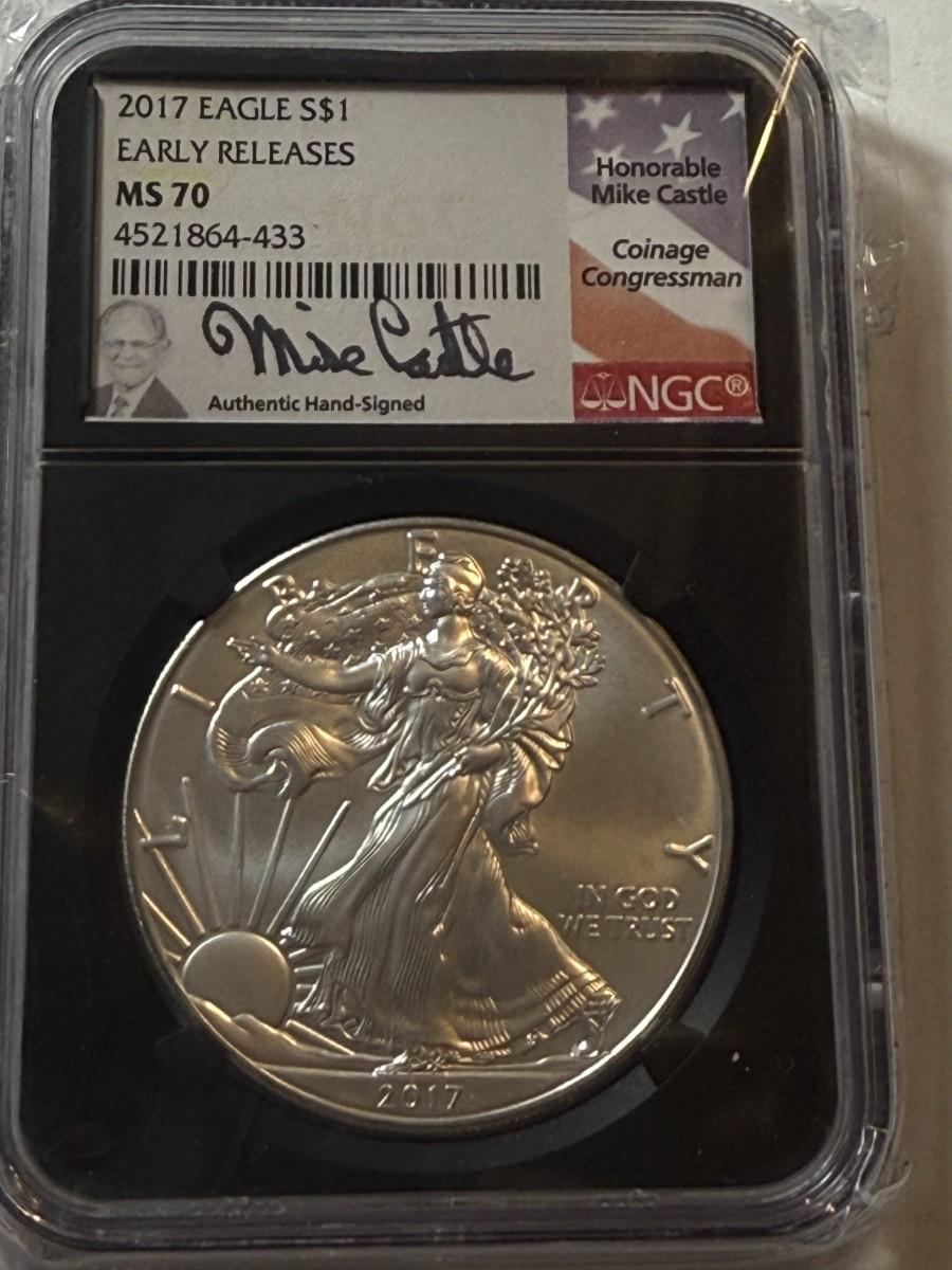 NGC CERTIFIED 2017 MS70 SILVER EAGLE DOLLAR 1-OUNCE COIN MIKE CASTLE SIGNED AS PICTURED. $5.00 DOMESTIC SHIPPING.