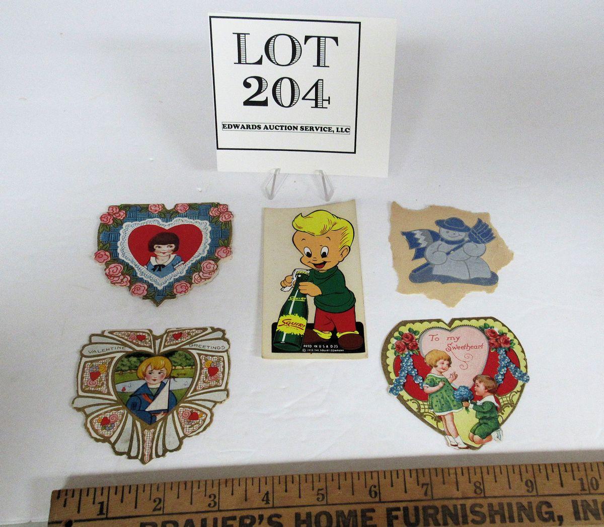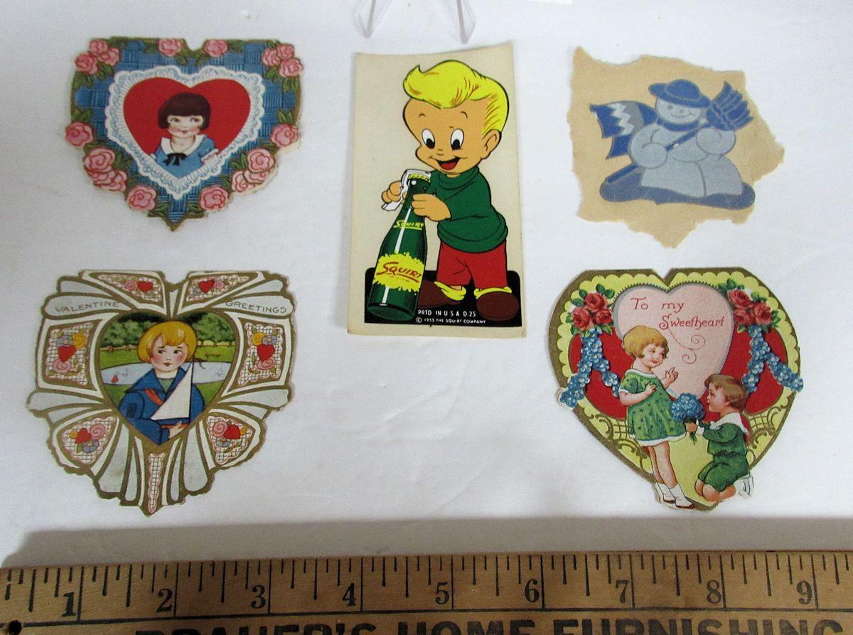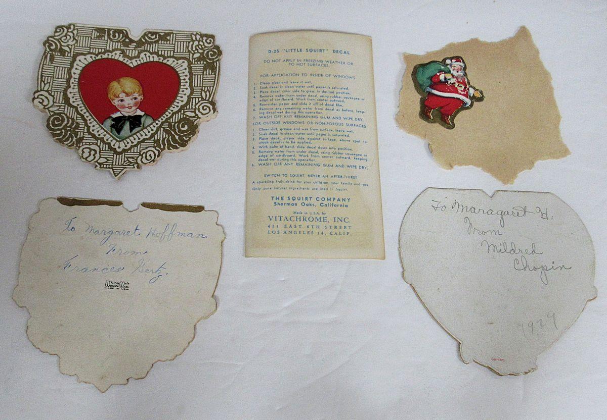 Nice Vintage Advertising Squirt Decal, 1953, Very Good Condition, and 3 Vintage Valentines, Paper Snowman
