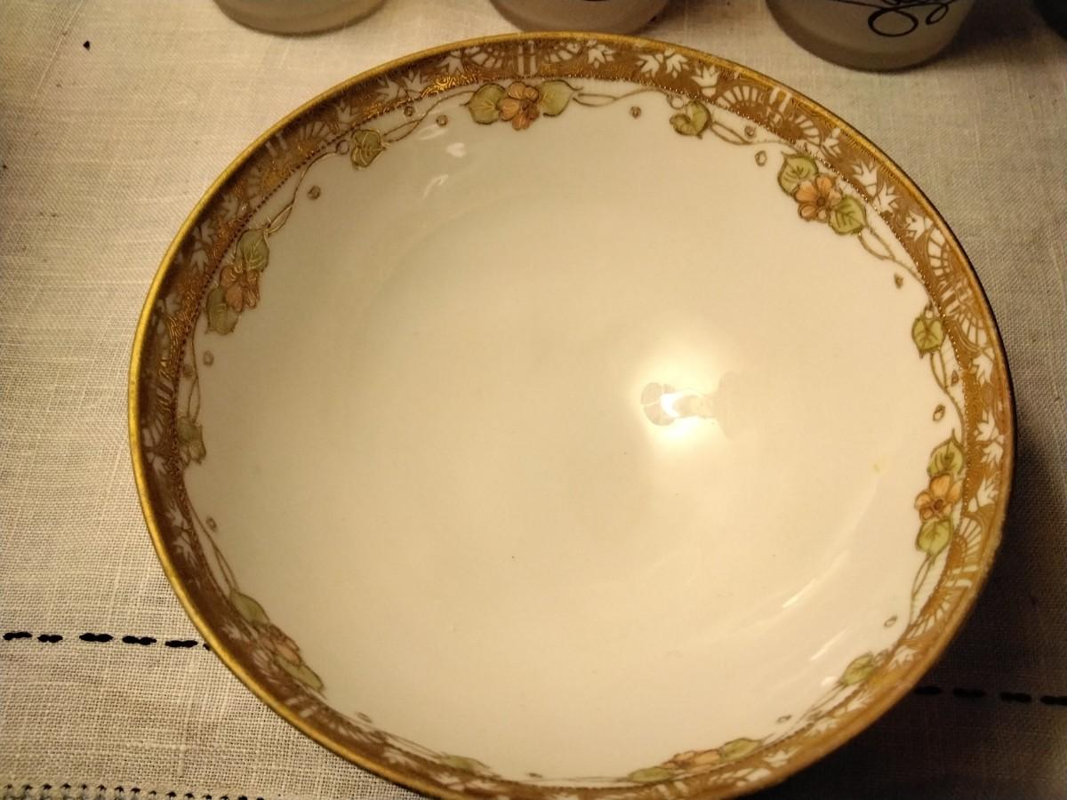 Nippon three footed bowls and saucers with stunning gold raised pattern. c. 1911 - 1921. Made in Japan Excellent condition. - no chips, cracks or crazing. Great collector's set. Makes a great gift for a special person! There is small areas of gold missing on a couple of the feet. Bowls 5.25"× 2.5" / saucers 6.25"
