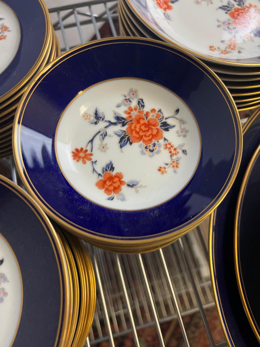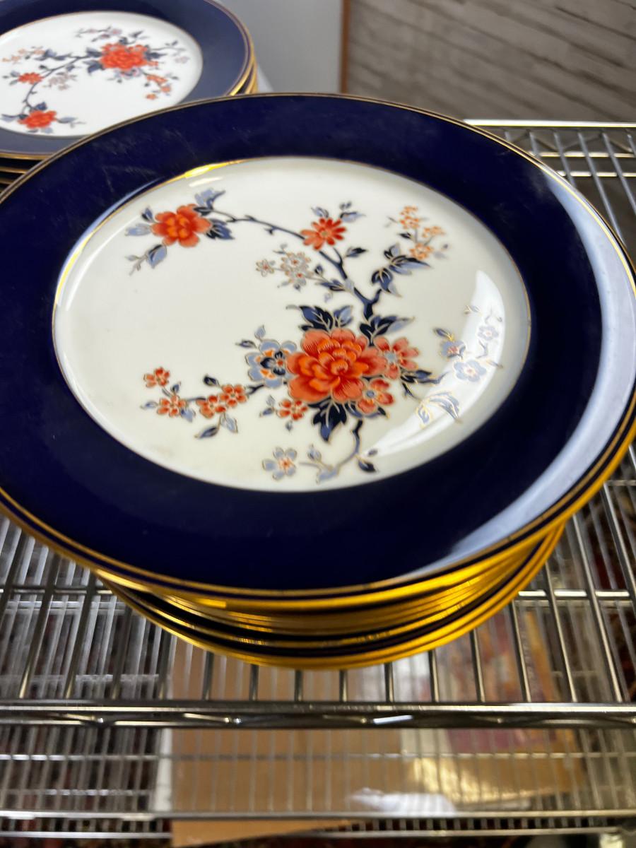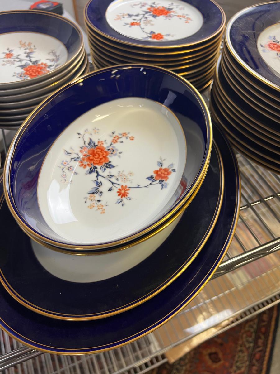 Services for 12 NO Cups, Some Bowls. Blue with Floral Design and Gold Rim. Pretty But not complete.