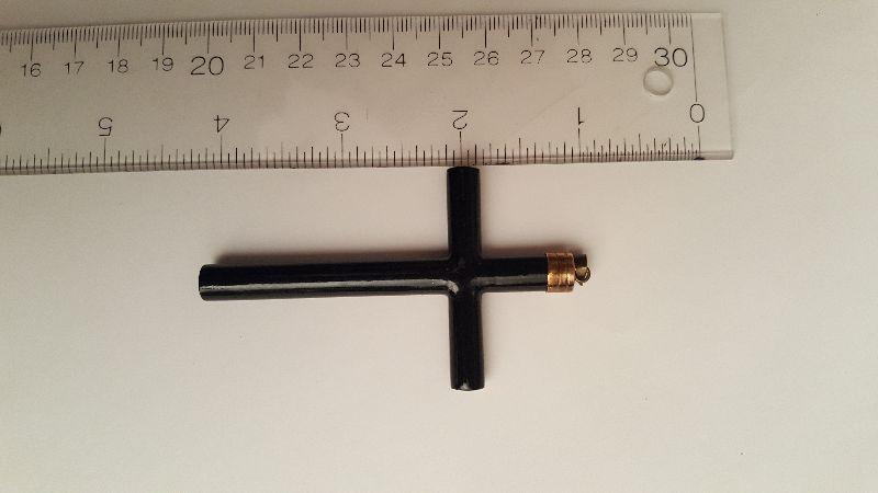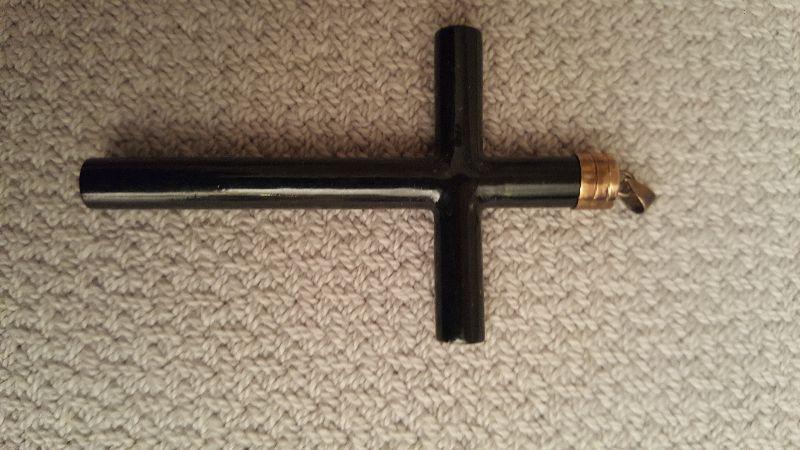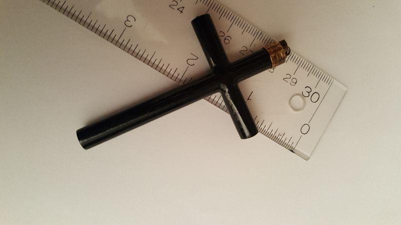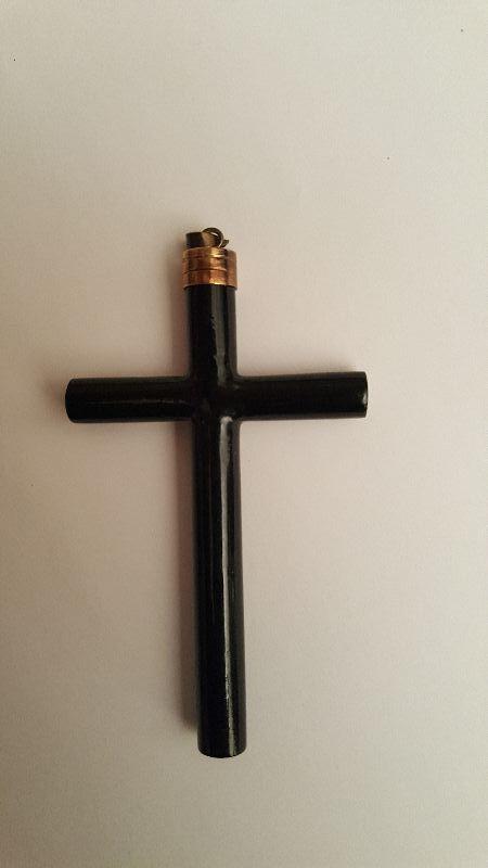 The lot is for a beautiful handcrafted Pendant Cross that appears to be made from obsidian - the volcanic lava rock. It measures about 3-inches tall X 1.5-inches wide. The top clasp metal could be gold but is not marked as such - the very top of the clasp is incised with the mark S.S - of which we have no knowledge. It is an unusual piece and one that would look great hanging from a nice chain. Donated by Kay Whitlock, IHA Member from Oklahoma.