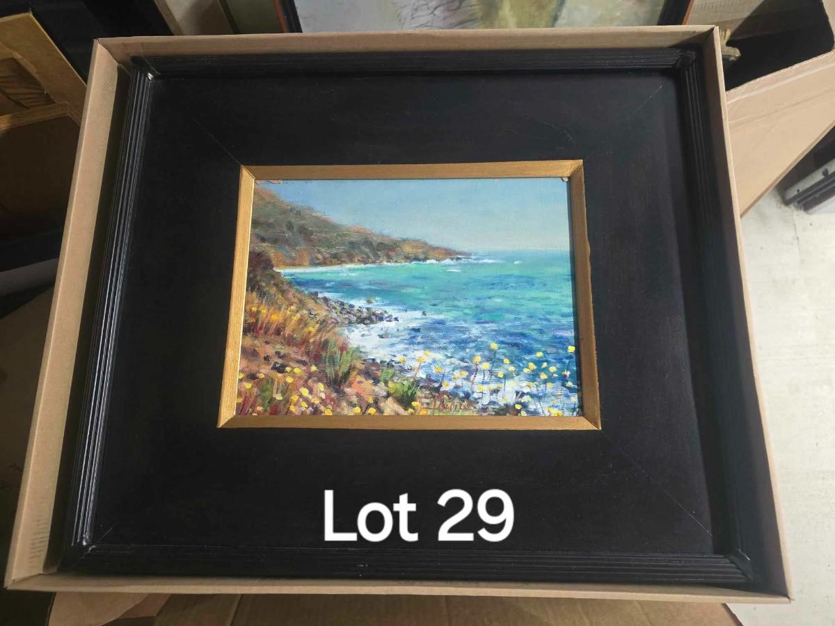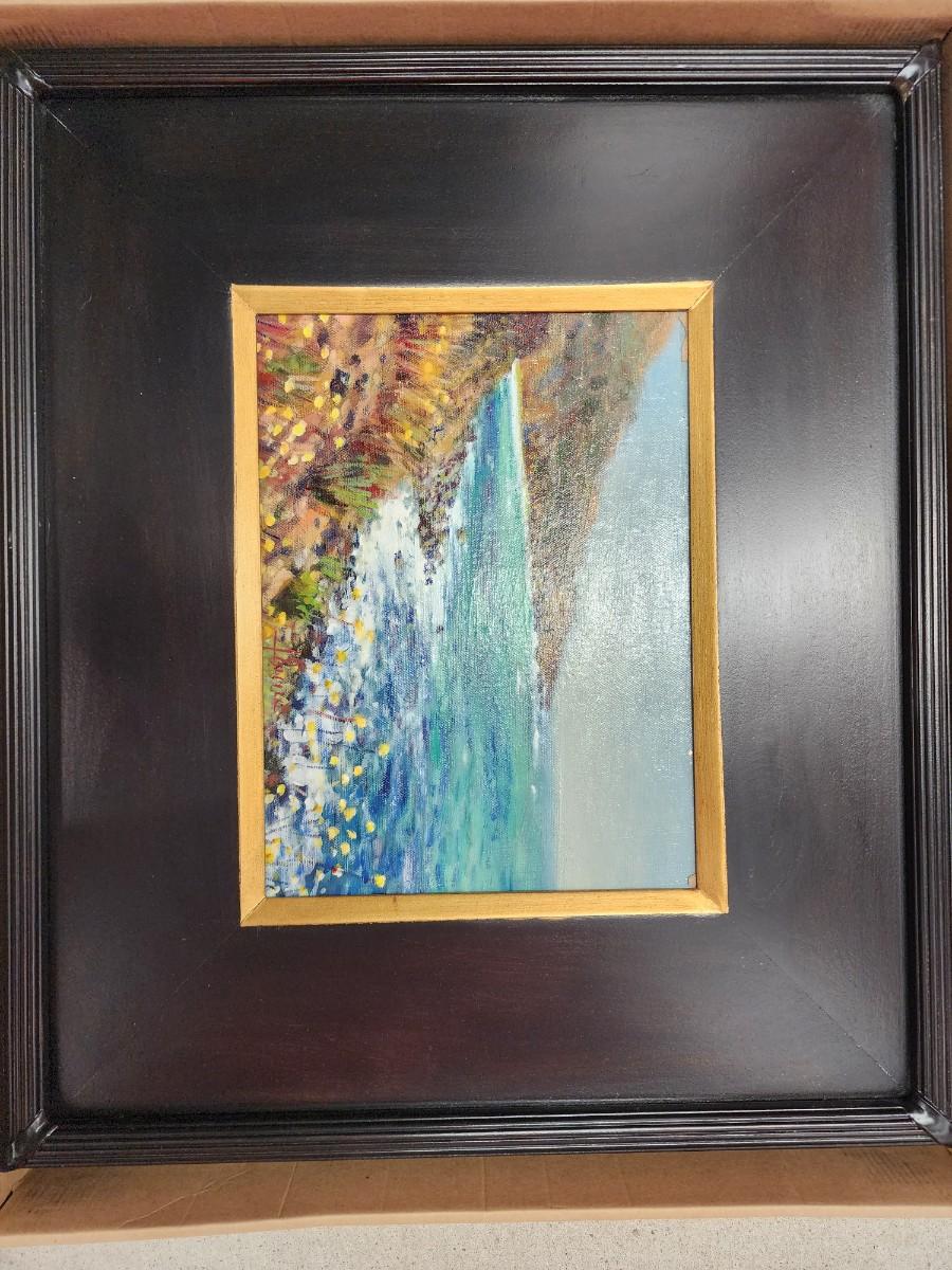 This ocean scene measures 21.5 by 18.5 in frame and weight 5 lbs. The art is 9 by 12 inches. Nicely matted, this piece will add to any decor. It is oil. 3