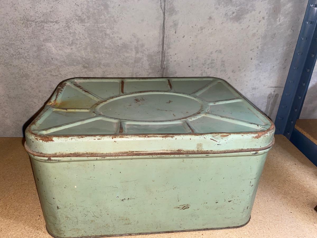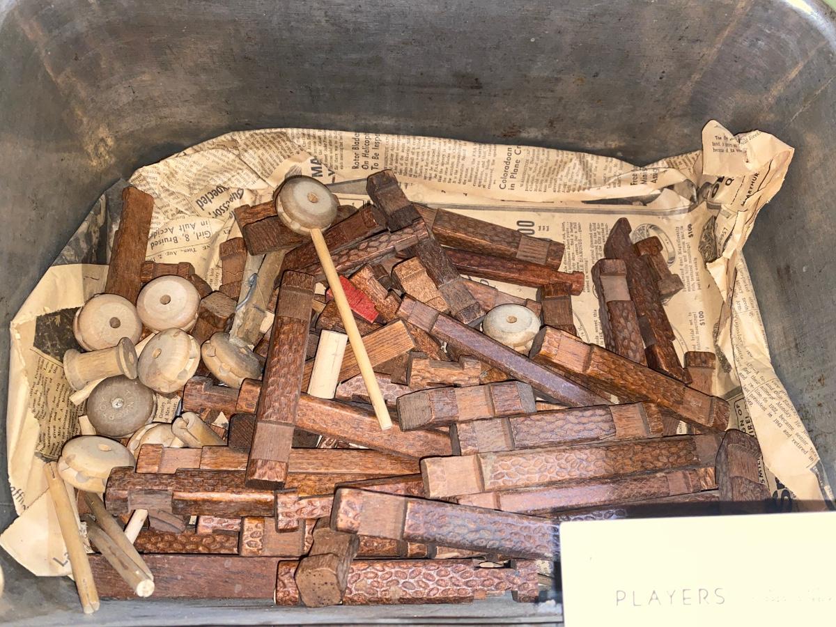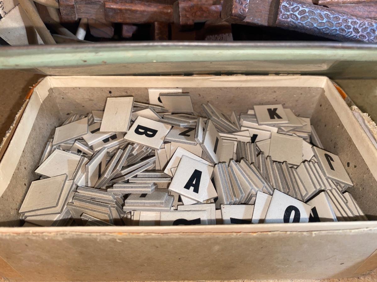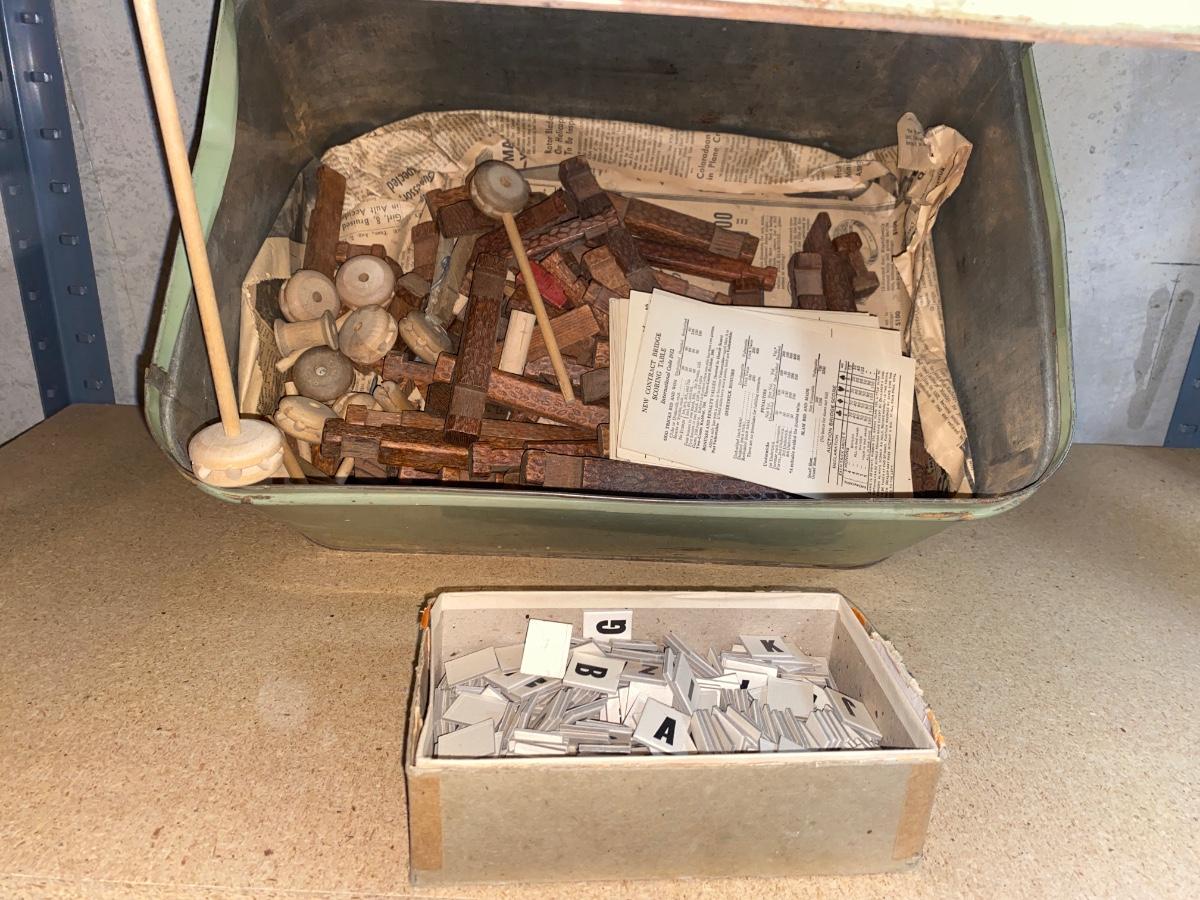 OLD LINCOLN LOGS, TINKER TOY PIECES, CARDBOARD LETTER TILES ALL IN A RETRO HINGED METAL BREAD BOX