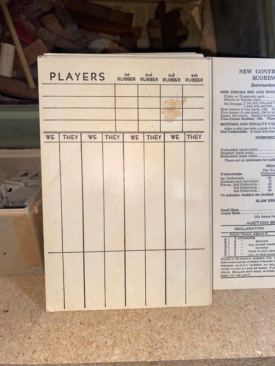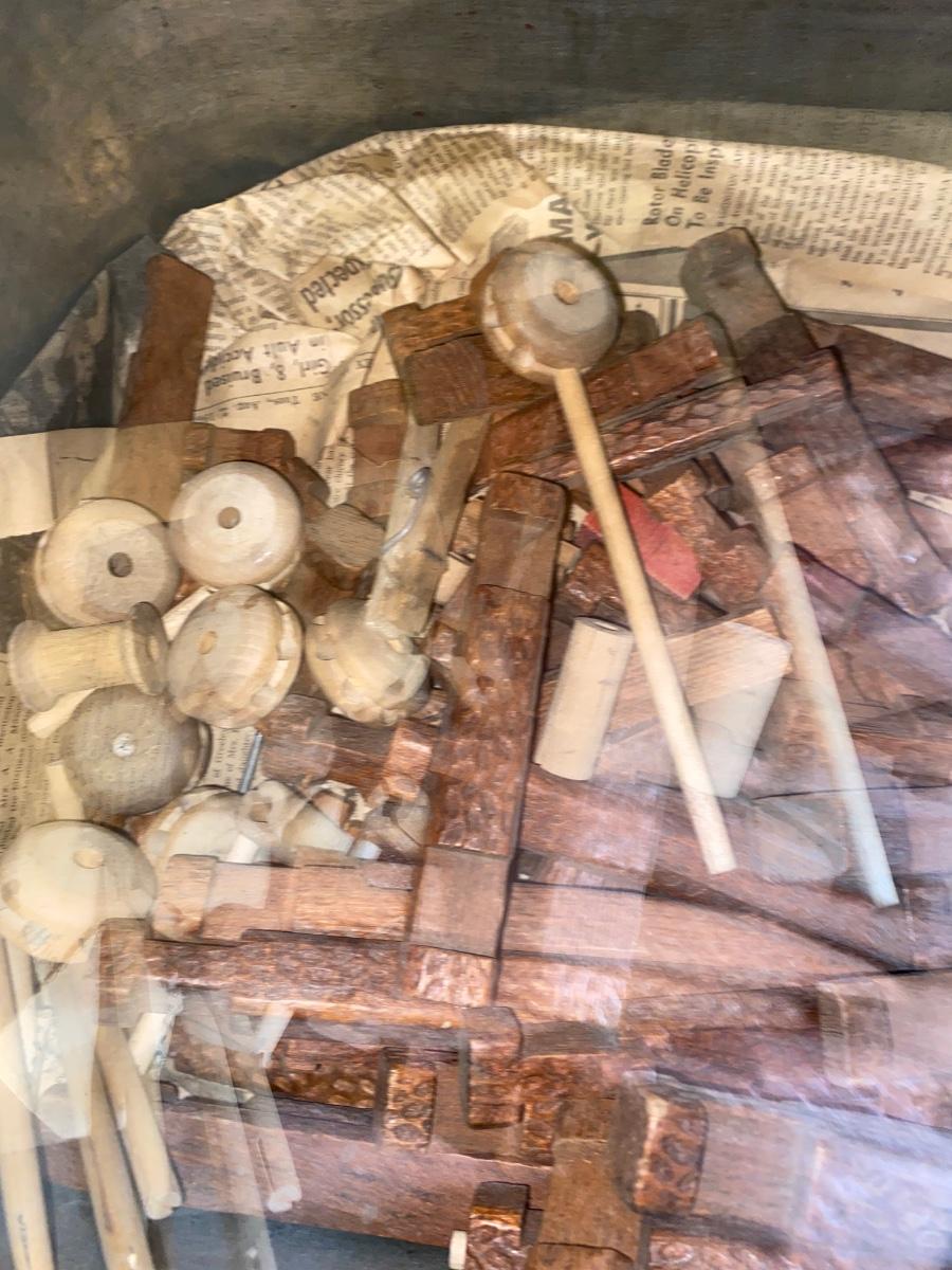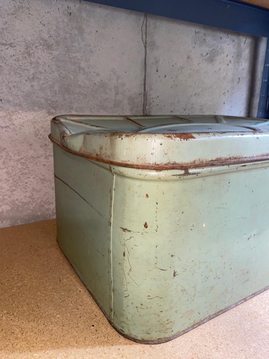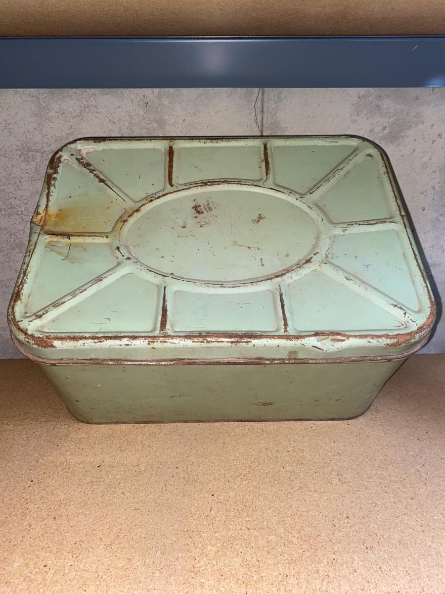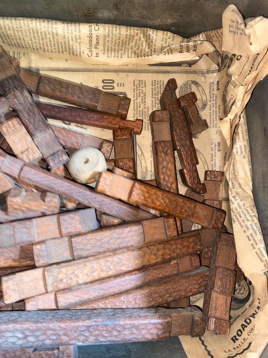OLD LINCOLN LOGS, TINKER TOY PIECES, CARDBOARD LETTER TILES ALL IN A RETRO HINGED METAL BREAD BOX