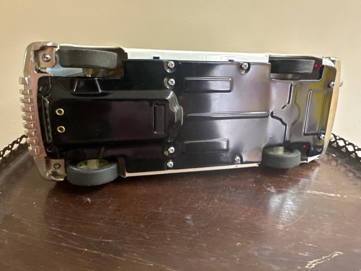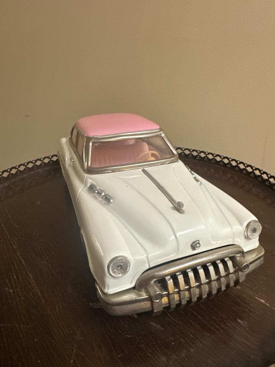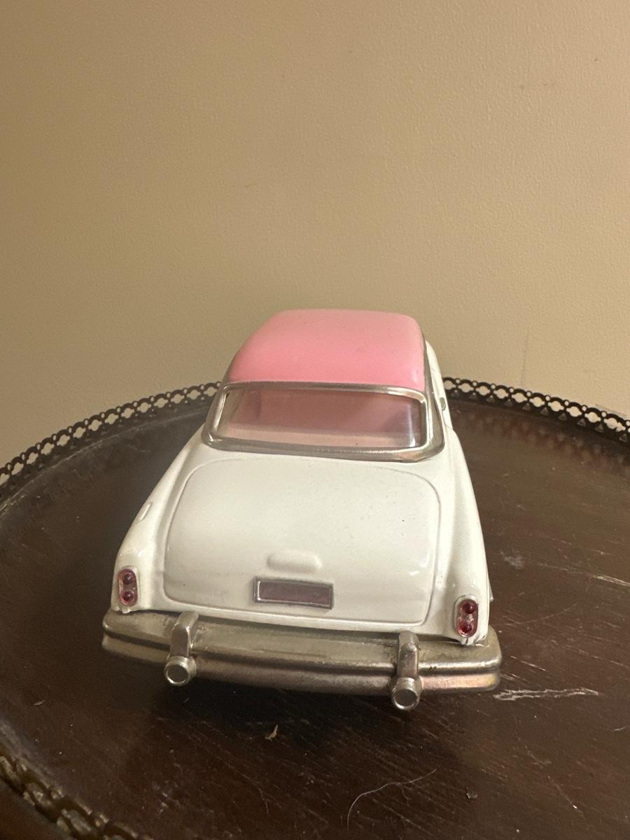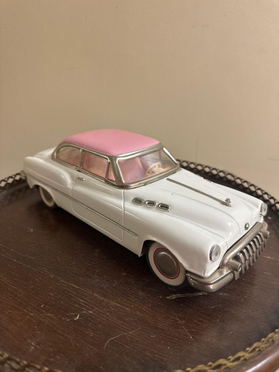 Old toy car Vintage Tin Friction Oldsmobile Promo car with pink roof/white body