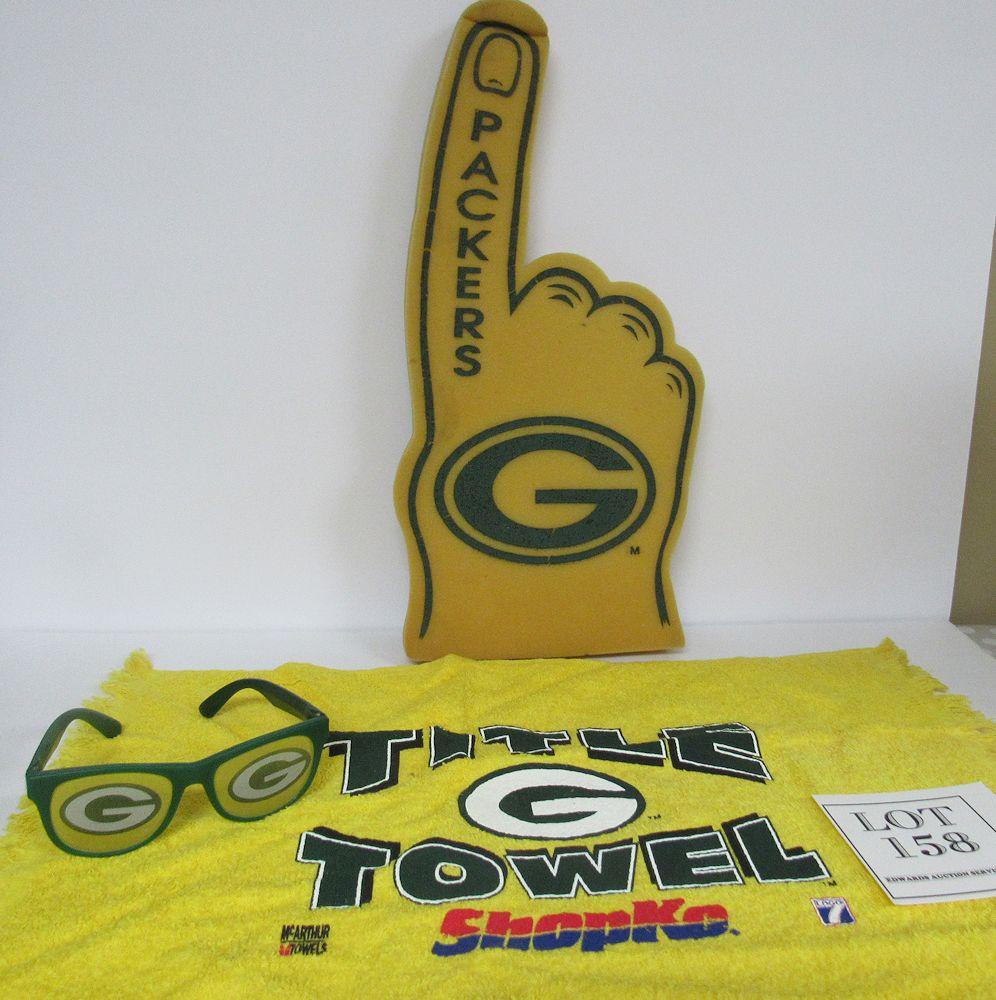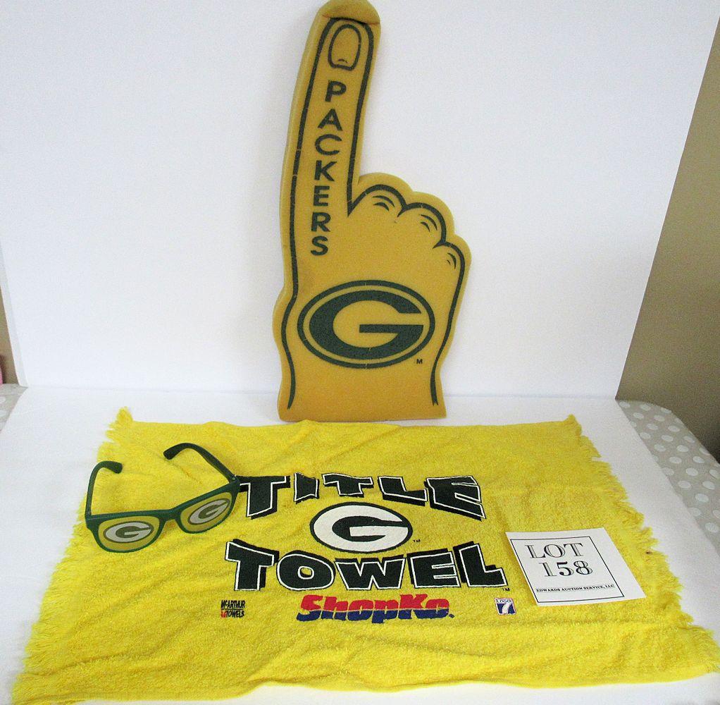 Older Packers Collectibles: Foam Hand, Plastic Glasses, Towel