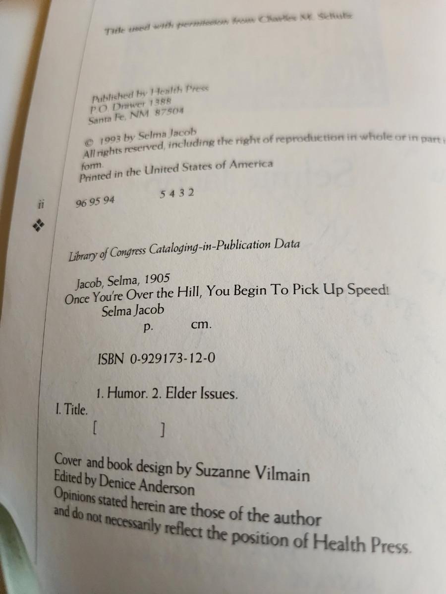This small soft cover booklet is by a Louisville, Kentucky octogenarian. Once You're Over The Hill, You Begin To Pick Up Speed by Selma Jacob is about understanding the simple truths and enjoying life. The book is in fair condition with some minor dusty spots. Autographed by the author. Health Press, 1993, 86 pages