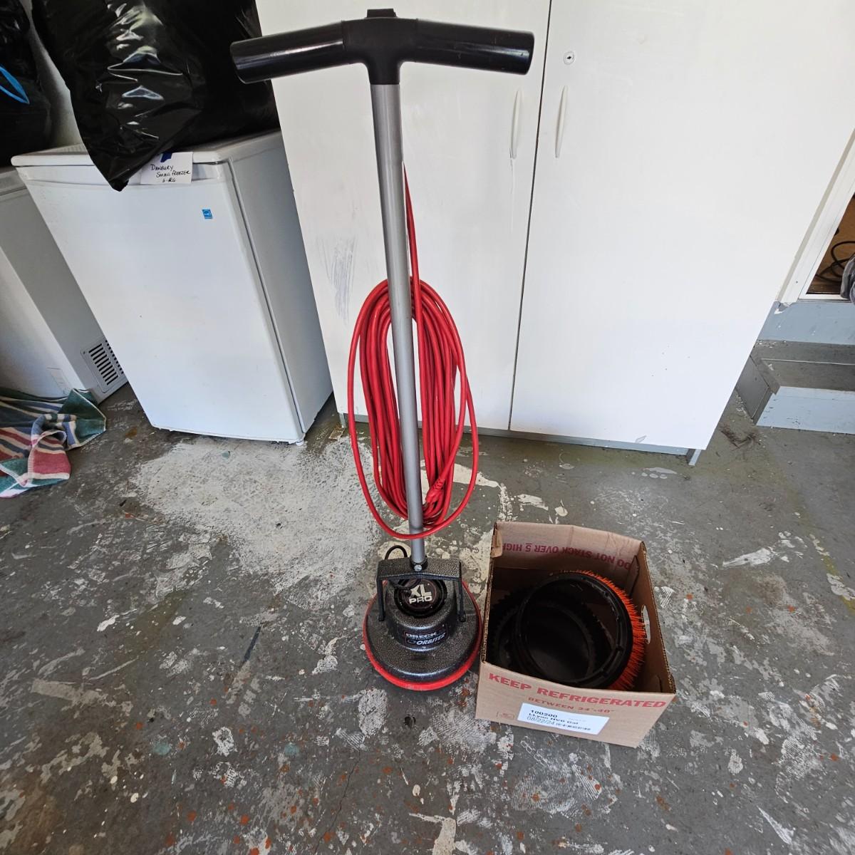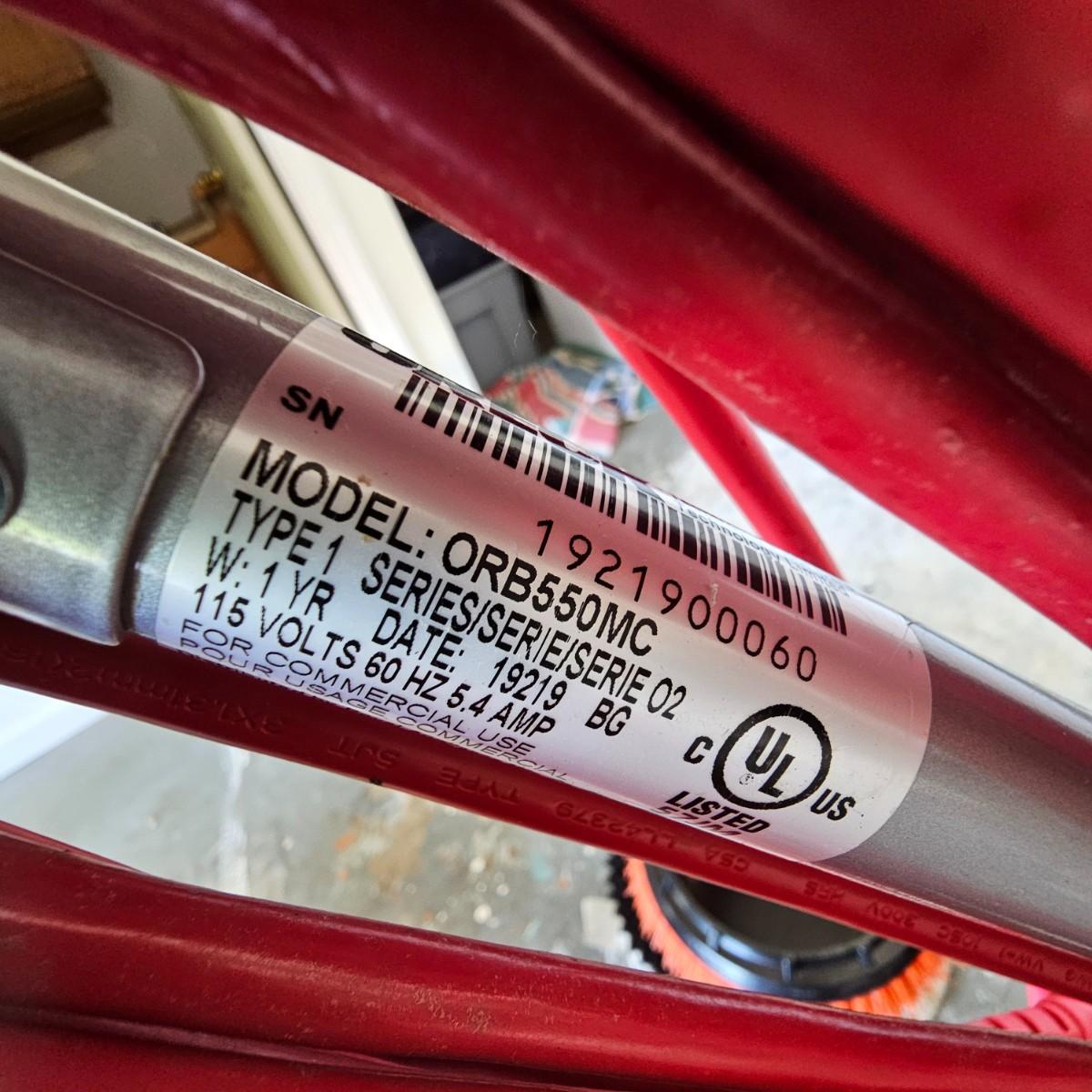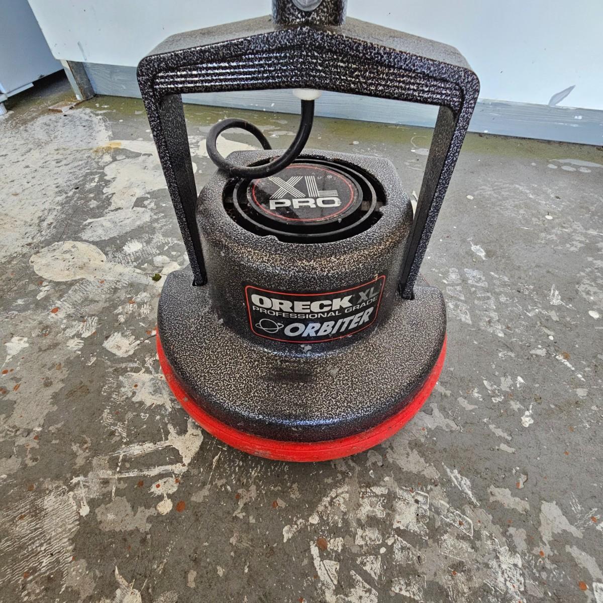 Orbiter model of Oreck XL Pro floor unit. Used for cleaning and polishing floors, unit has tilt handle and on/off switch at top. Measures 10" x 11" x 43"H, comes with two brushes and a soft rag disc. Unit powered on when plugged in. See photos for details. Local pickup only.